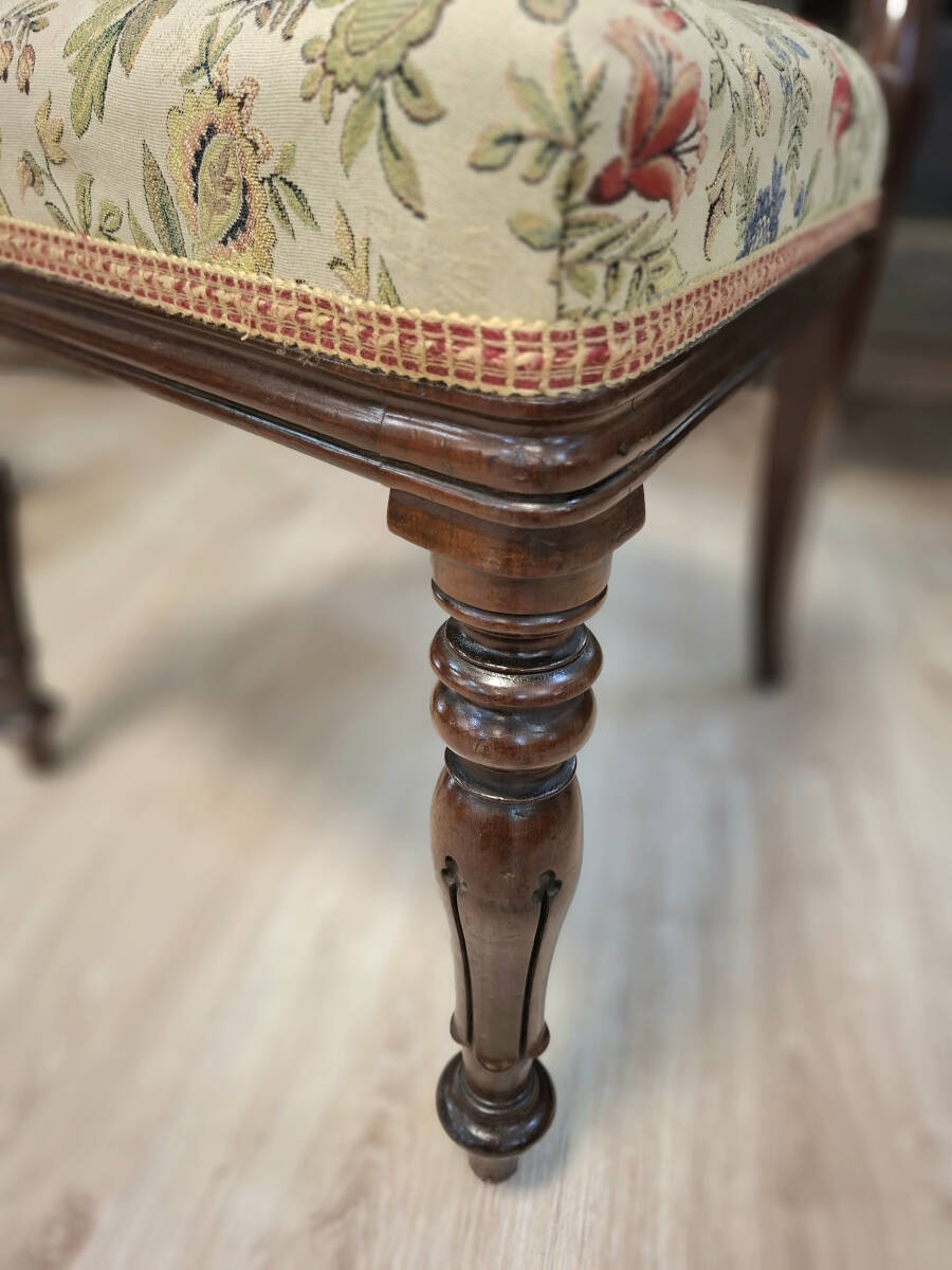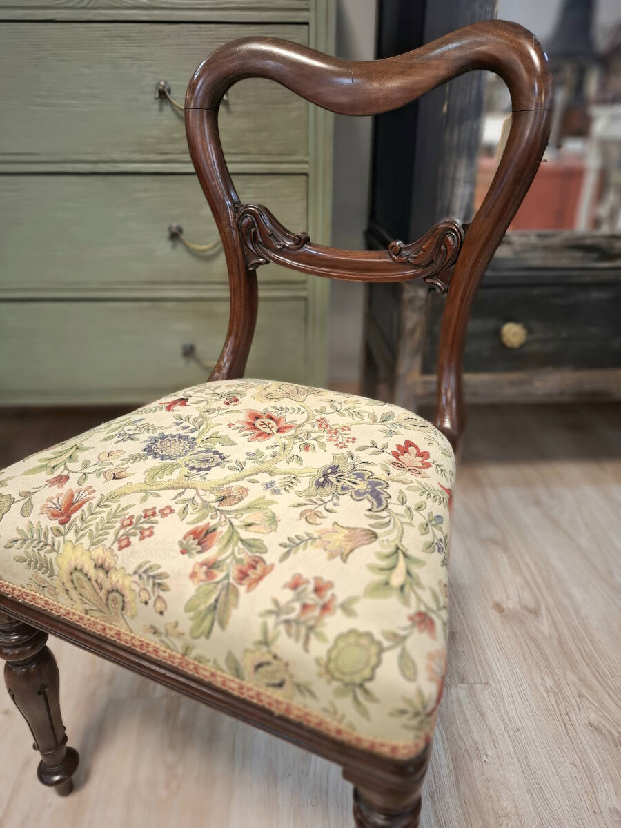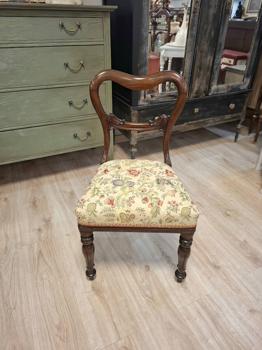 Elegante silla victoriana de caoba tallada, con un respaldo curvado de estilo clásico y patas torneadas. Conserva su tapizado original con un delicado motivo floral, lleno de color y encanto tradicional. Una pieza única ideal para espacios con carácter, decoración vintage o ambientes refinados.