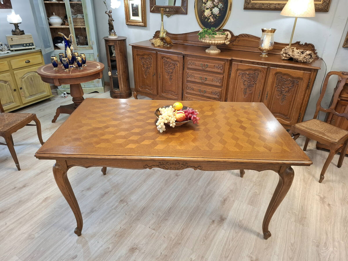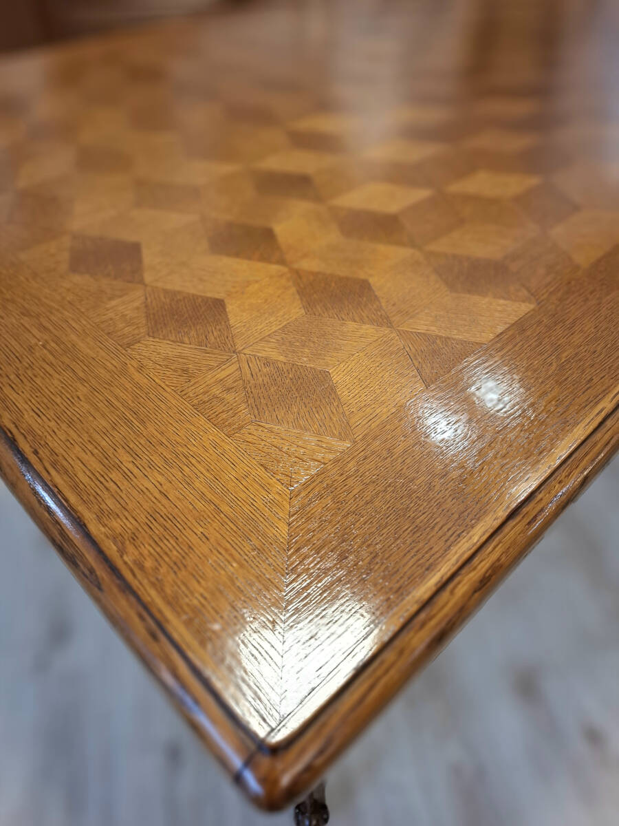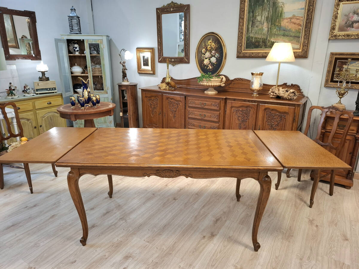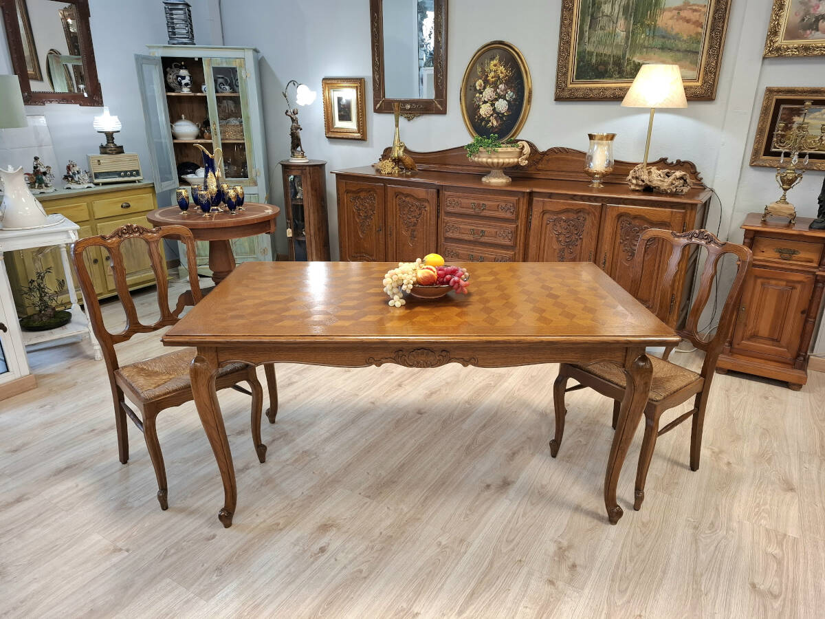 Mesa de comedor francesa de estilo Luís XV, elaborada en sólida madera de roble. Presenta un refinado tablero con taracea decorativa, que realza el tono cálido y natural de la madera. Se sostiene sobre cuatro patas cabriolé, de líneas curvas y armoniosas, que aportan ligereza visual y acentúan su carácter clásico y sofisticado.