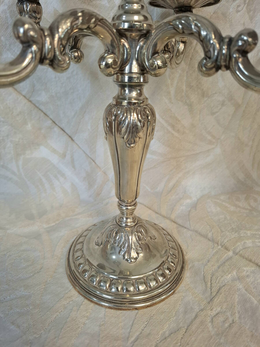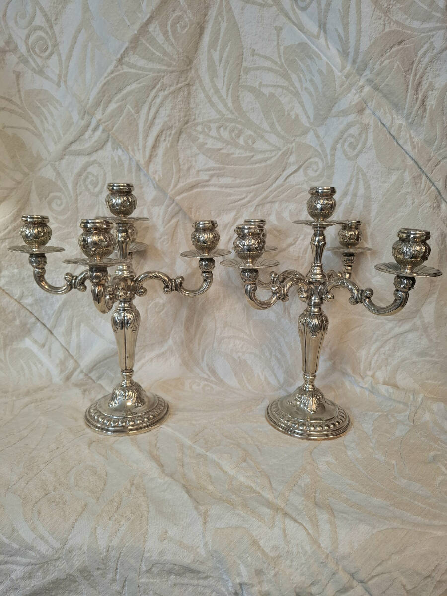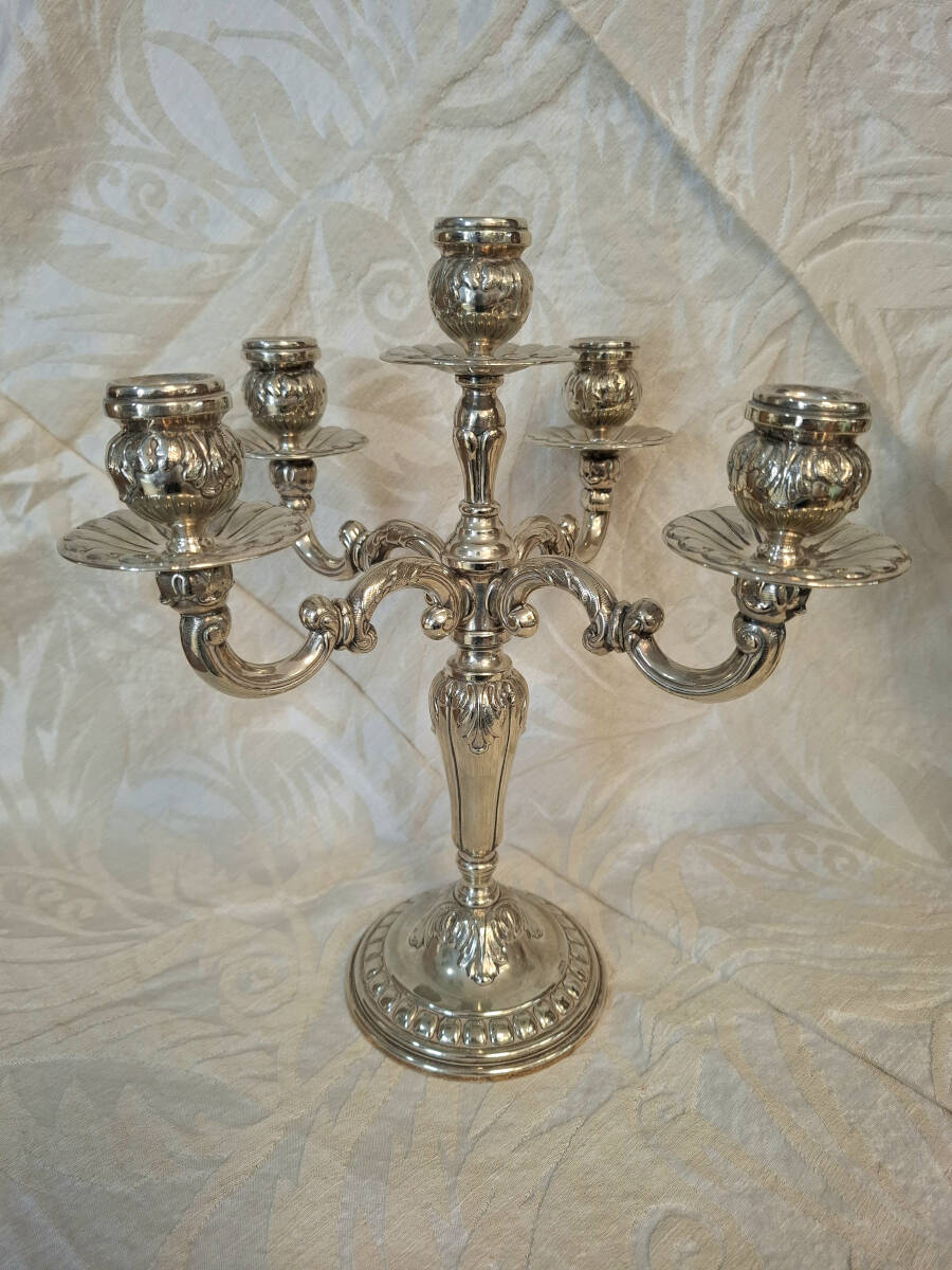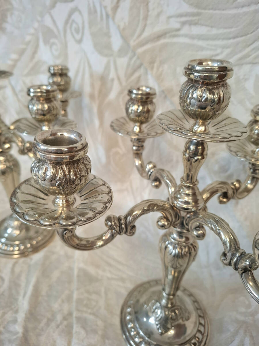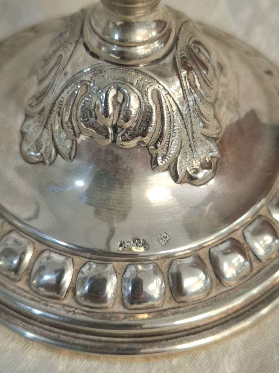 Antigua pareja de candelabros de cinco luces, realizados en alpaca plateada punzonada S.XX, con decoración gallonada. Estos preciosos candelabros se encuentran en perfecto estado de conservación. Ideal para añadir un toque de belleza y elegancia a cualquier espacio.