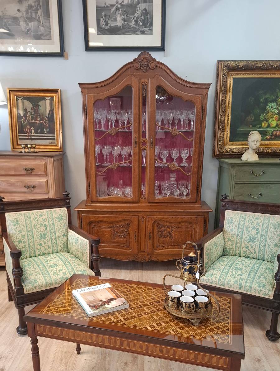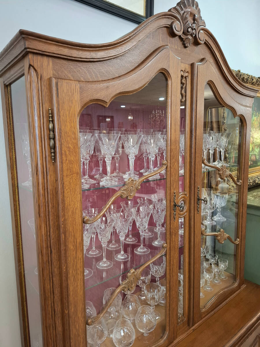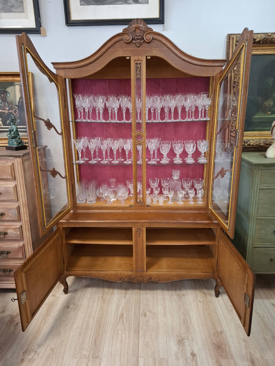 El cuerpo superior cuenta con dos puertas acristaladas que permiten exhibir su contenido, decoradas con molduras curvas y herrajes metálicos. El interior, revestido en tela de Moiré de tono burdeos, realza las piezas decorativas que alberga. En la parte inferior, dispone de un aparador con dos puertas talladas, ofreciendo un práctico espacio de almacenaje.