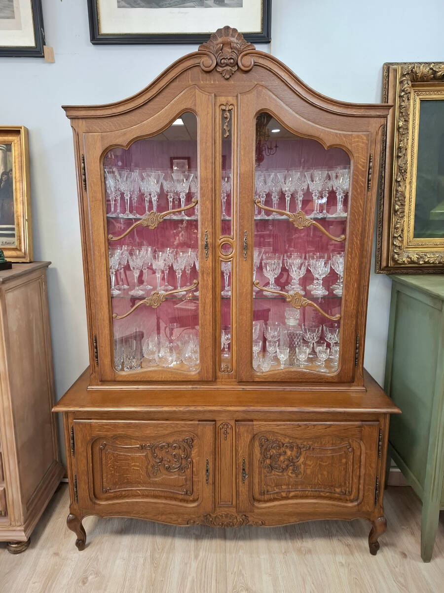 Elegante vitrina francesa realizada en madera maciza de roble, inspirada en el refinado estilo Luís XV. Presenta un delicado copete tallado con motivos vegetales y líneas sinuosas, característicos del gusto rococó francés.