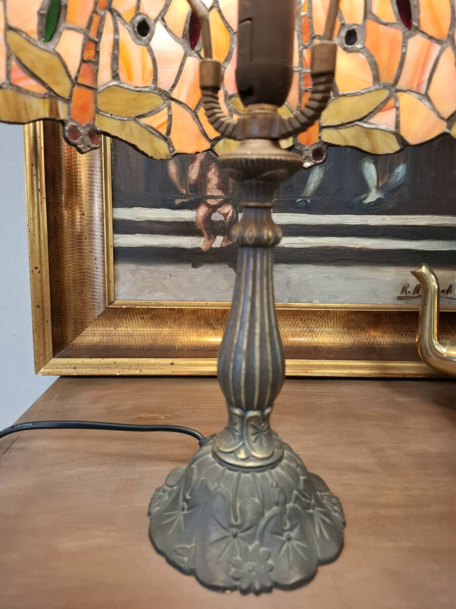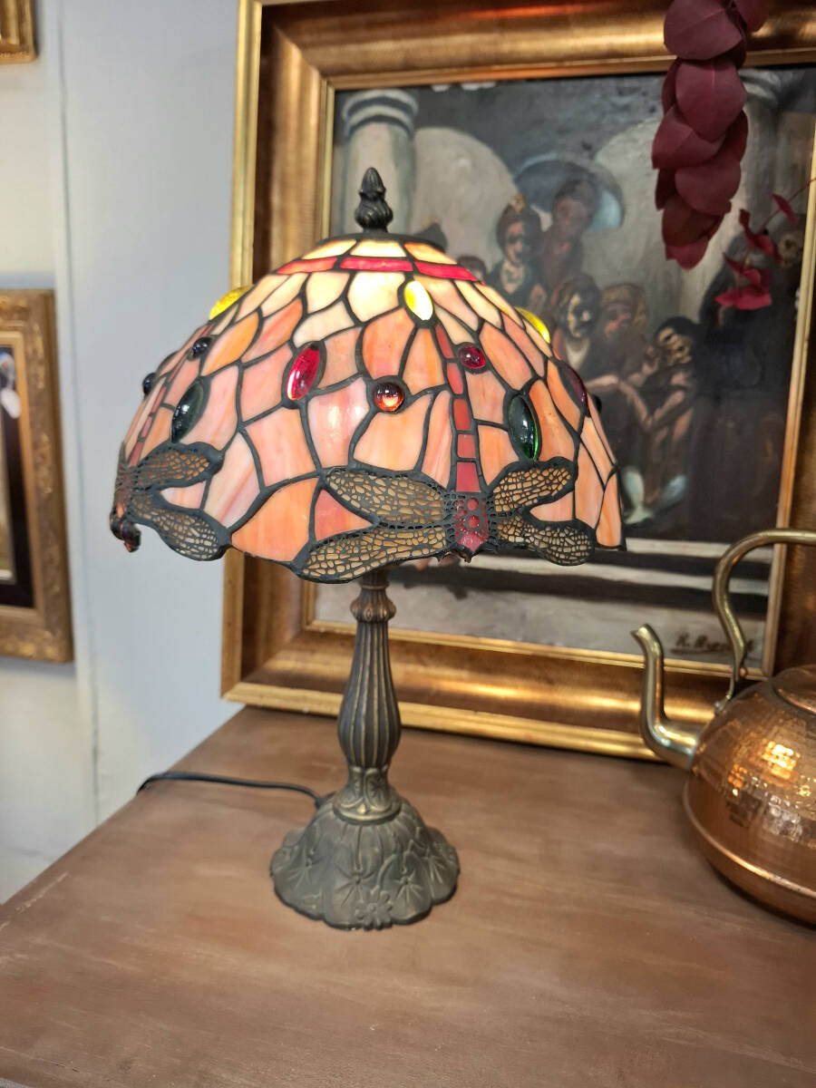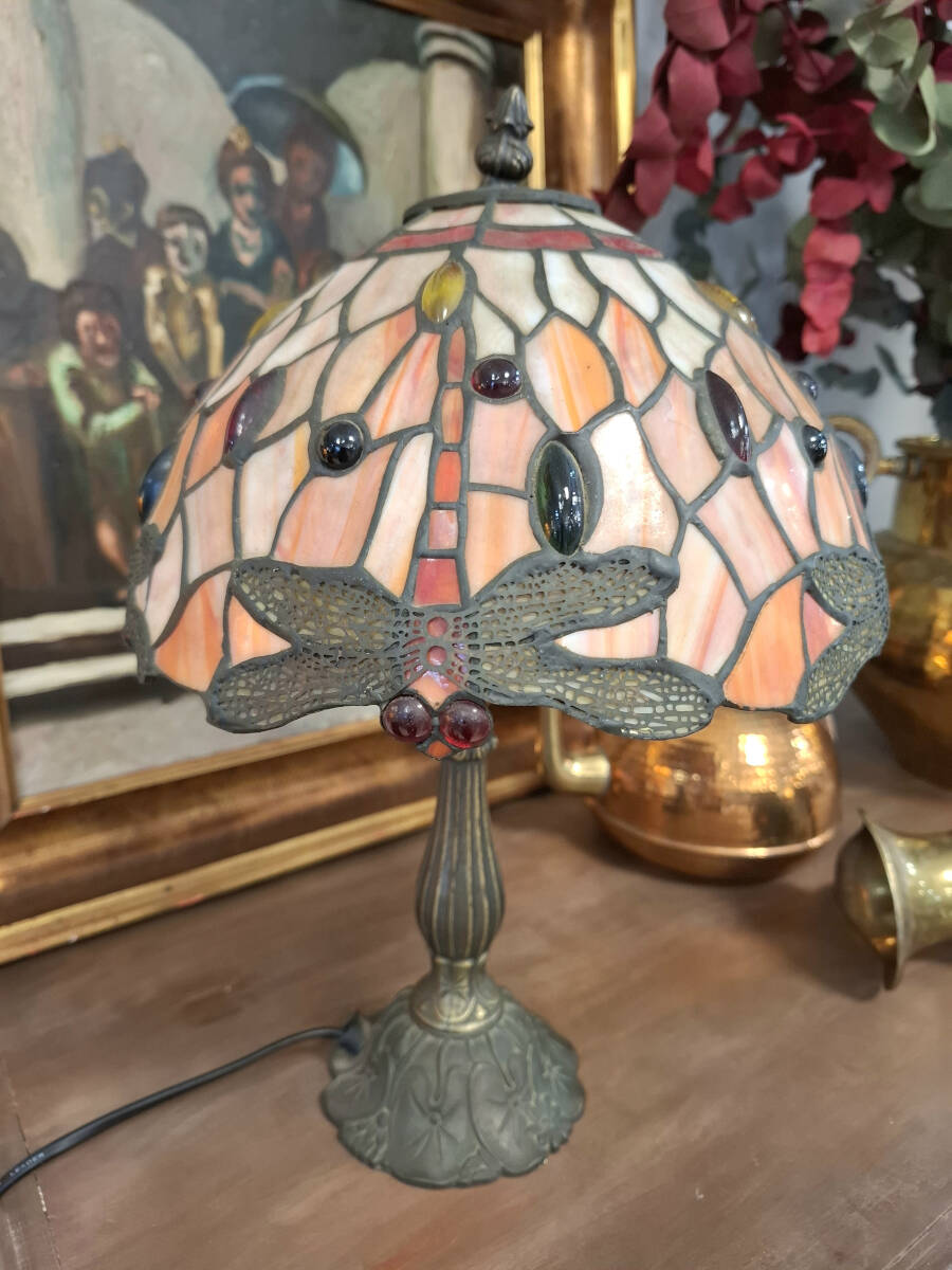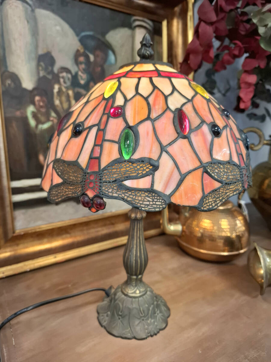 Exquisita lámpara de mesa inspirada en los diseños icónicos de Louis Confort Tiffany. Pantalla de cristal emplomado en tonos salmón, rojizo y crema, decorada con el emblemático motivo libélulas. Los cuerpos de las libélulas y las cuentas de cristal insertadas en colores rojo y verde crean un efecto joya cuando la lámpara está encendida. El pie está fabricado en bronce con pátina envejecida, presentando un fuste acanalado y una base floral que garantiza estabilidad y un aire vintage.