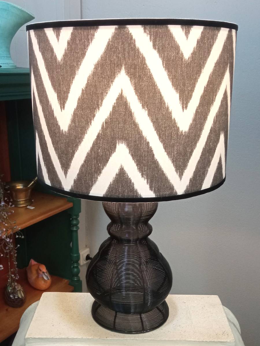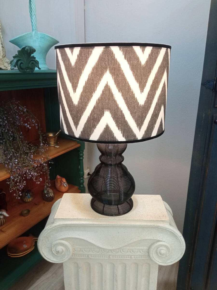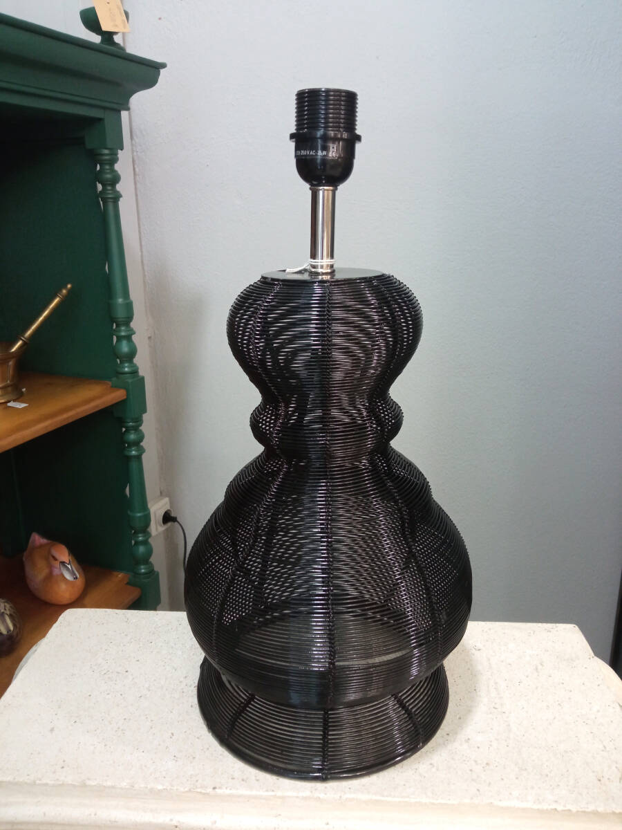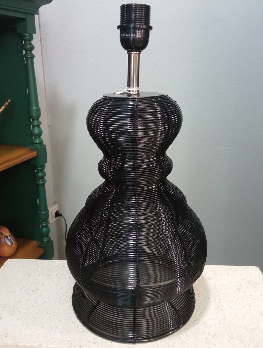 Original lámpara de sobremesa cónica fabricada con alambre negro. De singular diseño y estilo moderno, quedará perfecta en cualquier rincón de tu hogar o negocio. Pantalla no incluida.