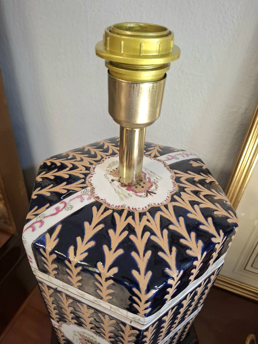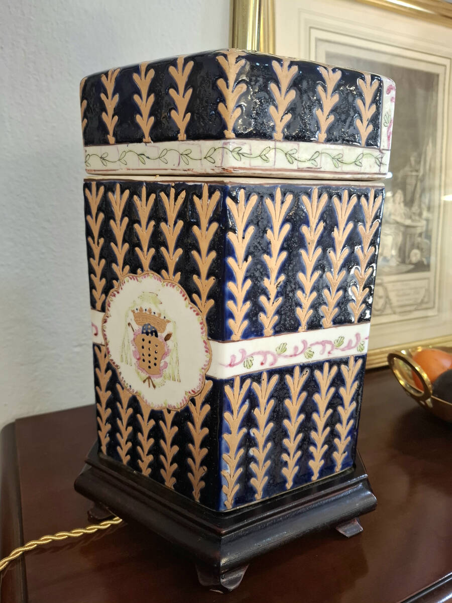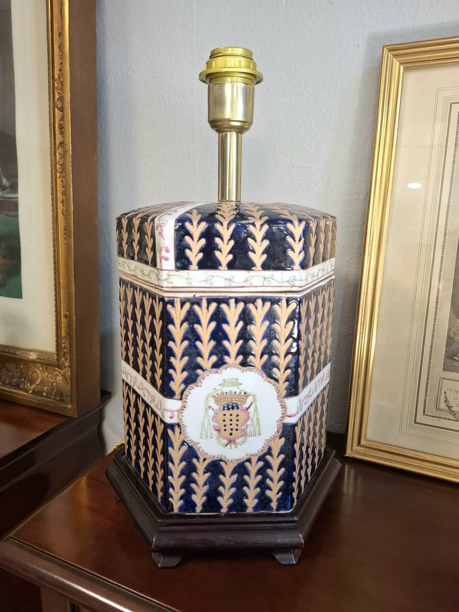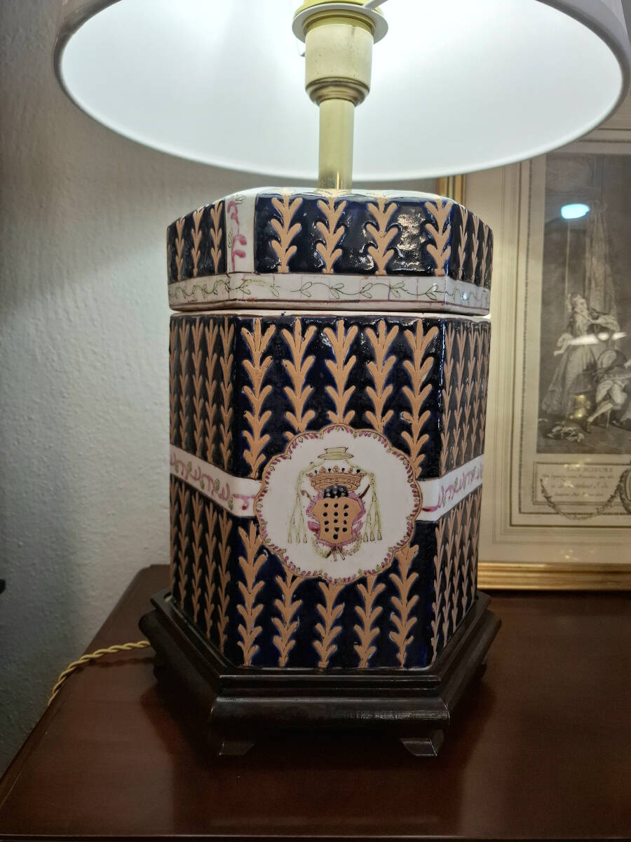 Magnífica lámpara de sobremesa de alta época, realizada a partir de un antiguo caddy de té hexagonal de cerámica esmaltada. La pieza es un exponente excepcional del gusto por la cerámica y la heráldica aristocrática de finales del siglo XIX.