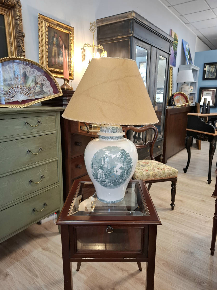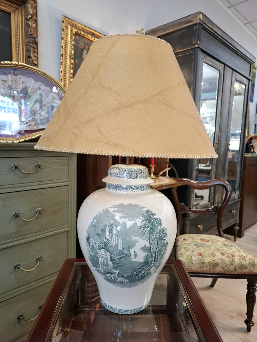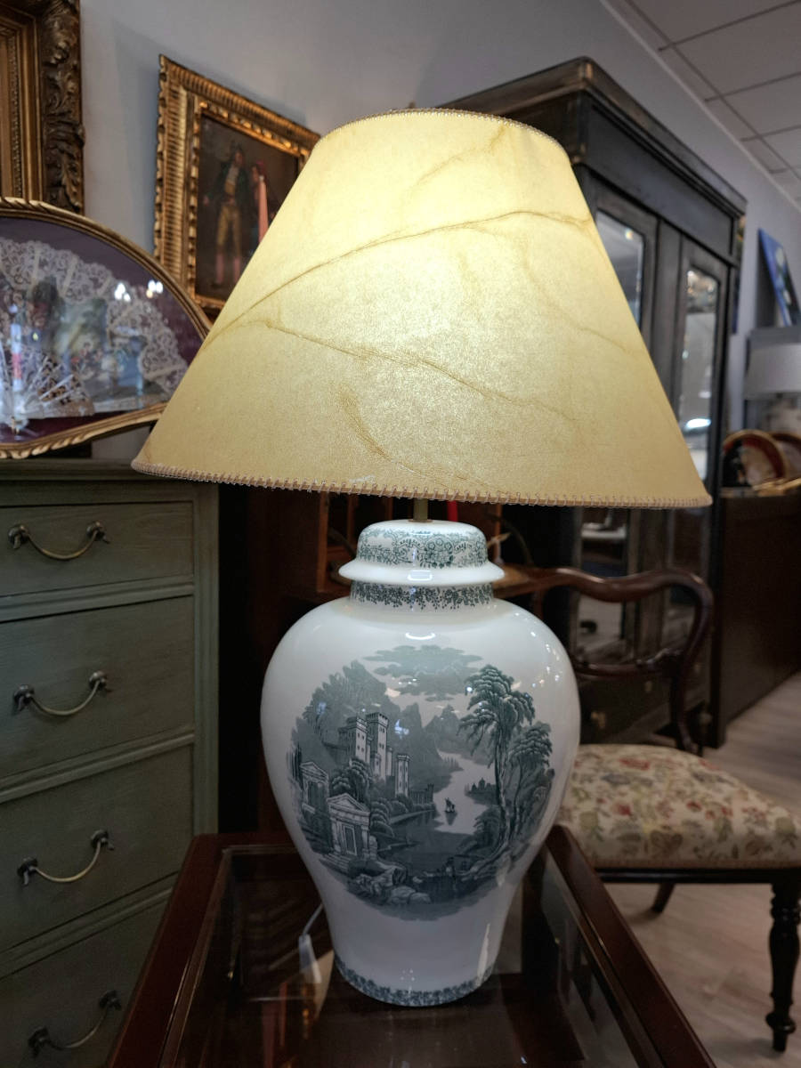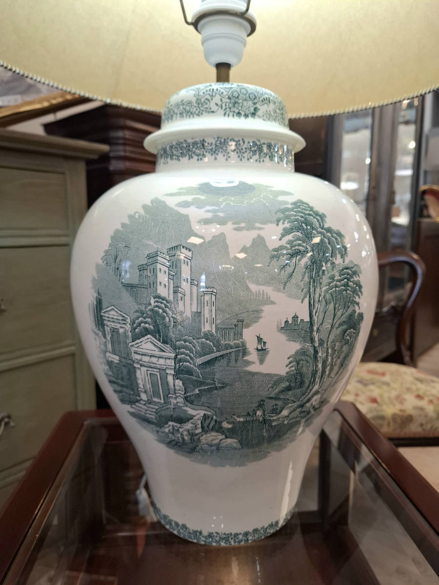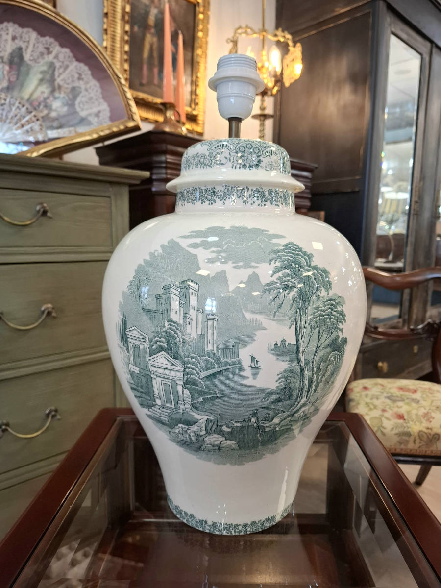 Magnífica lámpara de sobremesa realizada a partir de una pieza cerámica original de la prestigiosa fábrica La Cartuja de Sevilla - Pickman. Esta pieza destaca por su elegante diseño de inspiración clásica y su impecable acabado en color verde, uno de los tonos más emblemáticos de la firma sevillana de la serie “VISTAS”, con paisajes románticos, arquitecturas clásicas y motivos vegetales.