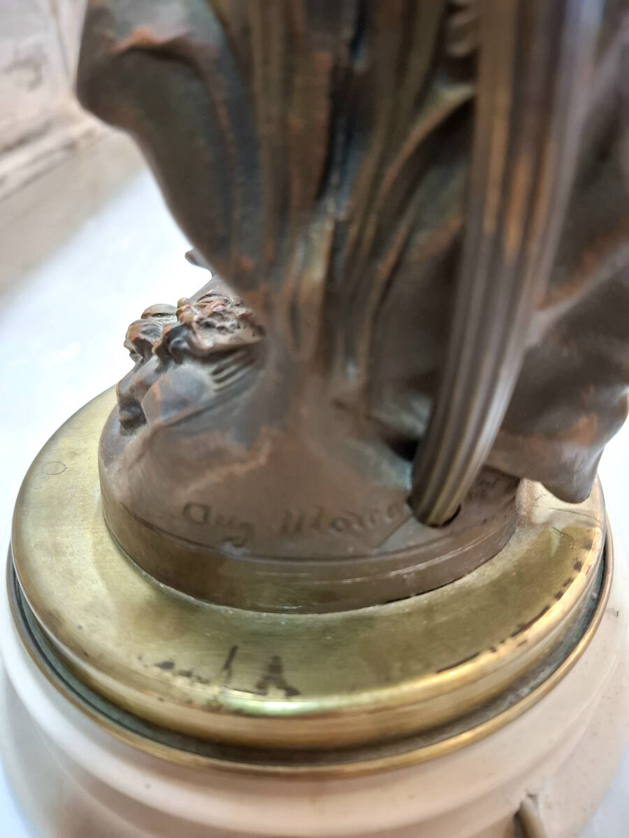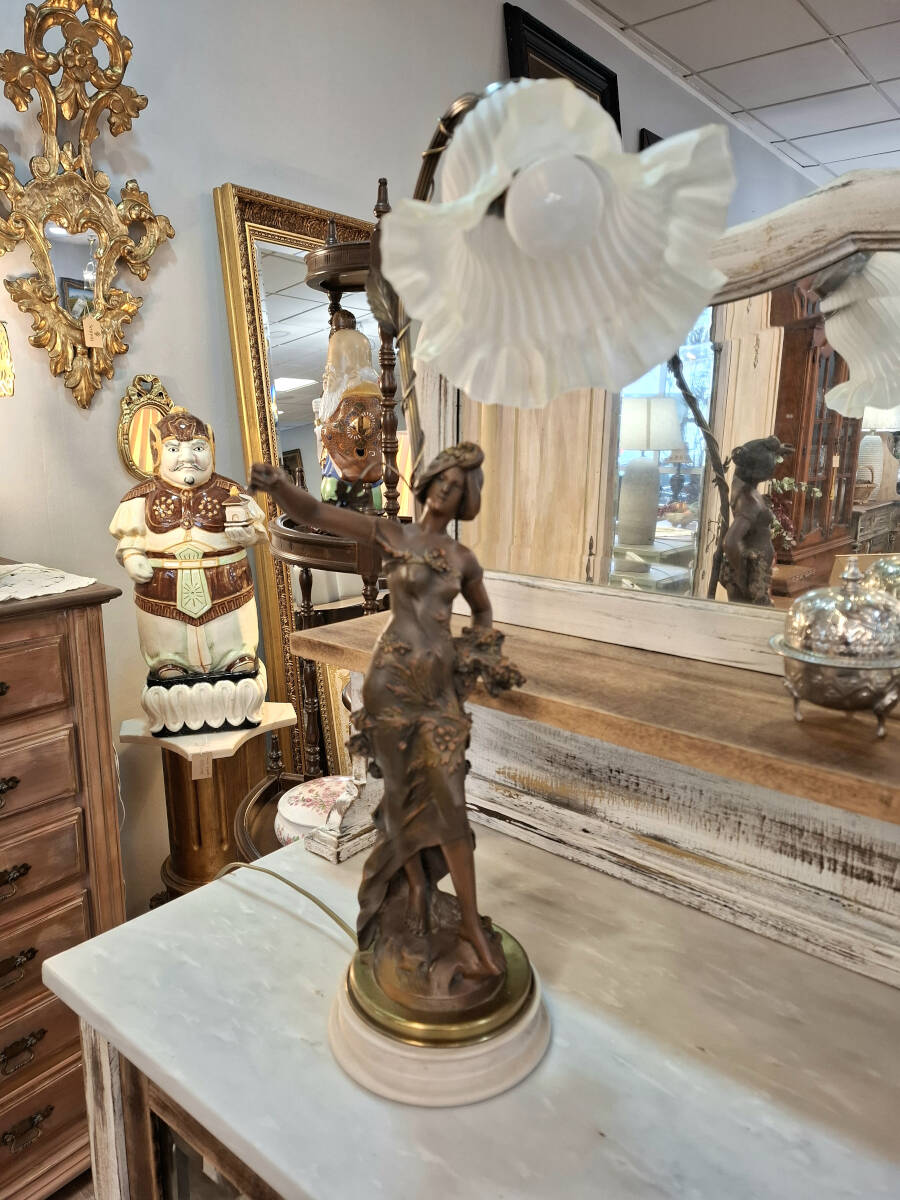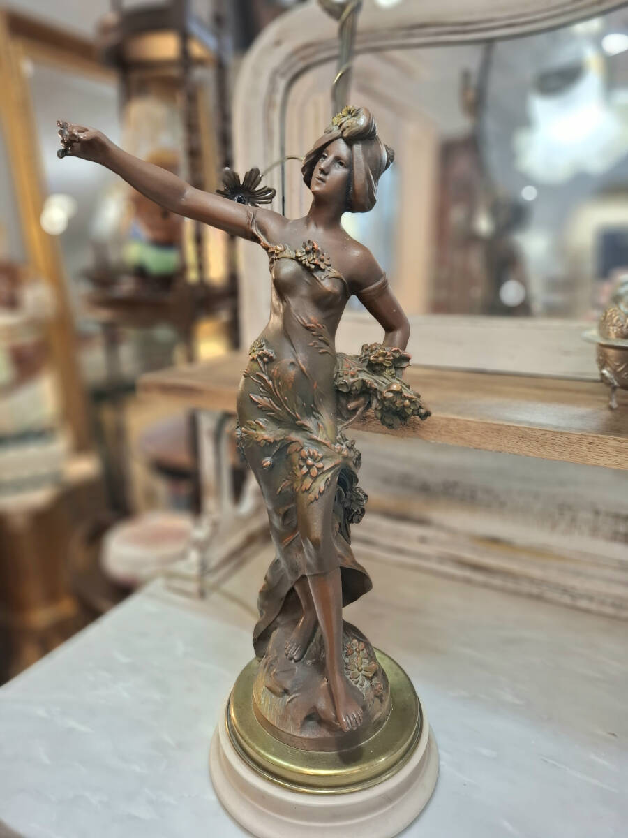 Preciosa lámpara de mesa con escultura de mujer en metal, que captura la elegancia y el detalle artístico. La pieza se sostiene sobre una base blanca que contrasta con la figura. Ideal para quienes buscan una pieza única que combine arte y funcionalidad en su decoración. Firma de la pieza en parte trasera. Excelente estado de conservación.
