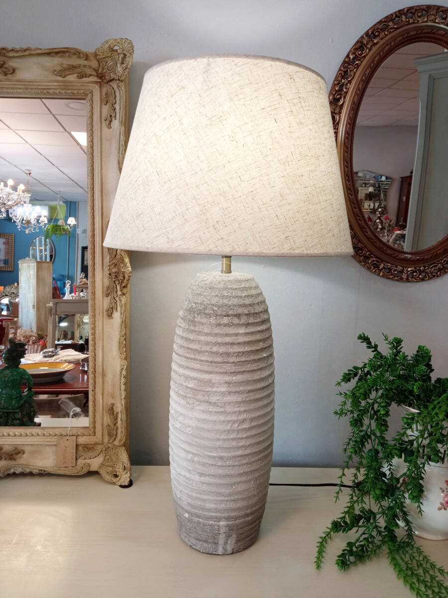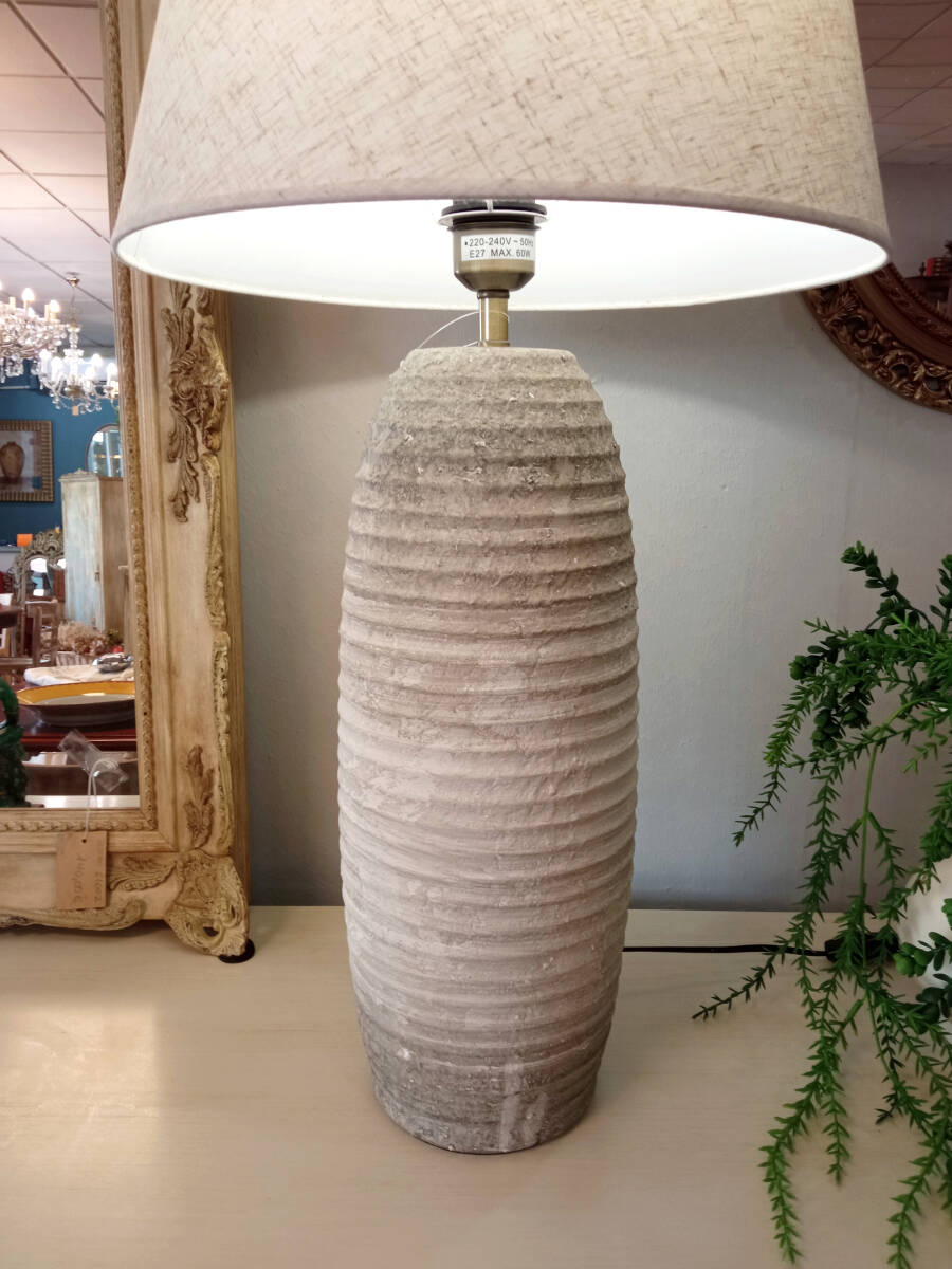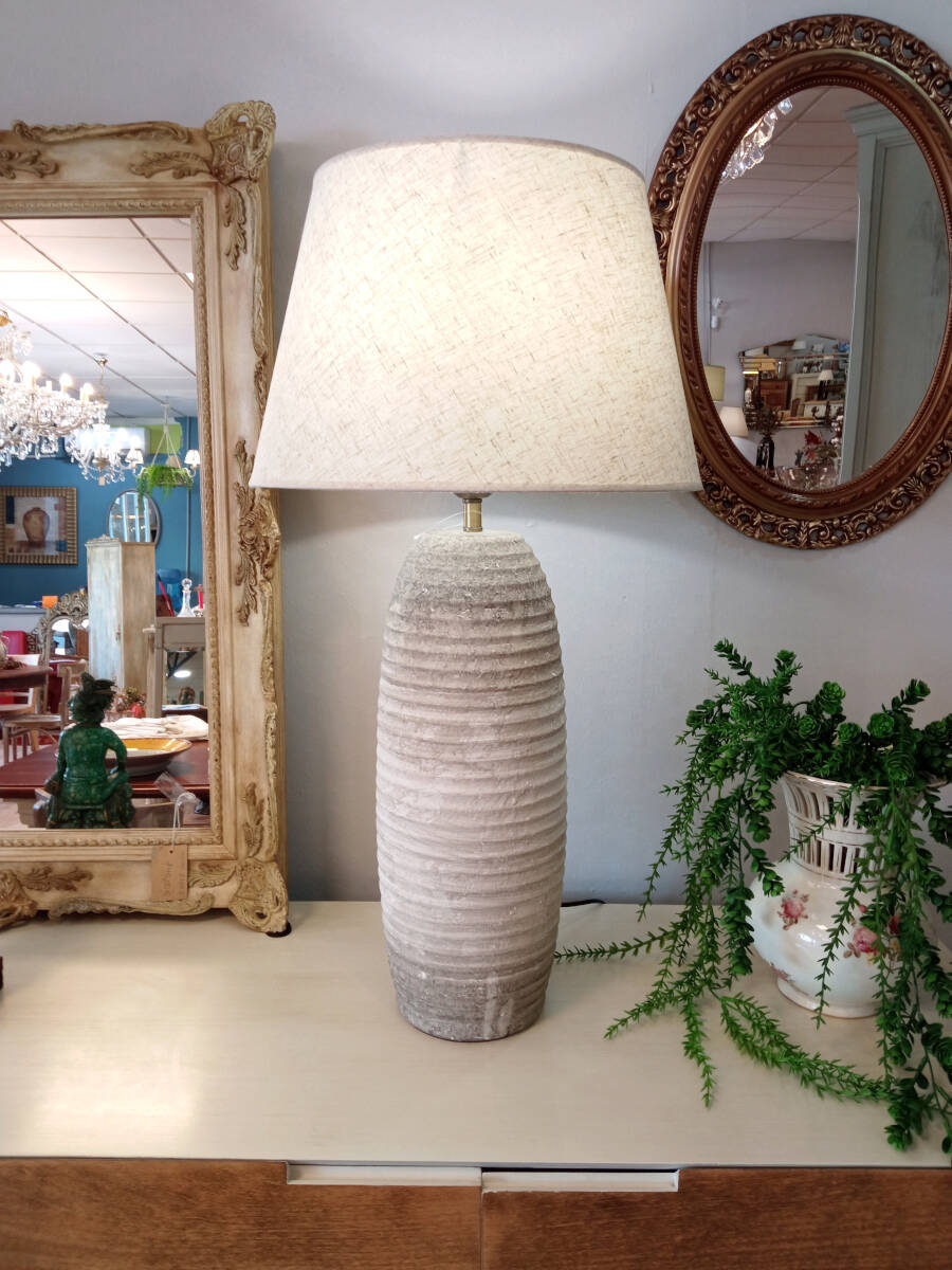Una lámpara de mesa de estilo rústico, fabricada en cerámica. Su diseño en gris piedra blanco con aros concéntricos, añaden un toque de elegancia y originalidad en cualquier espacio. 40x40x75. Pantalla beige espiga incluida.