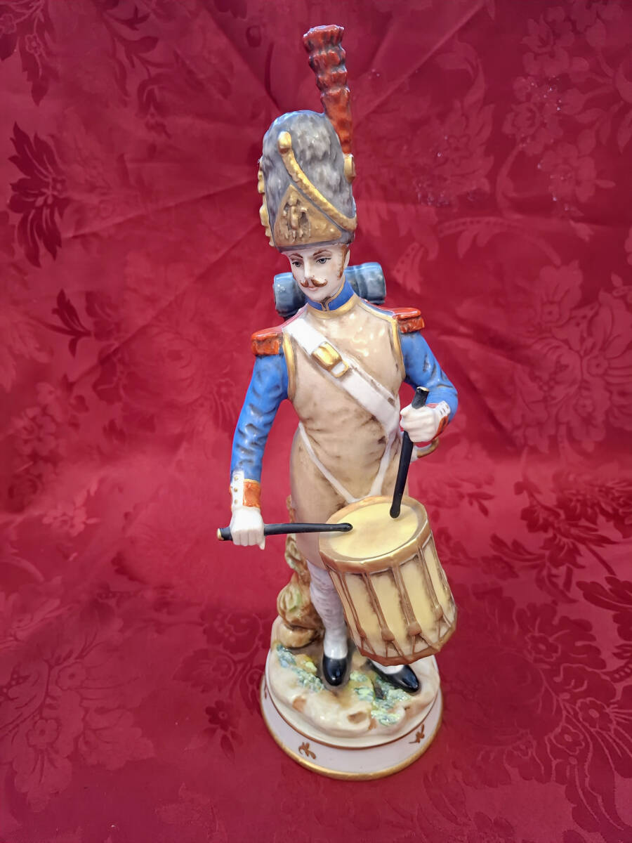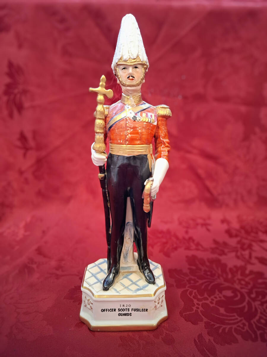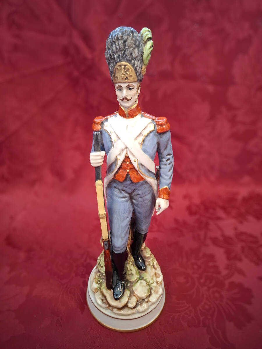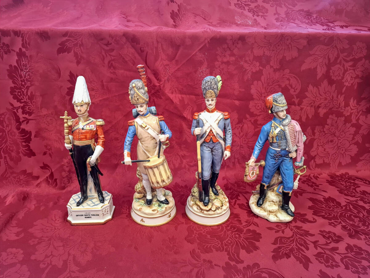 Los soldados de porcelana fabricados por Salvador Mallol, son piezas coleccionables de alta calidad que se caracterizan por su meticuloso diseño y acabado. Salvador Mallol es especialmente conocido por su trabajo en porcelana dentro del movimiento artístico del siglo XX. Sus piezas en este caso, soldados militares son representativas de su atención al detalle en uniformes, atuendos y expresiones faciales. El lote se compone de cuatro figuras, una es de porcelana italiana Capodimonte, “1820 Officer Scots Fusileer Guards”, esta figura tiene la cabeza pegada. Las tres figuras restantes de Salvador Mallol se encuentran en buen estado de conservación, salvo un pompón del casco de un soldado. Ver fotos. Medidas: Base: 11 cm, alto 32 cm.