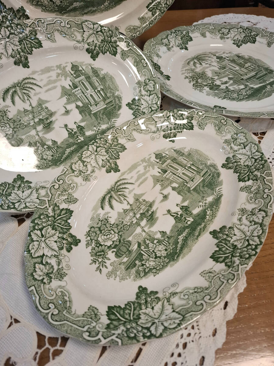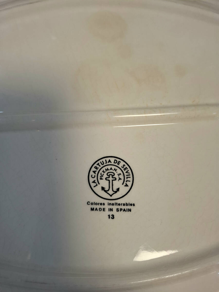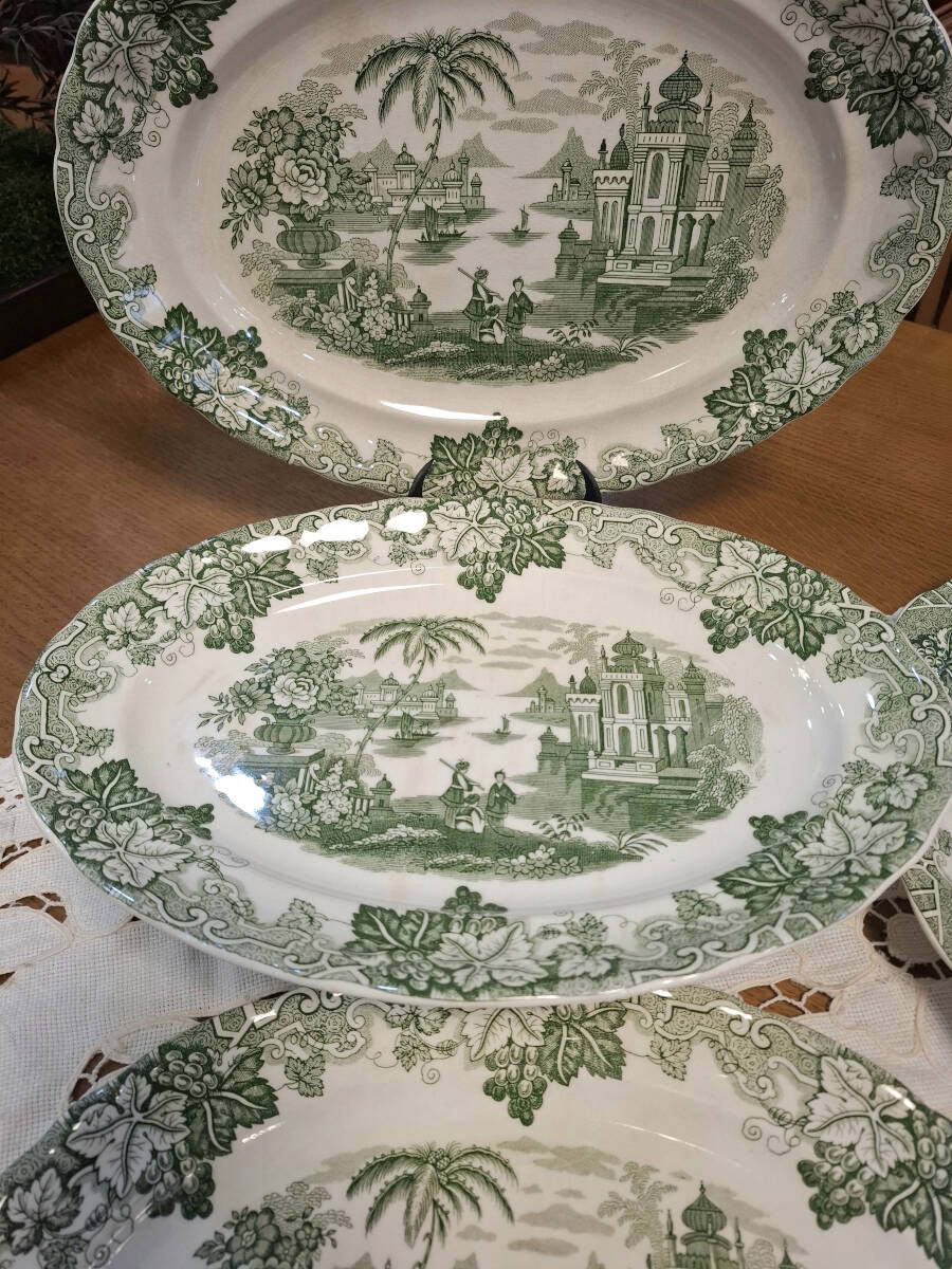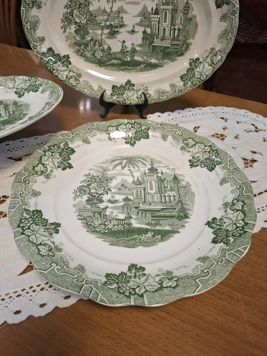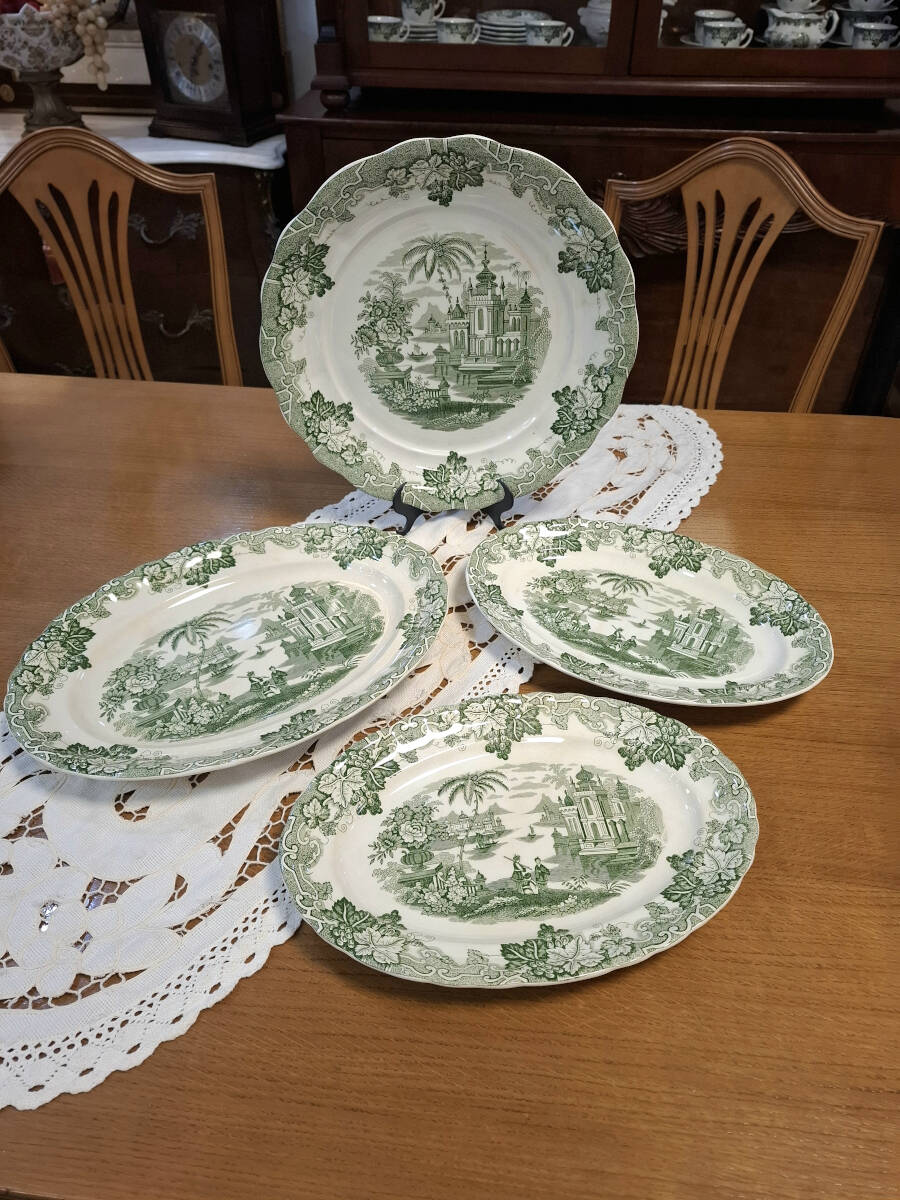 Antiguo juego de cuatro fuentes verde de la prestigiosa fábrica La Cartuja de Sevilla, compuesto por dos fuentes ovaladas medianas: 32,5cm x 22cm, una grande ovalada 37,5cm x 28cm, y una fuente redonda de 34 cm. Numeraciones 13, 17 y 23. Una vajilla clásica perfecta para decorar cualquier mesa dándole un toque de sencillez y elegancia. Excelente estado de conservación, presenta pequeñas señales de su propio uso y antigüedad.