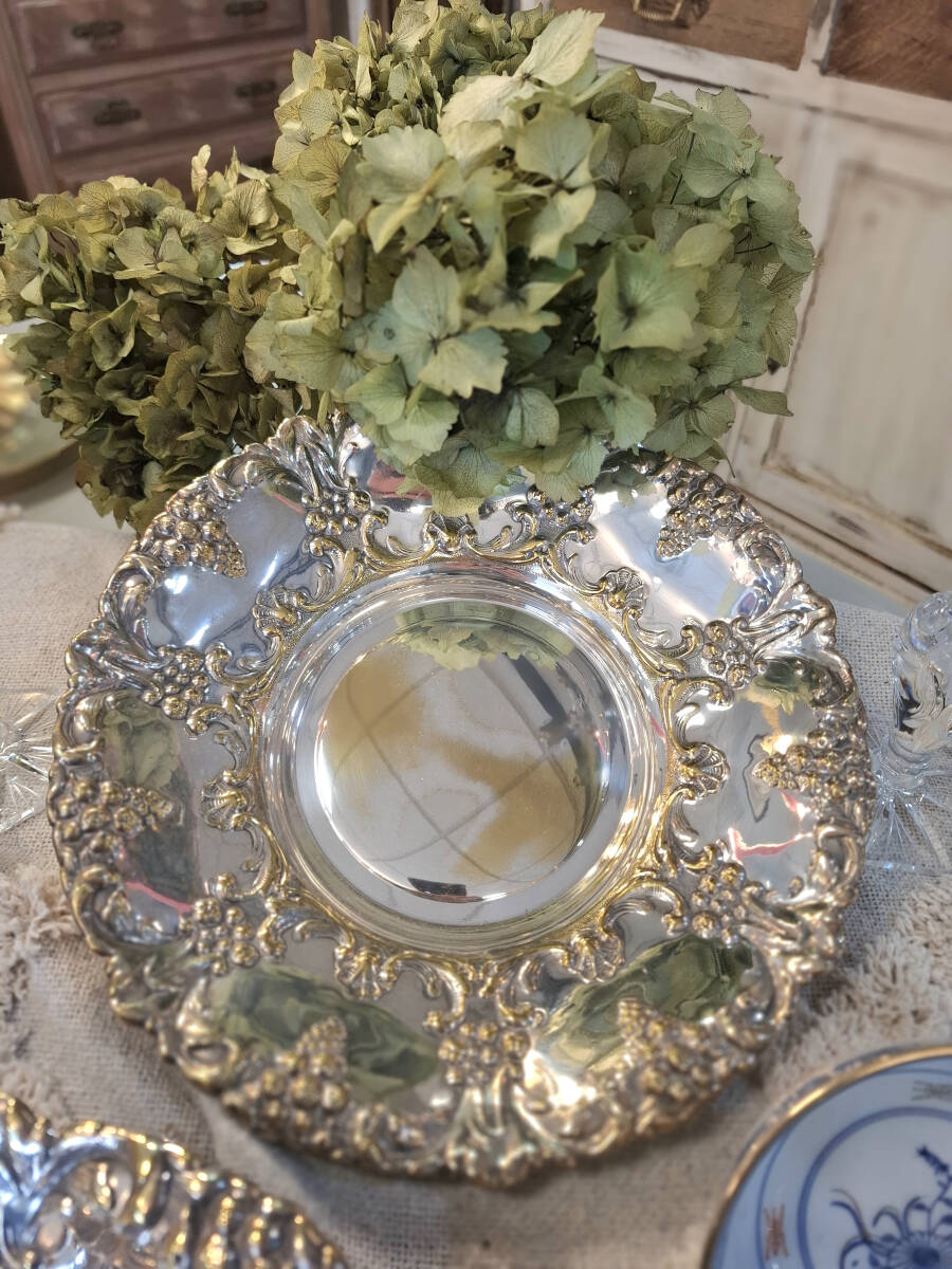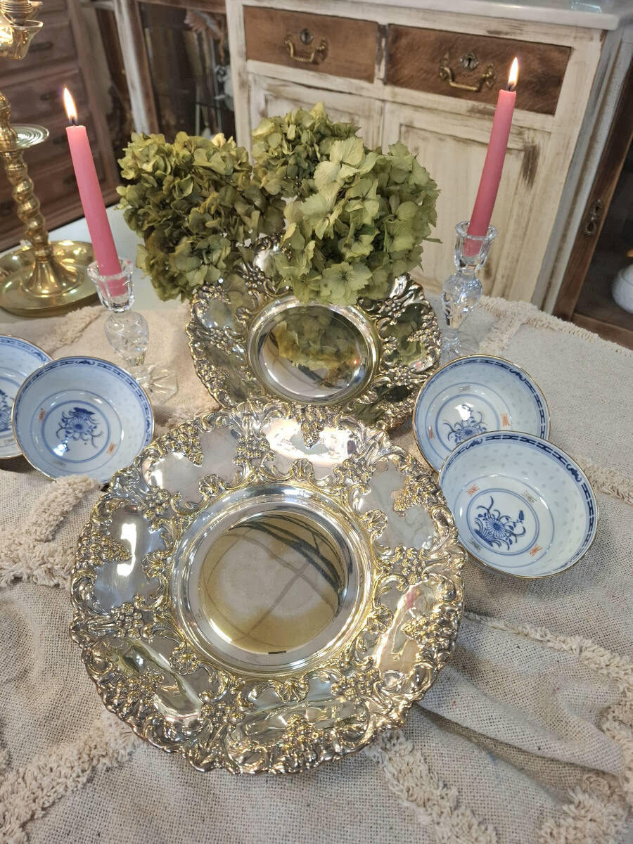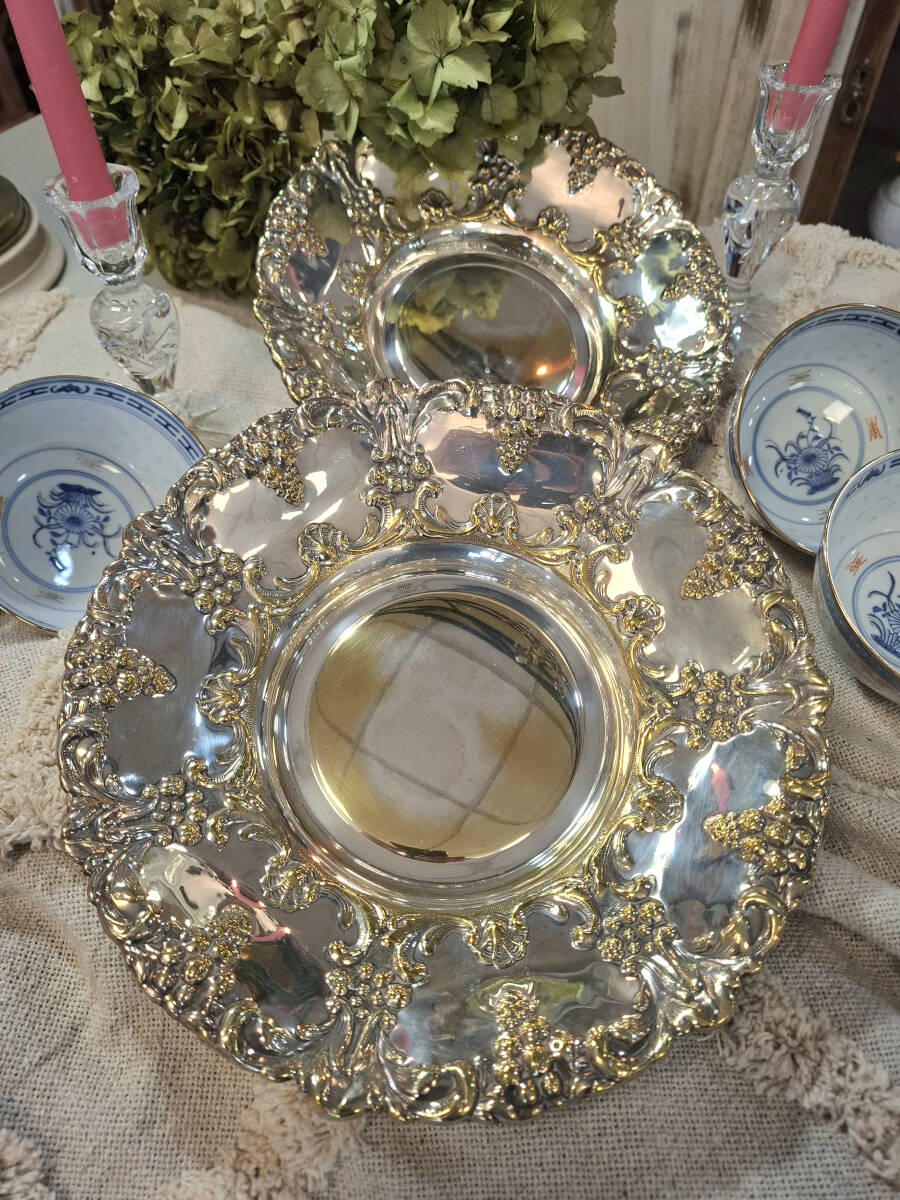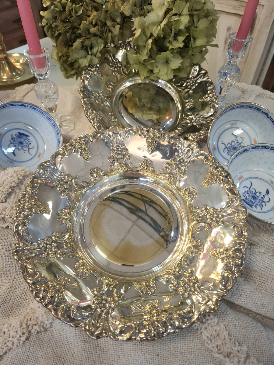Antigua pareja de paneras o bandejas repujadas en metal plateado con forma circular. Fabricadas en España por la firma Cortasa, estas piezas destacan por su exquisito trabajo artesanal en metal plateado. A pesar de su antigüedad, se encuentran en buen estado de conservación, aunque presentan sutiles reflejos dorados debido al paso del tiempo, lo que añade un toque único a su apariencia. Tamaño: 4,5 x 25,5 cm.
