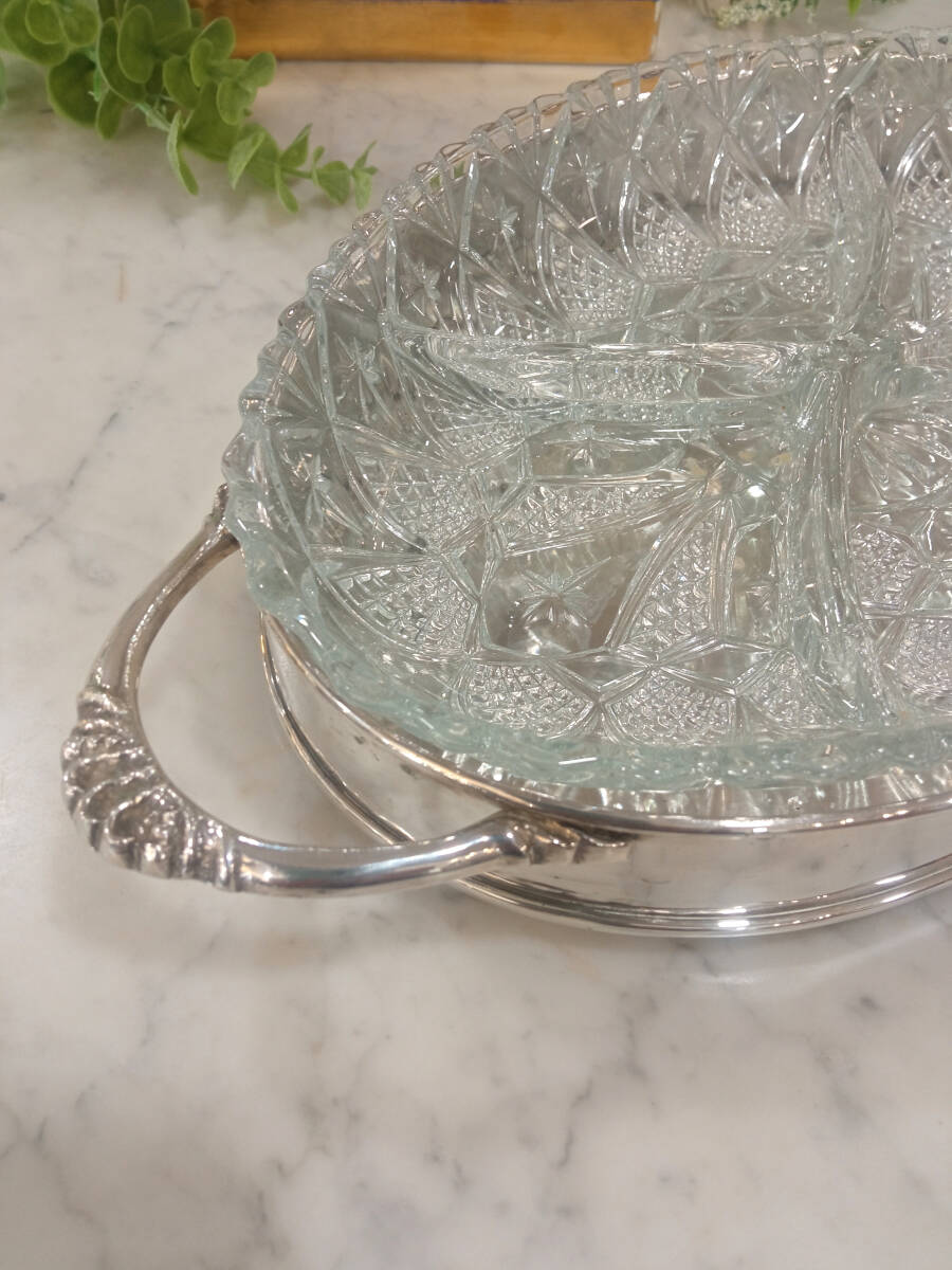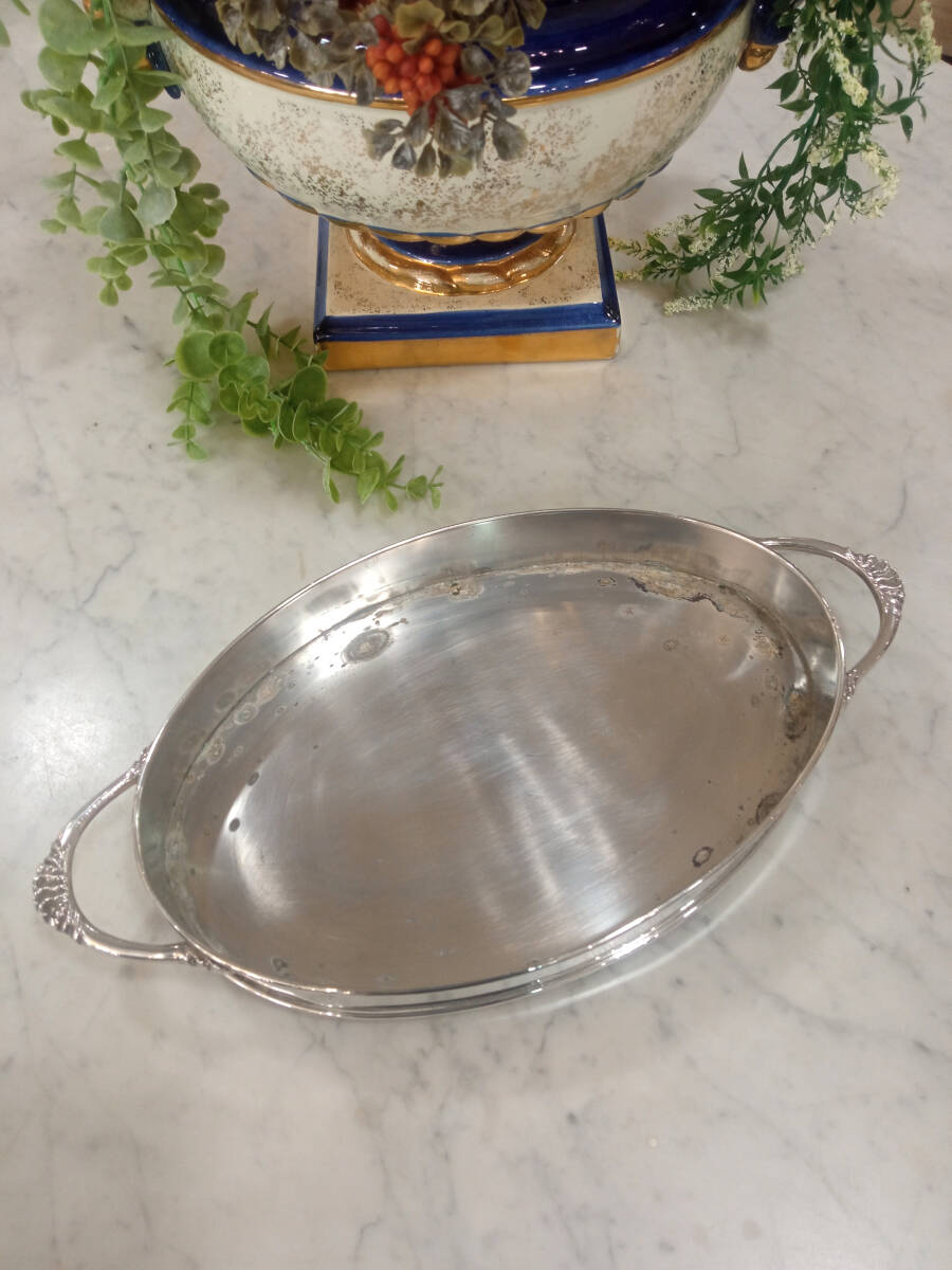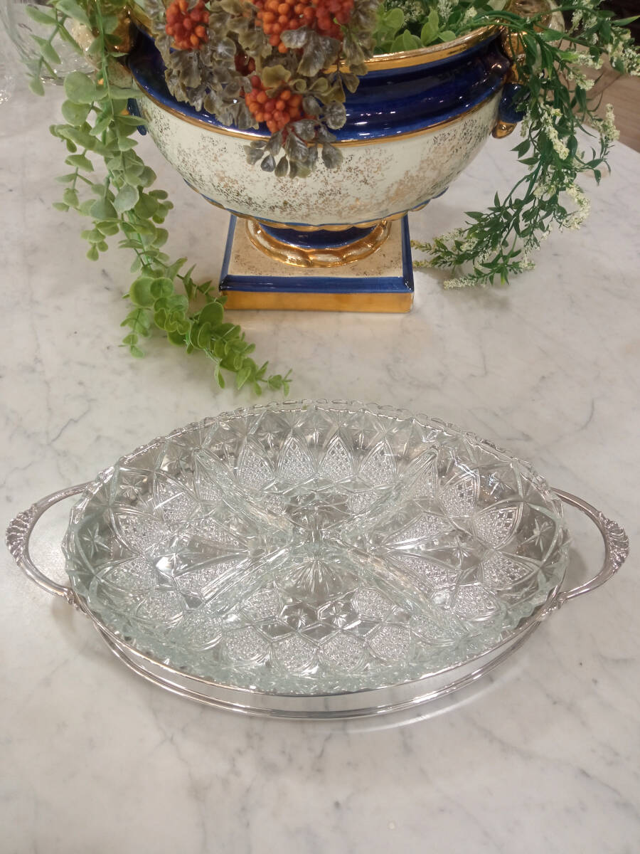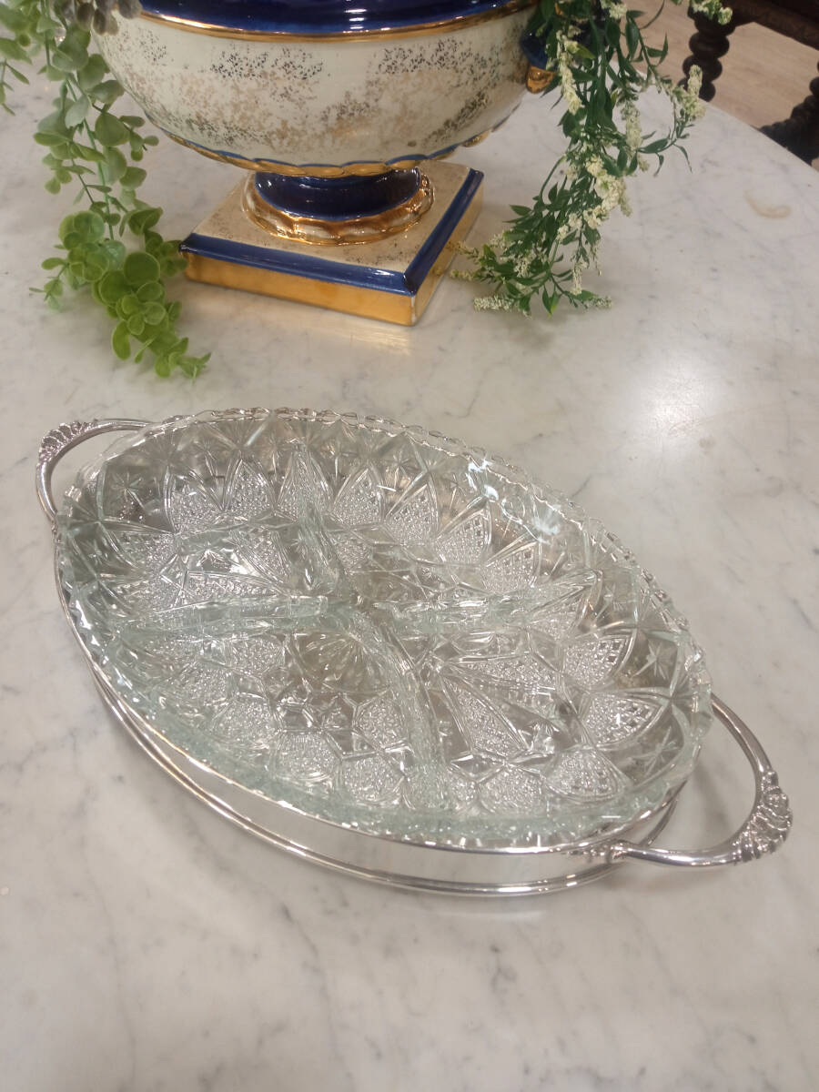 Antigua fuente de aperitivos con forma ovalada, realizada en cristal tallado metal plateado. La fuente de metal con asas, se apoya sobre cuatro patas semicirculares. Buen estado de conservación, con señales de su propio uso y antigüedad.