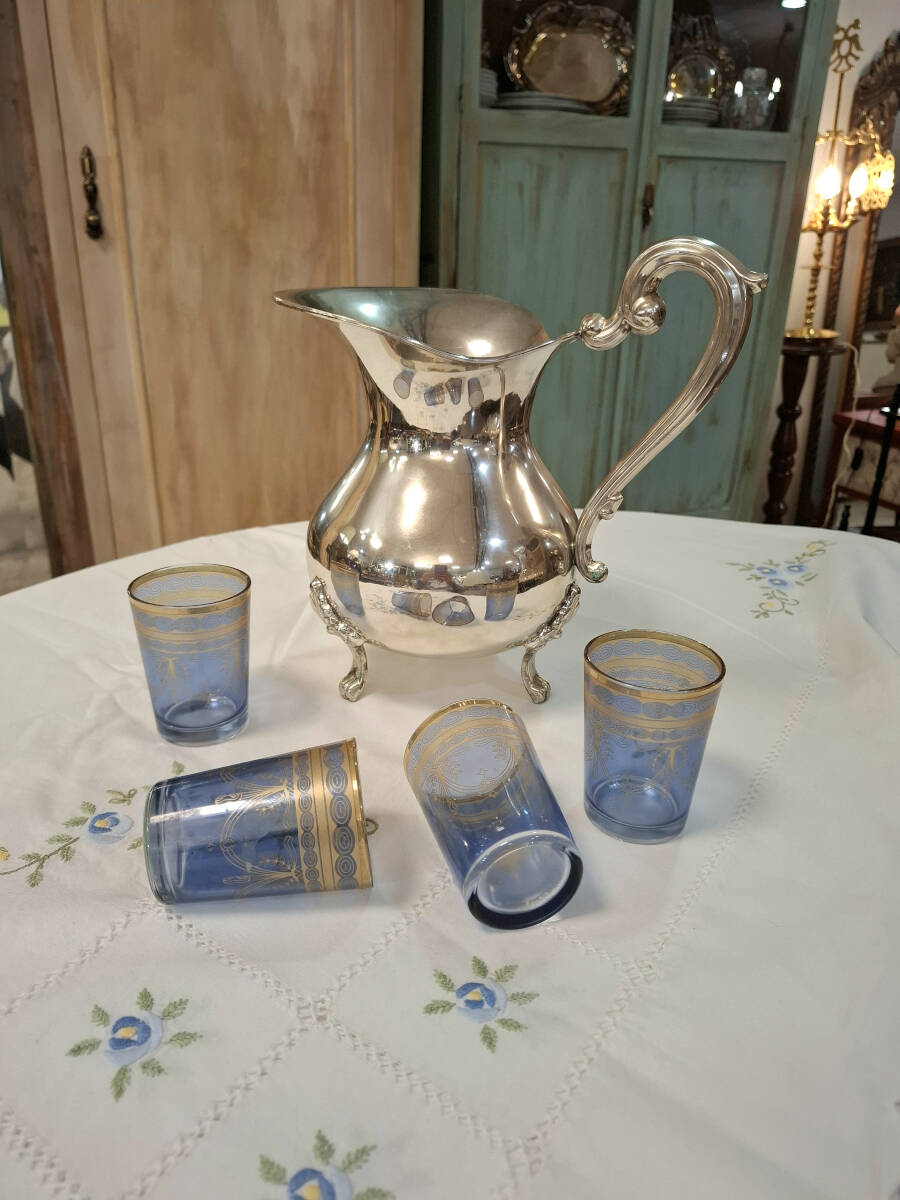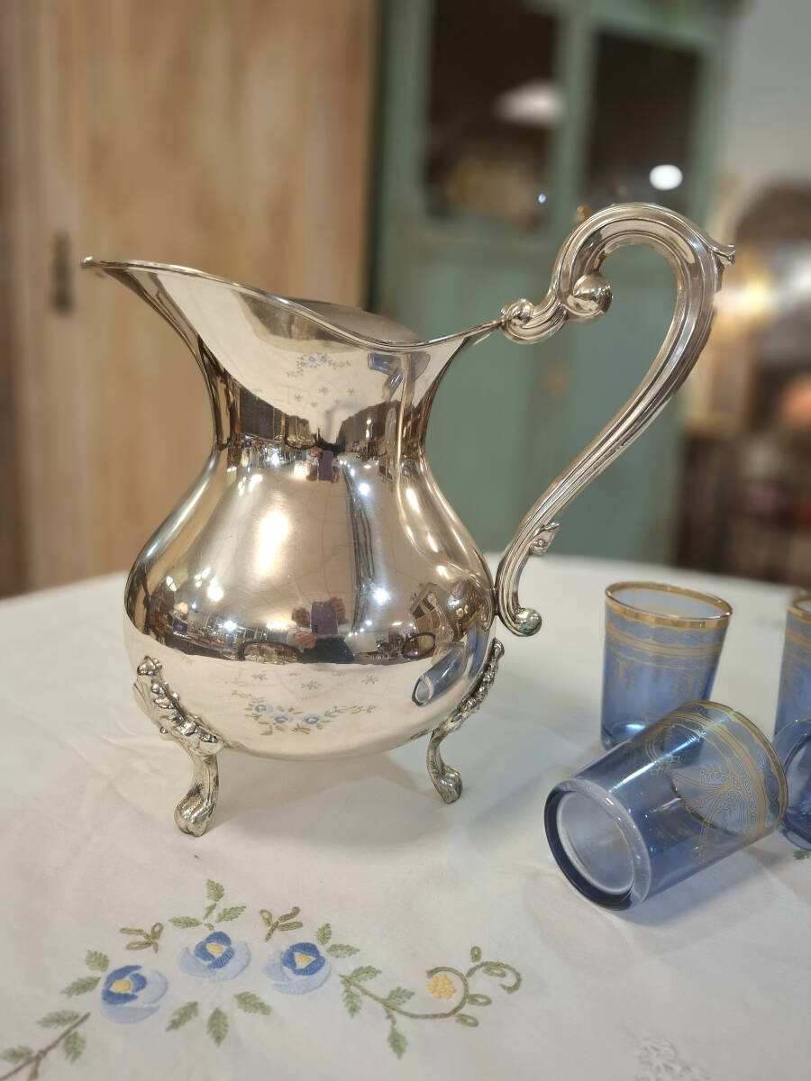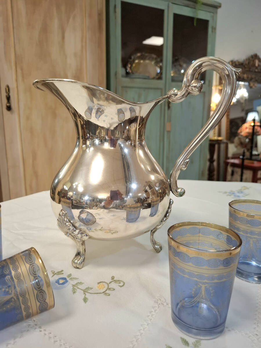 Elegante jarra de alpaca plateada con un diseño clásico y refinado. Presenta una forma abombada con base de cuatro patas decorativas, ideal para uso decorativo o de servicio en mesas elegantes. Su diseño atemporal la convierte en una pieza perfecta para complementar vajillas o colecciones vintage.