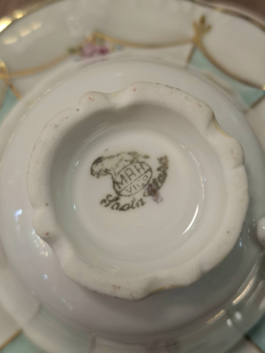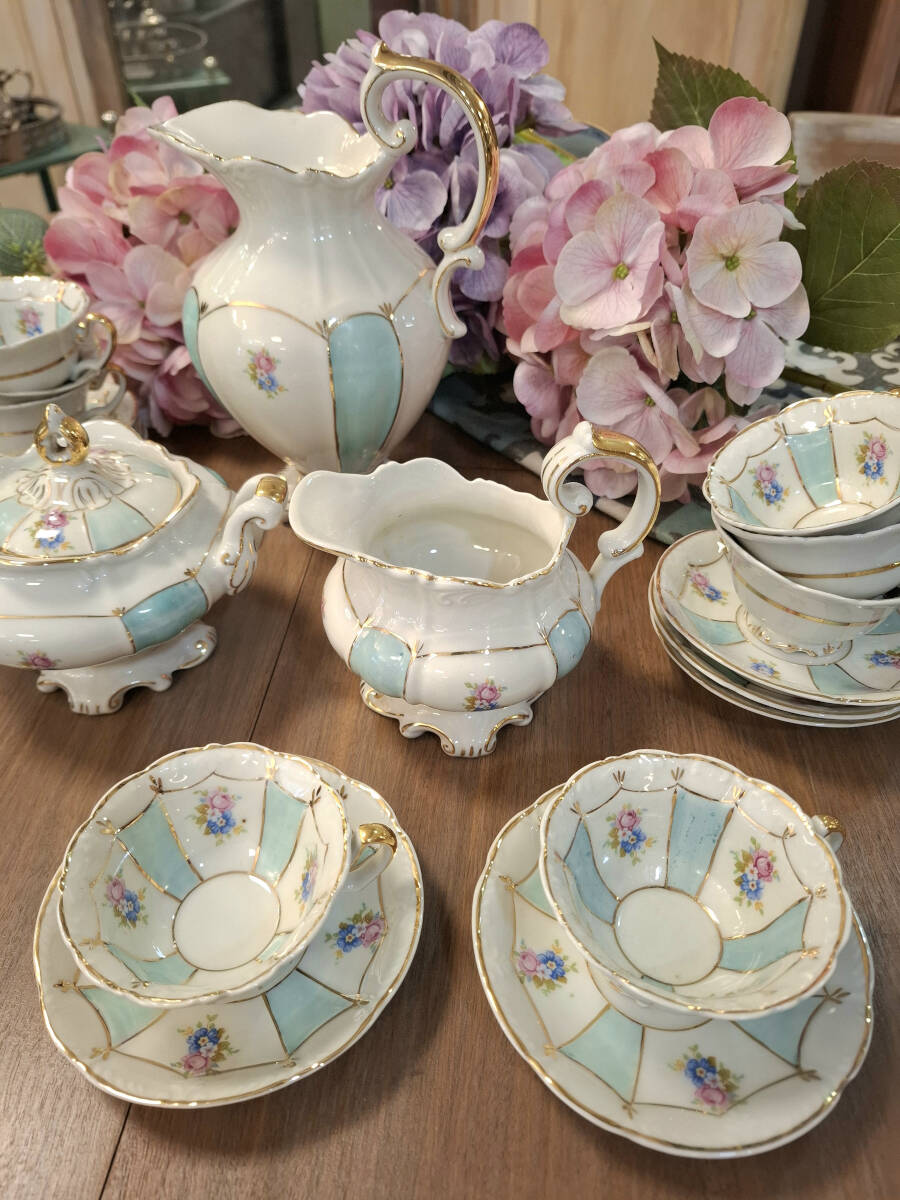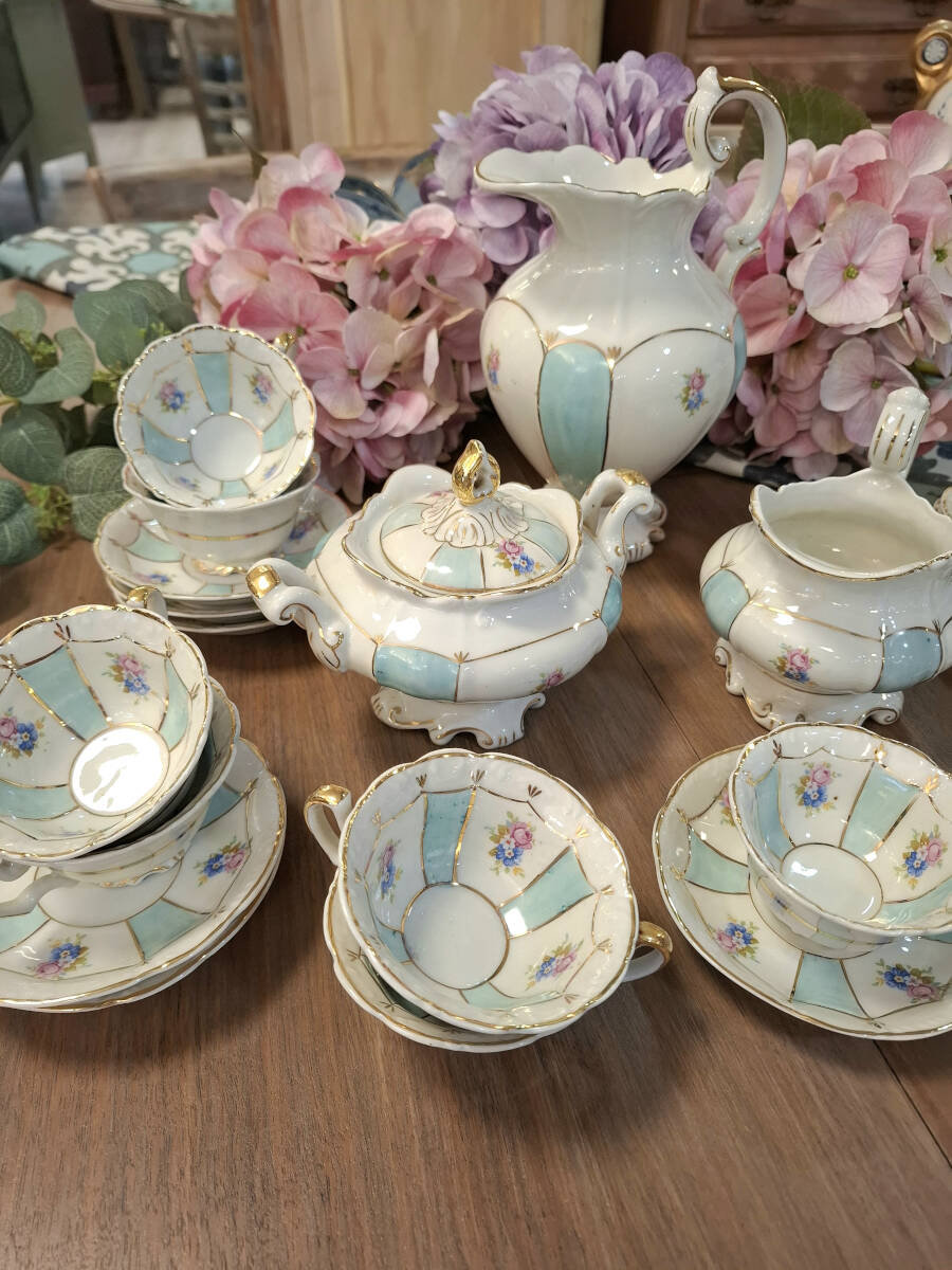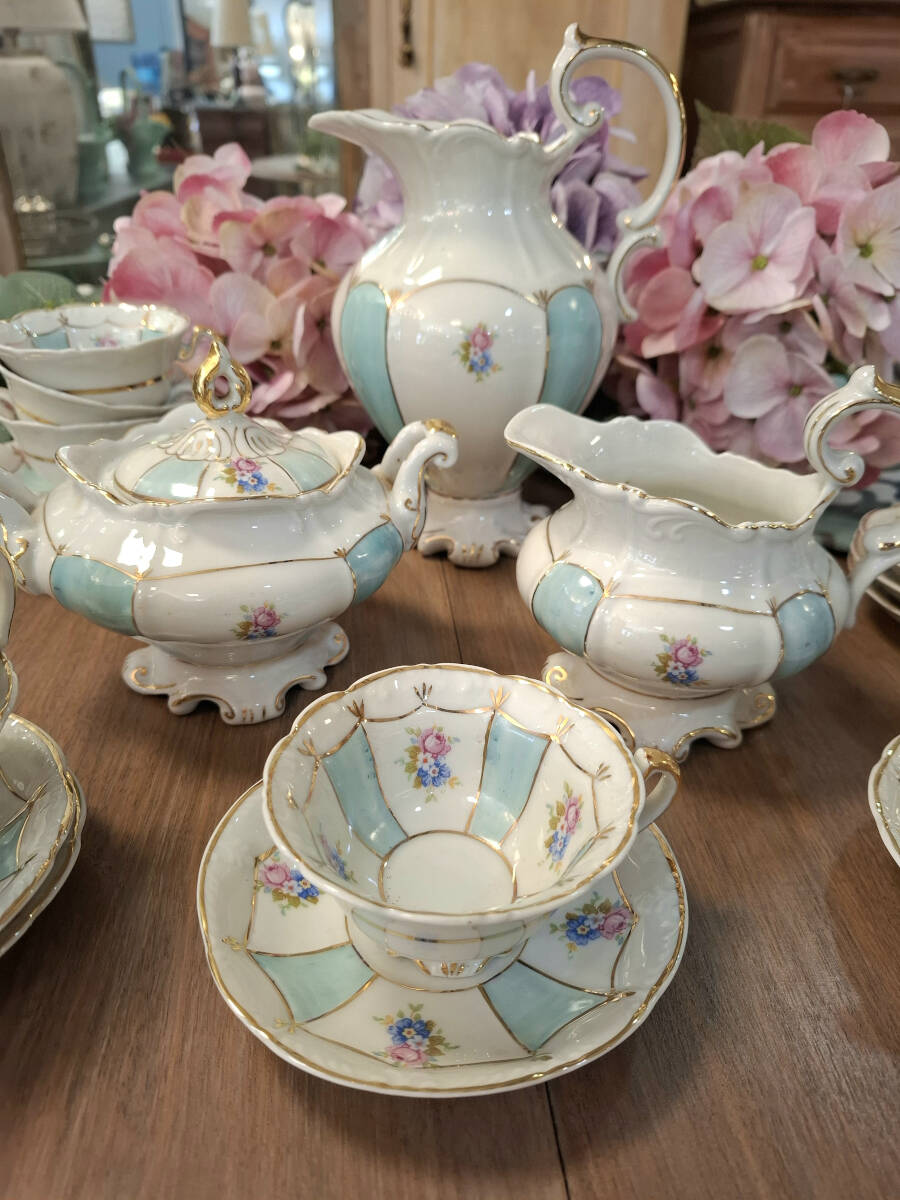 Elegante juego de café vintage de porcelana fina, elaborado por la prestigiosa firma Santa Clara en la década de 1960. Presenta un delicado diseño en tonos blanco y celeste, realzado con finos detalles dorados y ornamentado con motivos florales. El conjunto está compuesto por; 1 tetera, 1 lechera, azucarero y 10 tazas con sus respectivos platos. Ideal tanto para uso como para colección. Excelente estado de conservación.