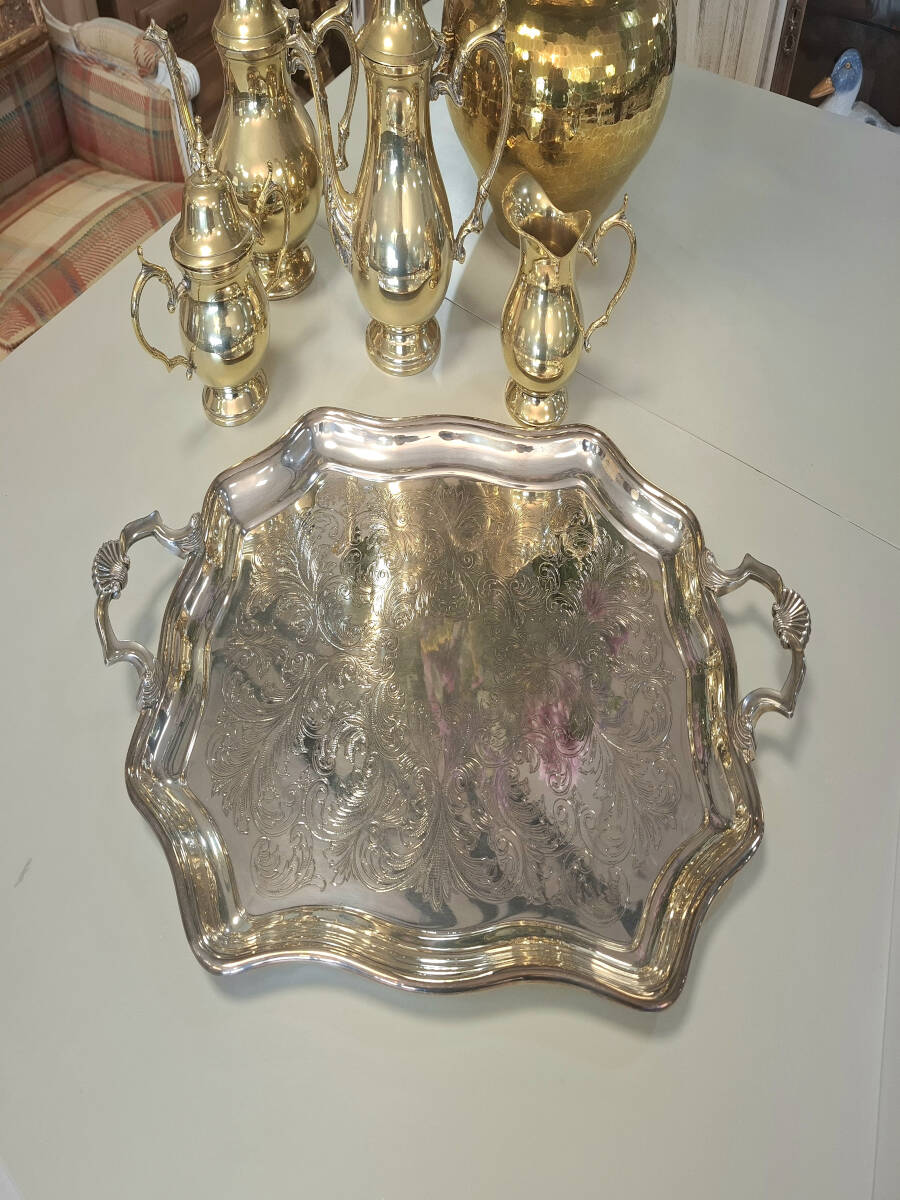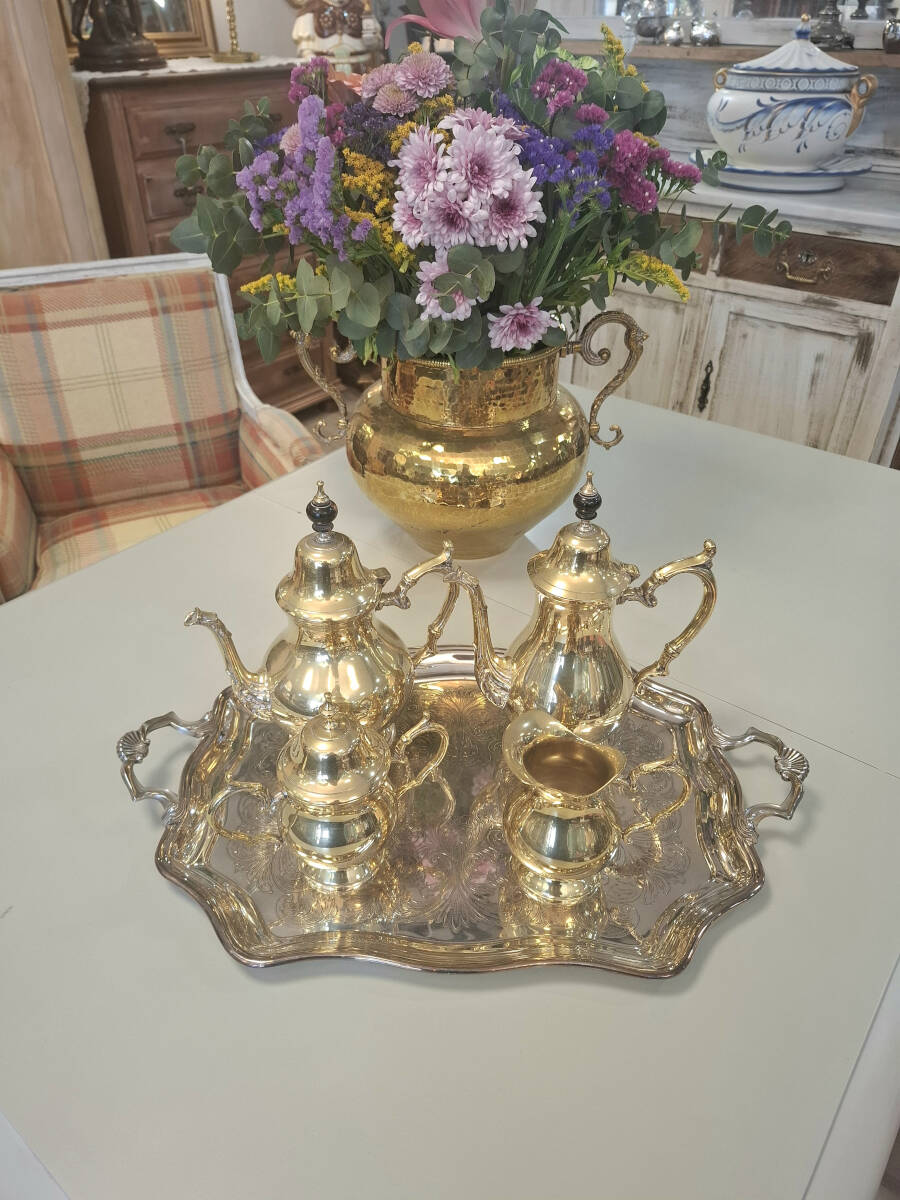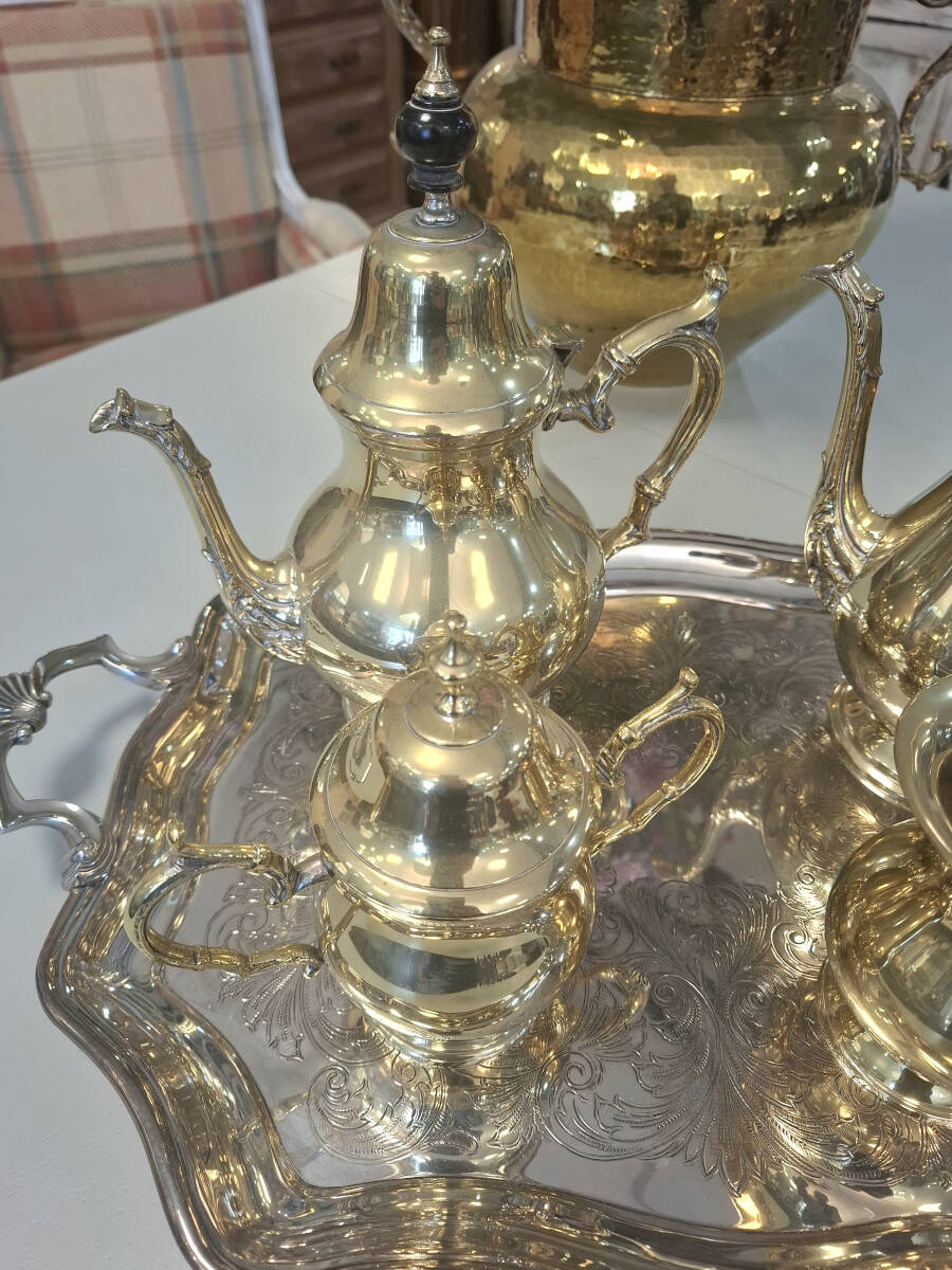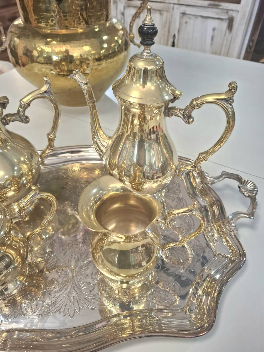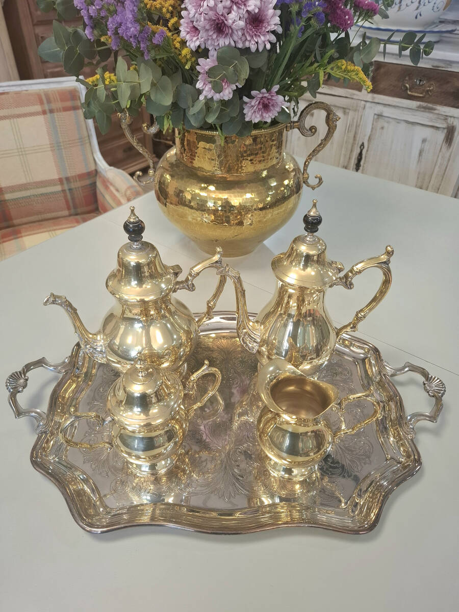 Exquisito juego vintage de café y té de metal plateado, que incluye una elegante bandeja rectangular con asas labradas, acompañada de una cafetera, tetera, lechera y azucarero. Este conjunto se encuentra en excelente estado de conservación, por su antigüedad, estas piezas tienen una combinación en tonos plateados y dorados en el metal, que le otorga un carácter único y distinguido. Medidas de la bandeja: 55,5cm x 35cm. Cafetera: 27cm x 22cm. Tetera: 28cm x 22cm. Lechera: 12,5 cm x 13cm. Azucarero: 17cm x 18cm.