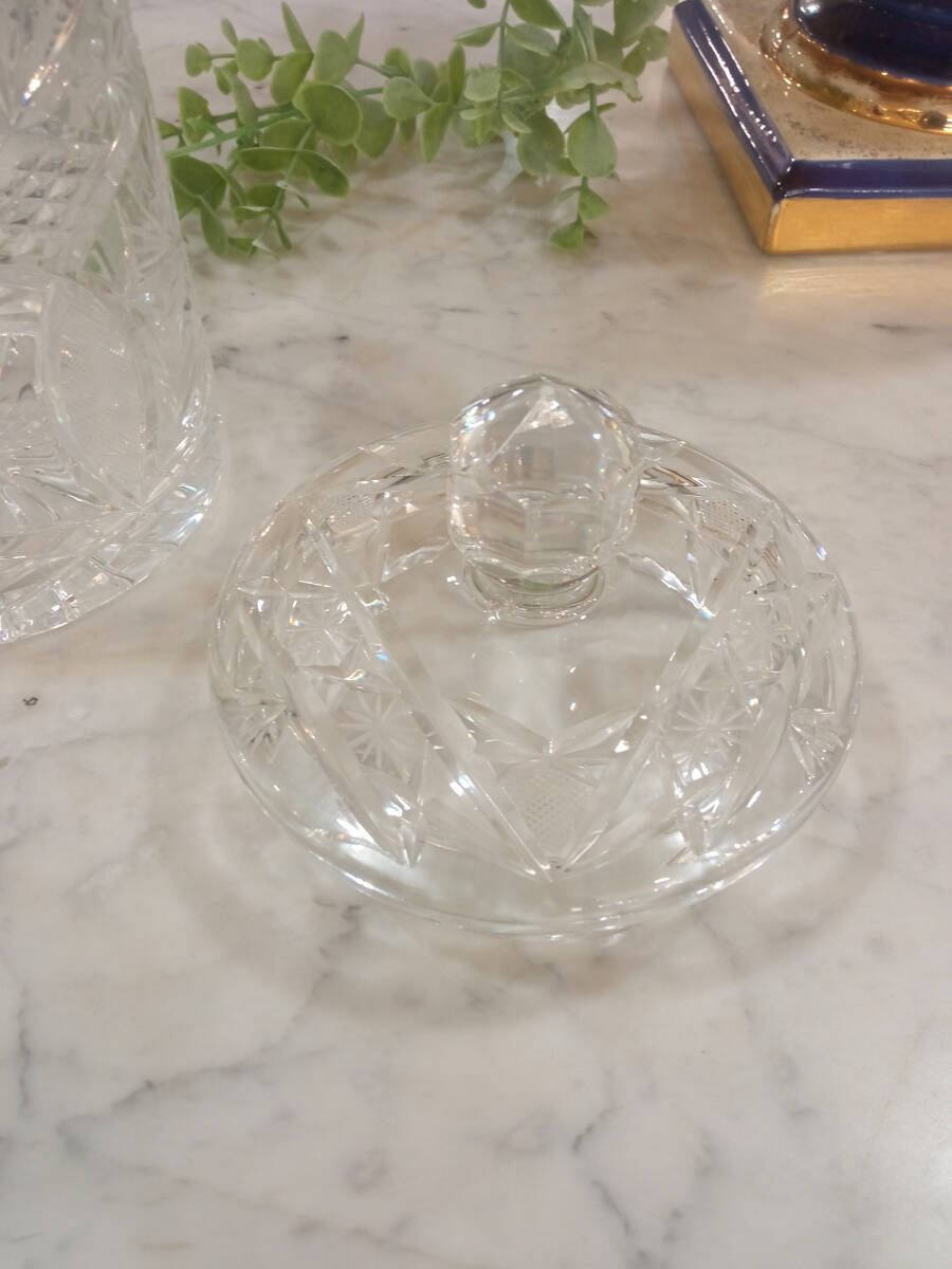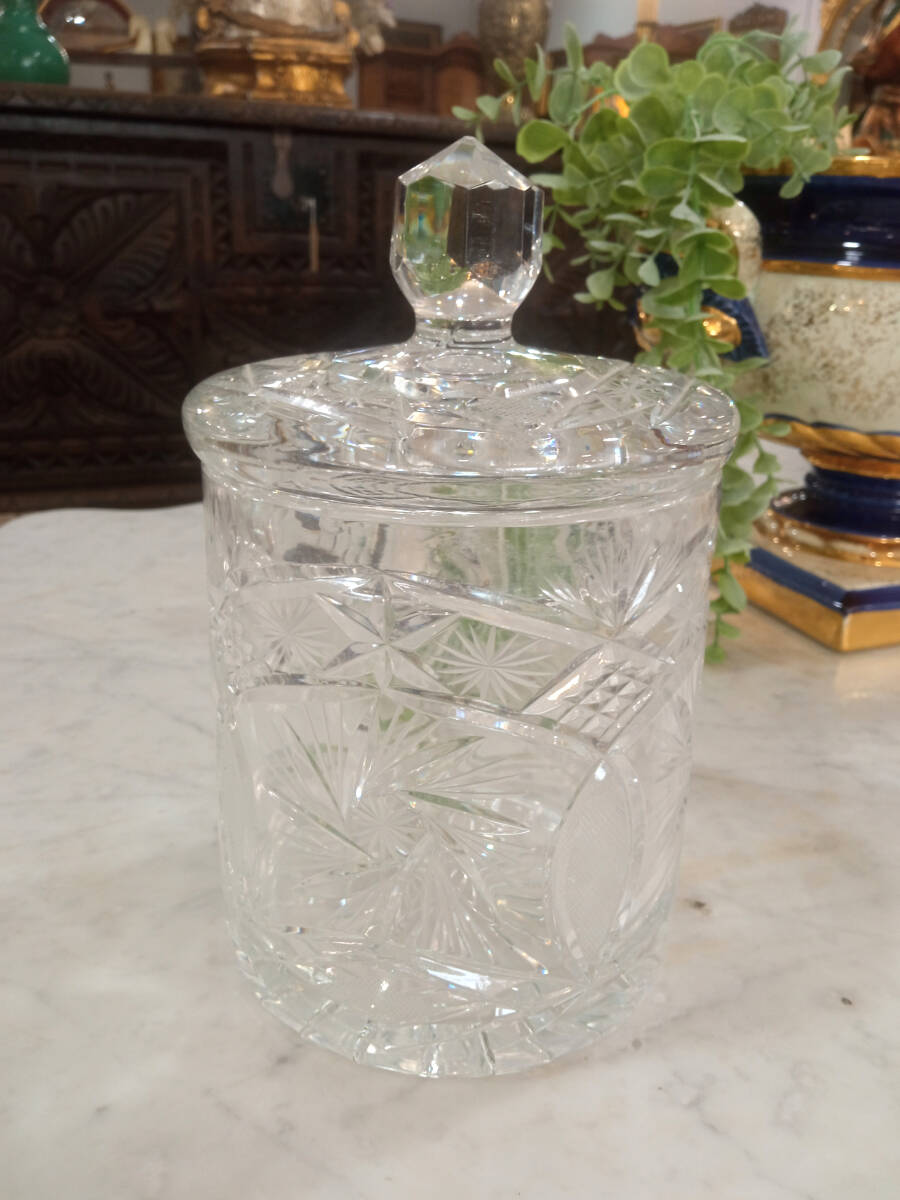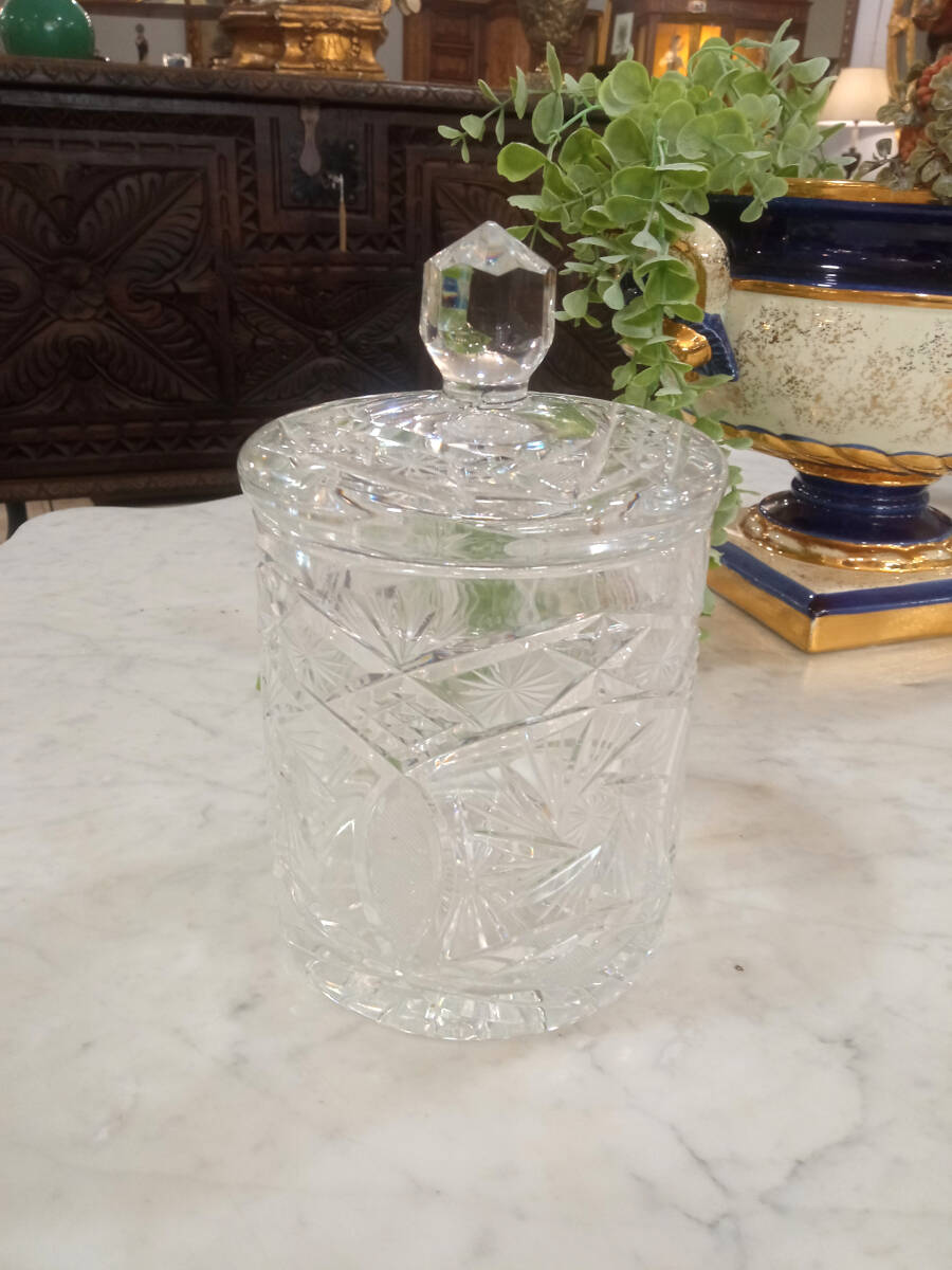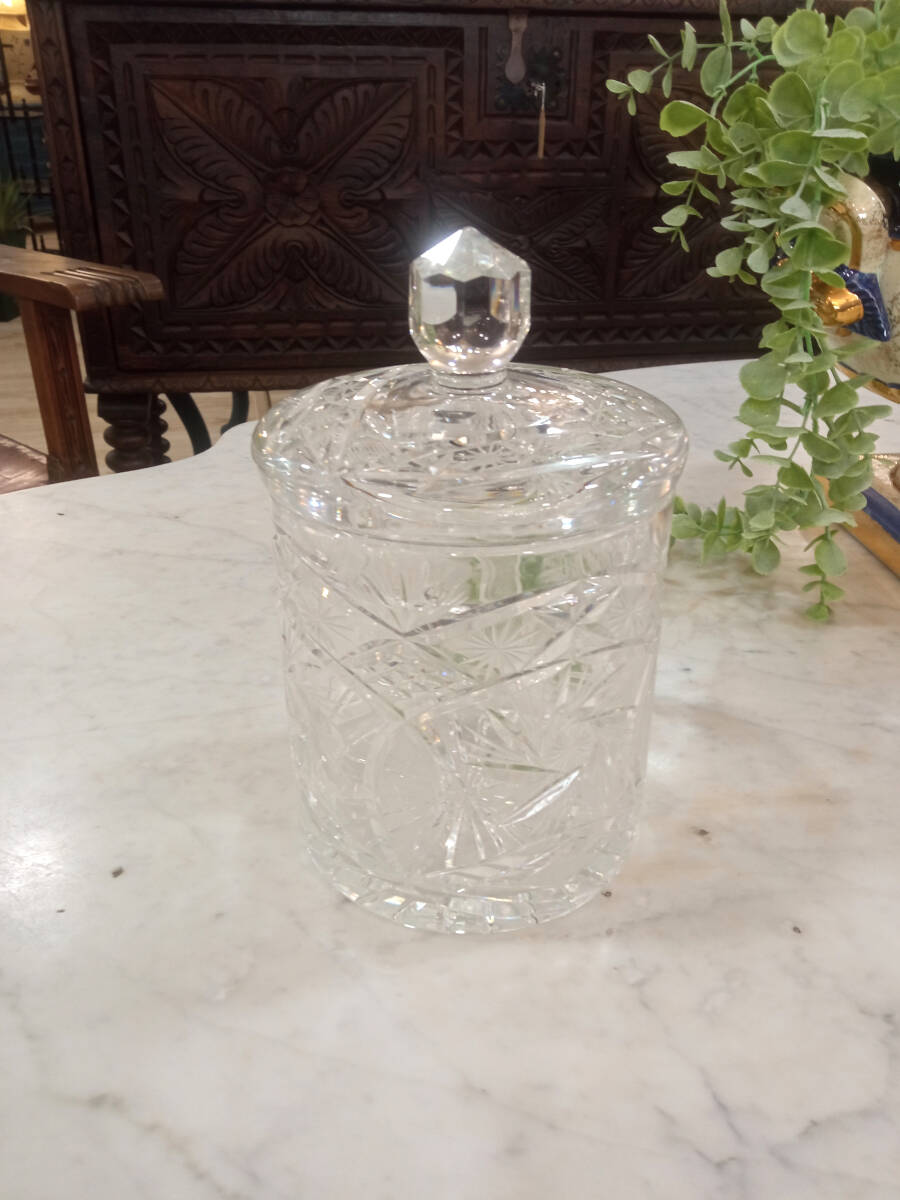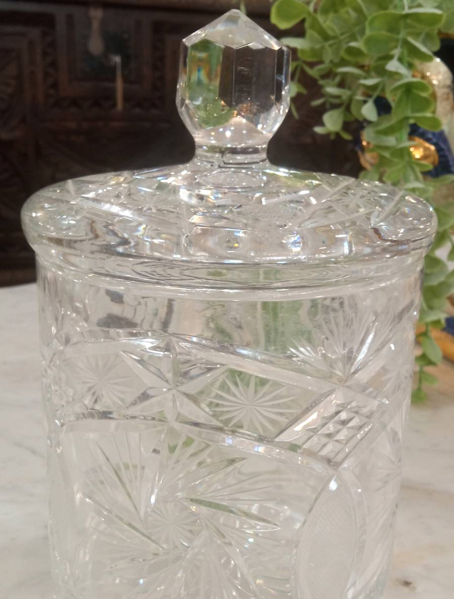 Galletero o bombonera de cristal tallado de bohemia. Una pieza clásica y elegante donde podrás conservar y presentar tus mejores dulces, bombones o caramelos. Perfecto estado de conservación.