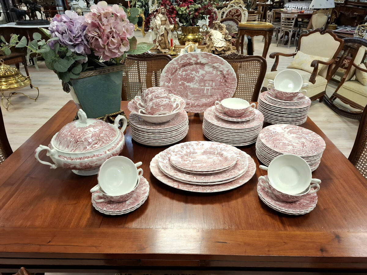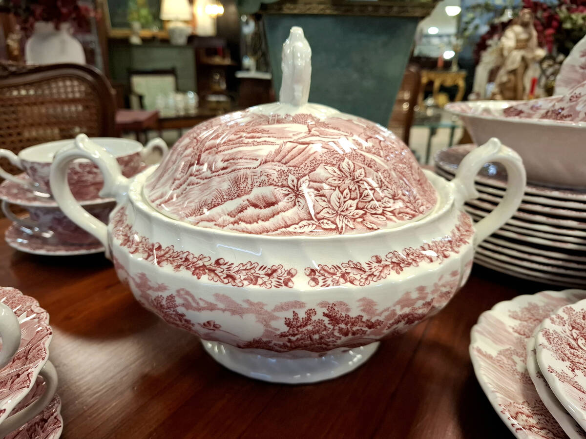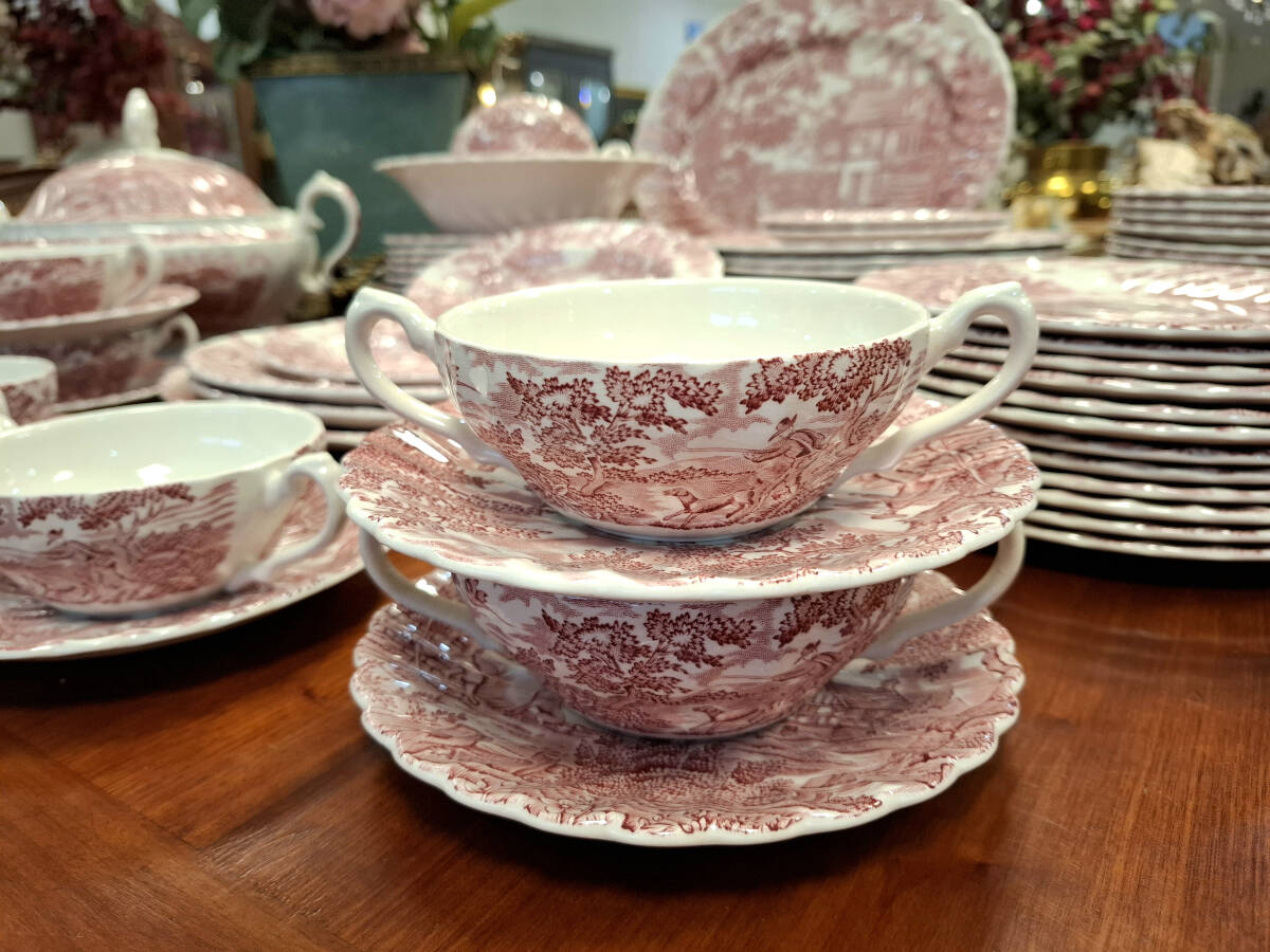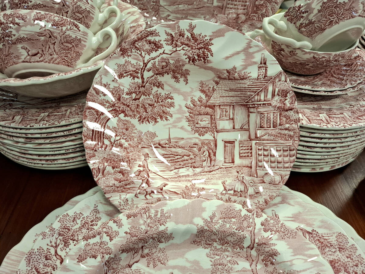 Vajilla rosa The Hunter by Myott fabricada en Inglaterra. Presenta una delicada decoración con escenas campestres de distintos dibujos, característica del estilo tradicional inglés. Su diseño refinado y atemporal la convierte en una pieza ideal tanto para ocasiones especiales como para realzar la mesa en el día a día. Perfecta para quienes valoran la porcelana clásica inglesa y el encanto de los detalles cuidadosamente ilustrados.