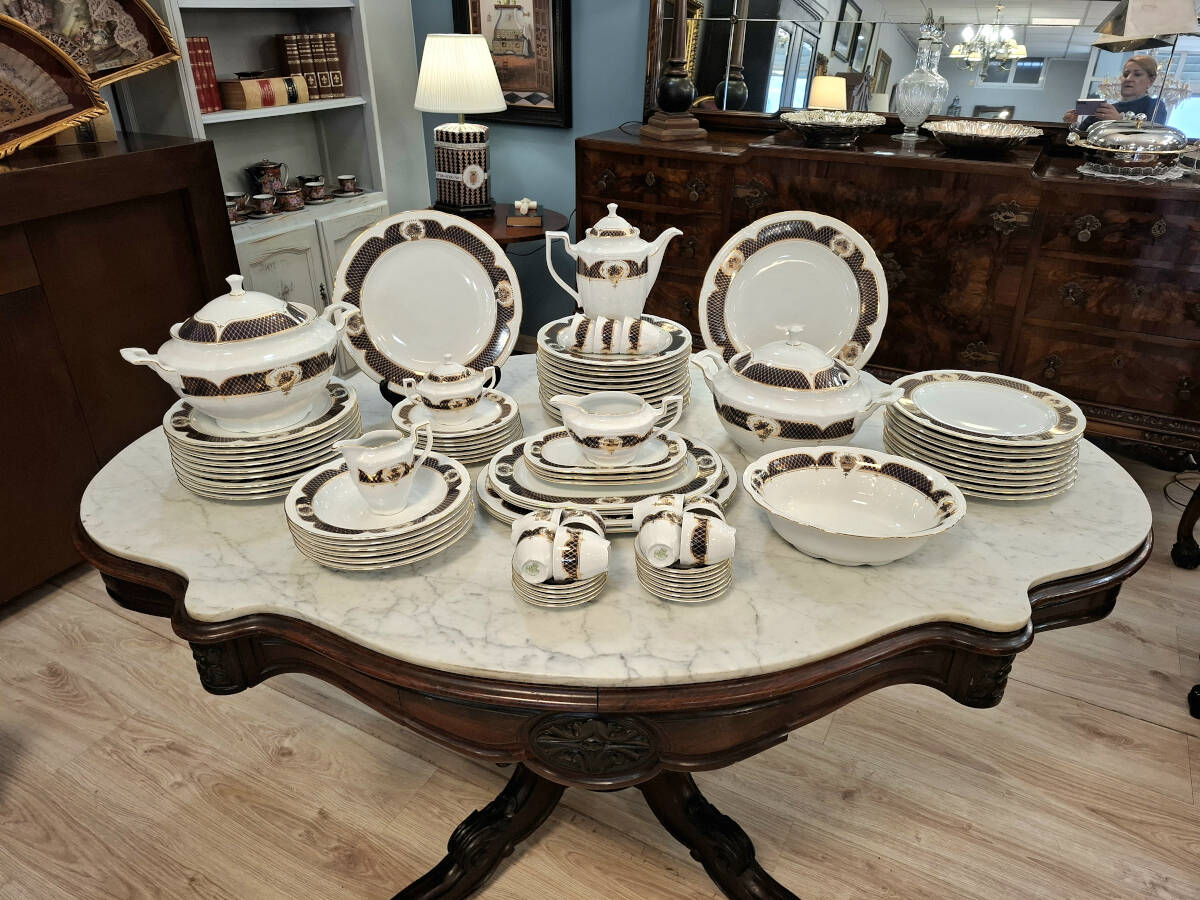 Consta de 82 piezas: 2 soperas, 2 platos grandes 31 cm, 2 fuentes grandes 37 cm, 2 fuentes medianas 33cm, 3 fuentes pequeñas 22 cm, 1 ensaladera 26 cm, 1 salsera, 30 platos llanos, 6 hondos, 7 postre, cafetera, lechera, azucarera, 11 tazas de café con sus respectivos platitos.