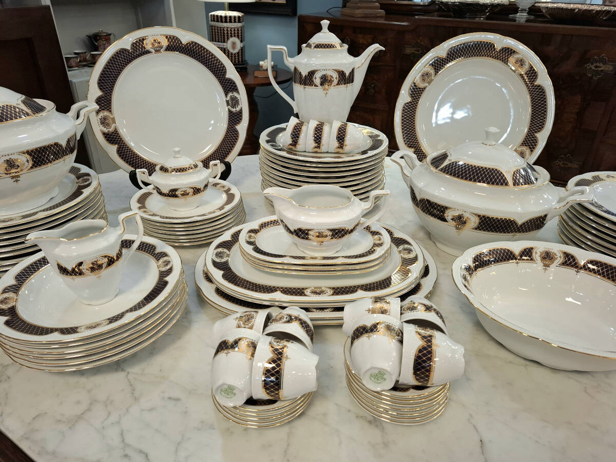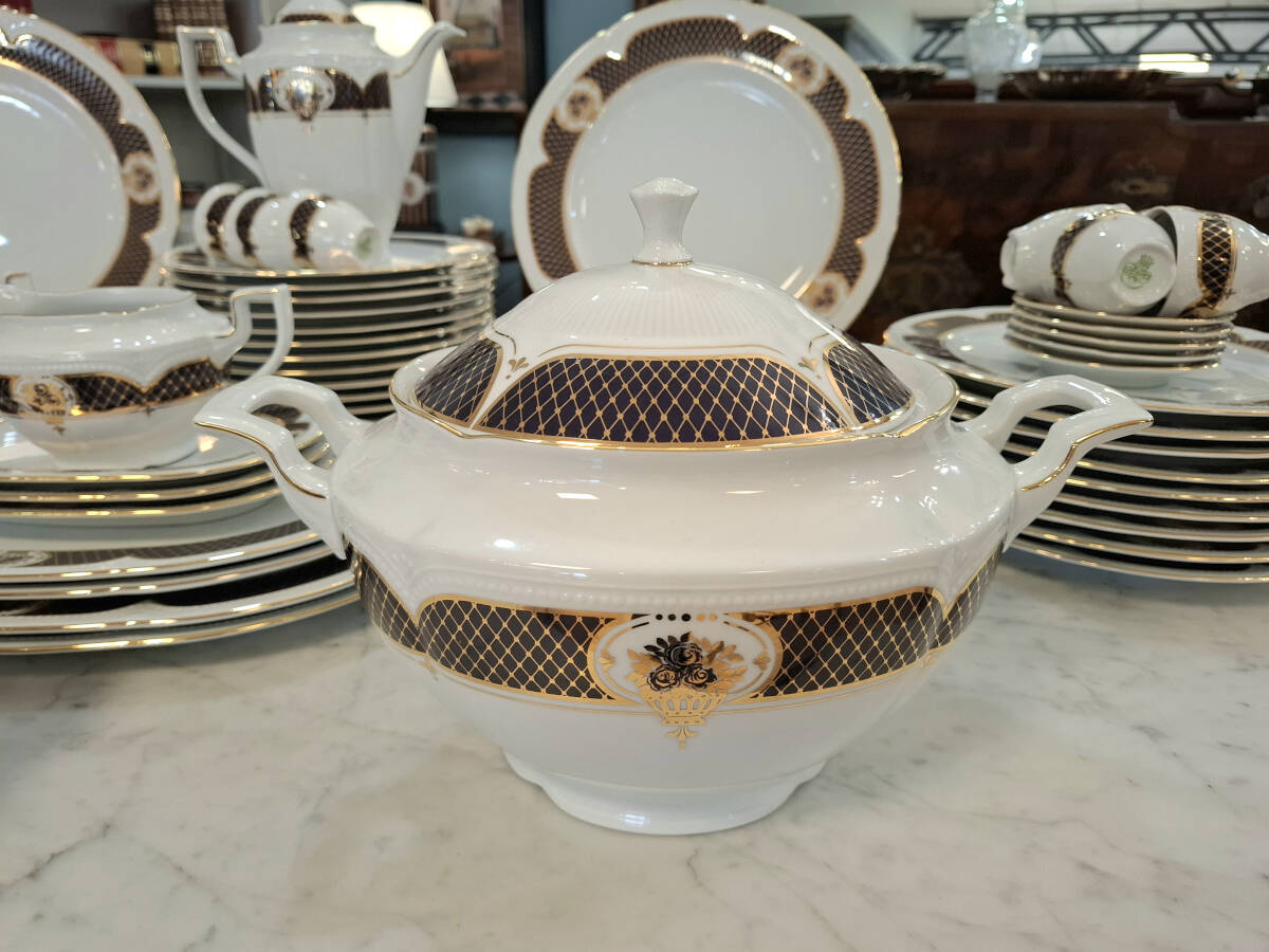 Presenta un diseño clásico y sofisticado, con delicados detalles en tonos azul profundo y dorado, realzados por motivos florales y acabados en oro que aportan distinción y elegancia a cualquier mesa. Cada pieza refleja el refinamiento de la porcelana alemana, combinando resistencia, brillo y un estilo atemporal ideal tanto para ocasiones especiales como para coleccionistas. Excelente estado de conservación.