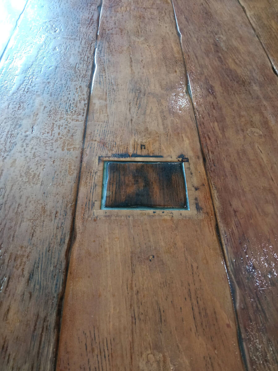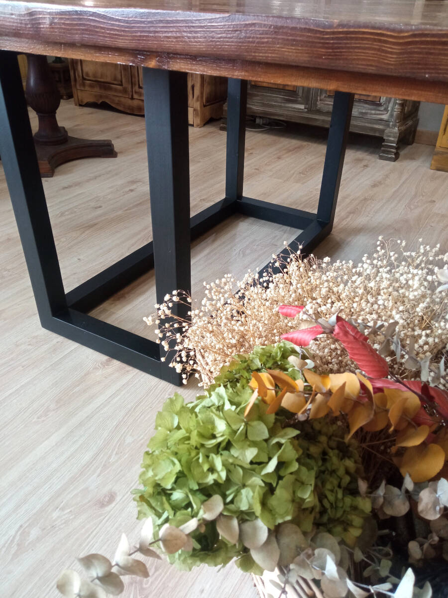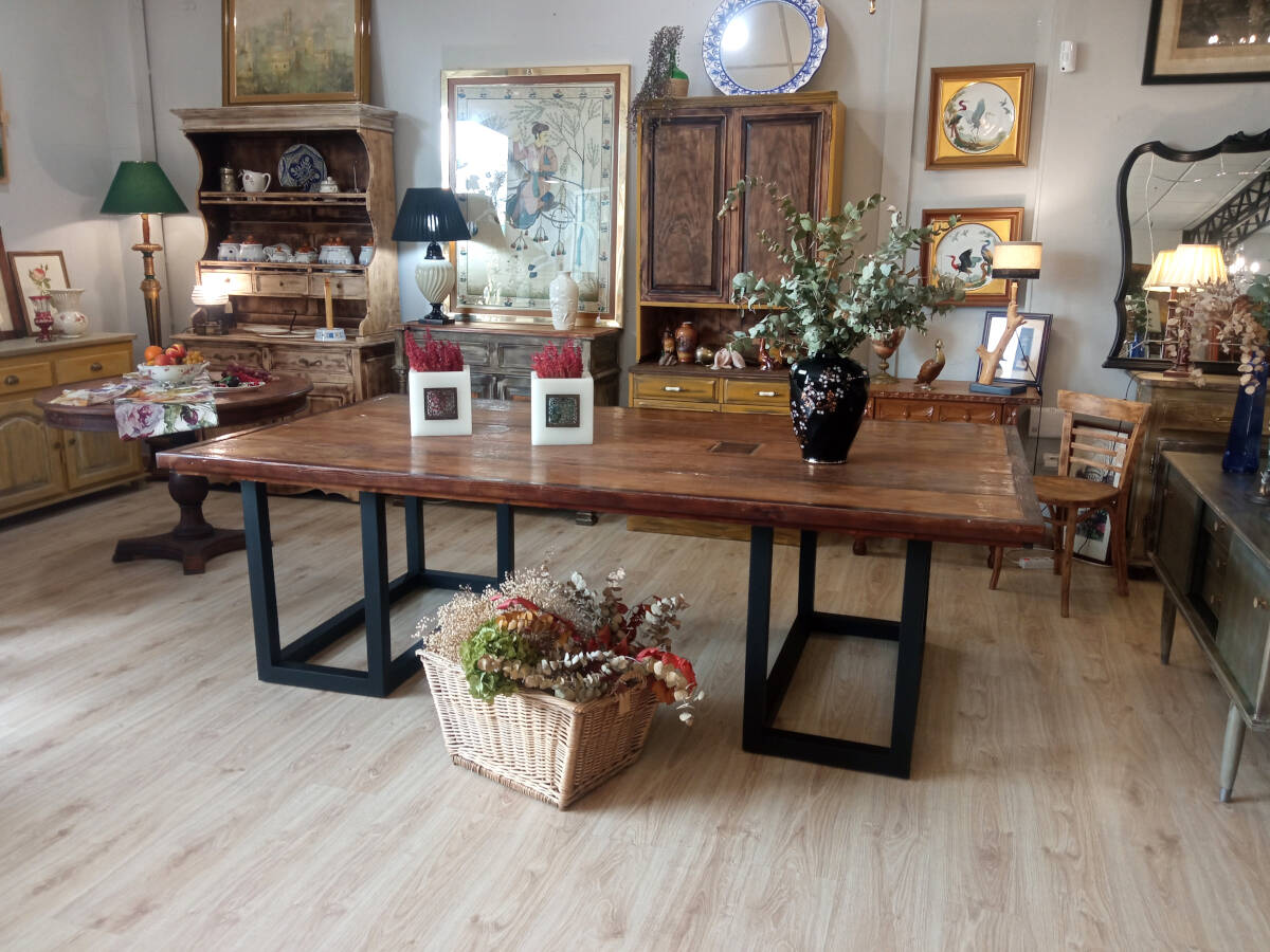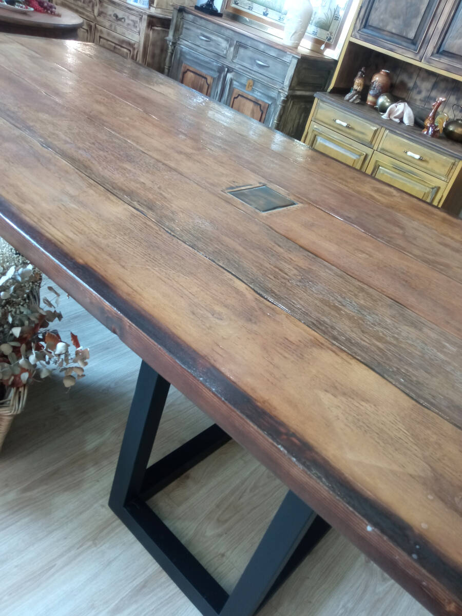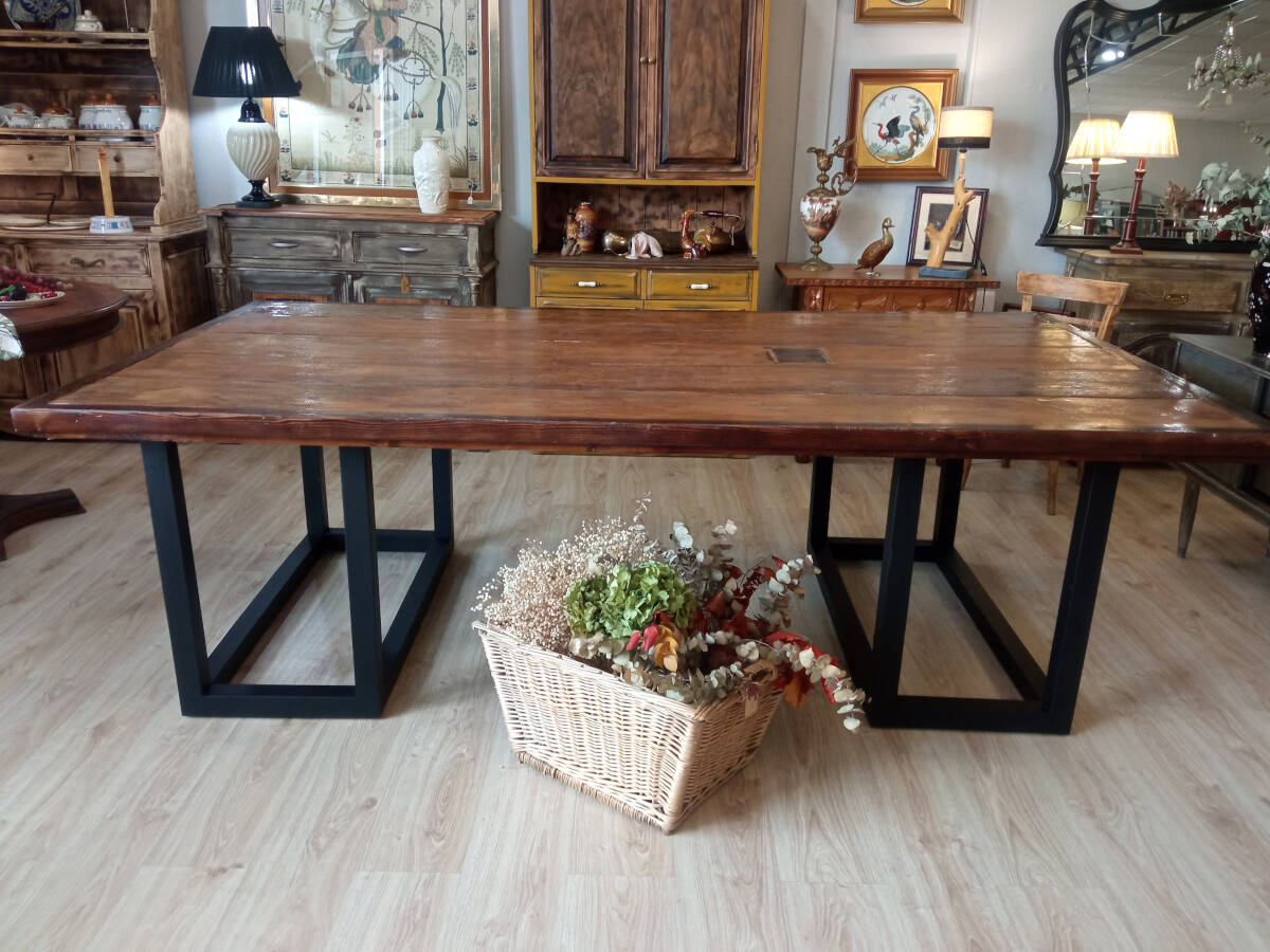 Esta espectacular mesa de comedor ha sido hecha con un portón antiguo de madera maciza de roble de mediados del siglo XX. El tablero ha sido restaurado minuciosamente, donde se puede apreciar las vetas de la madera y el detalle de la mirilla, preservando toda su esencia. Se apoya sobre dos estructuras de madera, pintadas en color negro que le aportan un diseño actual y atemporal. Esta mesa de grandes dimensiones, tiene un acabado de resina epóxica transparente, que le añade resistencia y durabilidad a esta pieza.