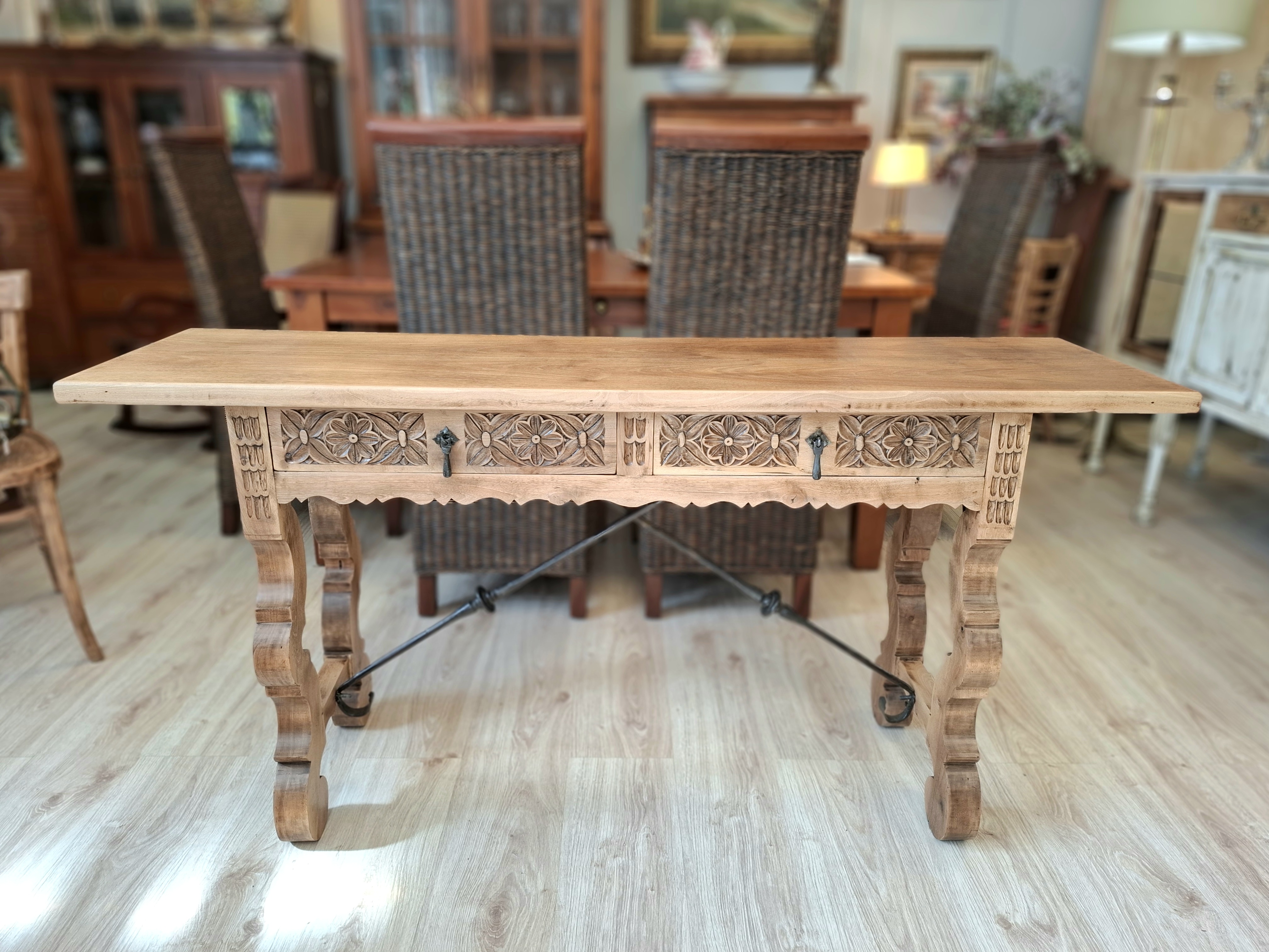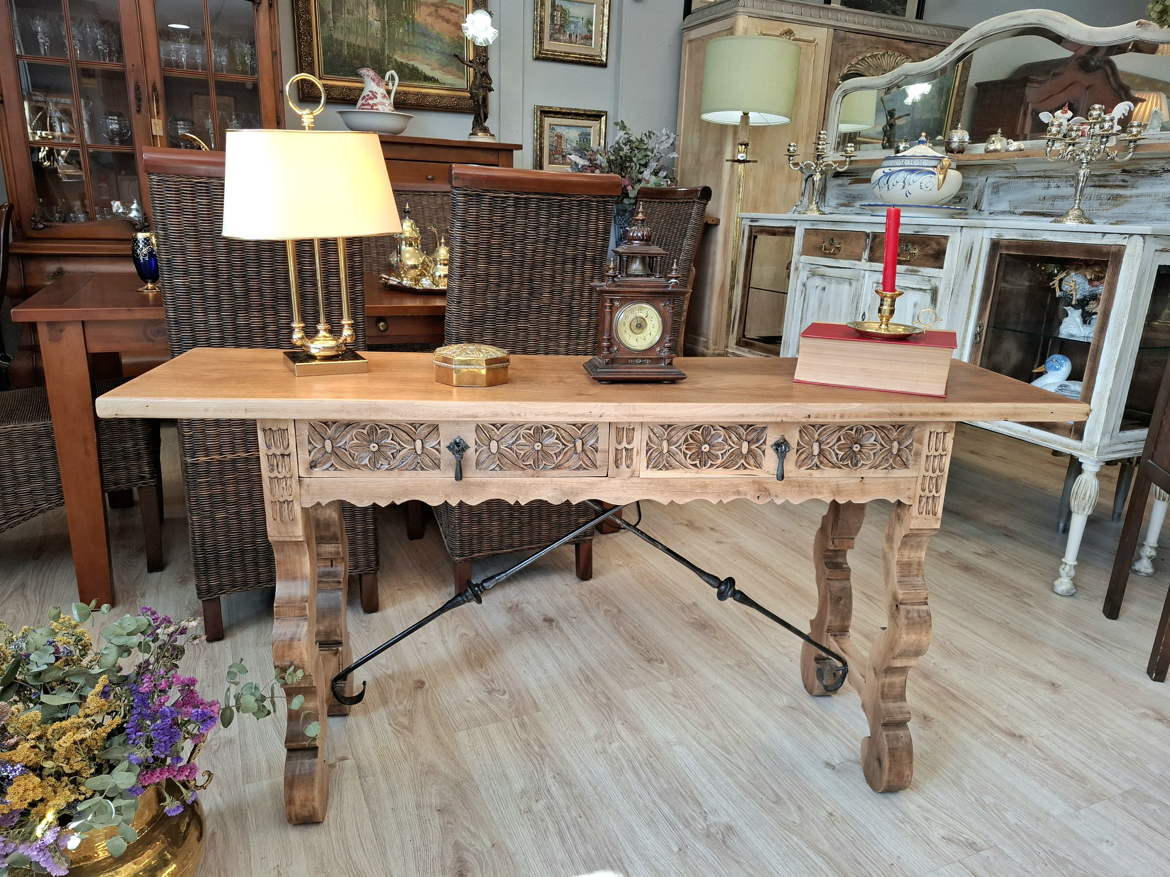 Elegante mesa o consola de estilo castellano, realizada en madera maciza de nogal finamente tallada. Su diseño robusto y artesanal destaca por el faldón con dos cajones decorados con motivos florales, rematados con tiradores de hierro. Las patas torneadas, están unidas por una cruceta de hierro fundido a juego con los tiradores, que refuerzan su estructura y le confieren un aire tradicional y atemporal. Esta pieza, datada a principios del siglo XX, ha sido cuidadosamente restaurada, recuperando la belleza de su madera natural y preservando su esencia original. Un mueble versátil que se puede utilizar incluso en un baño, ya que su tapa ha sido tratada para ello.