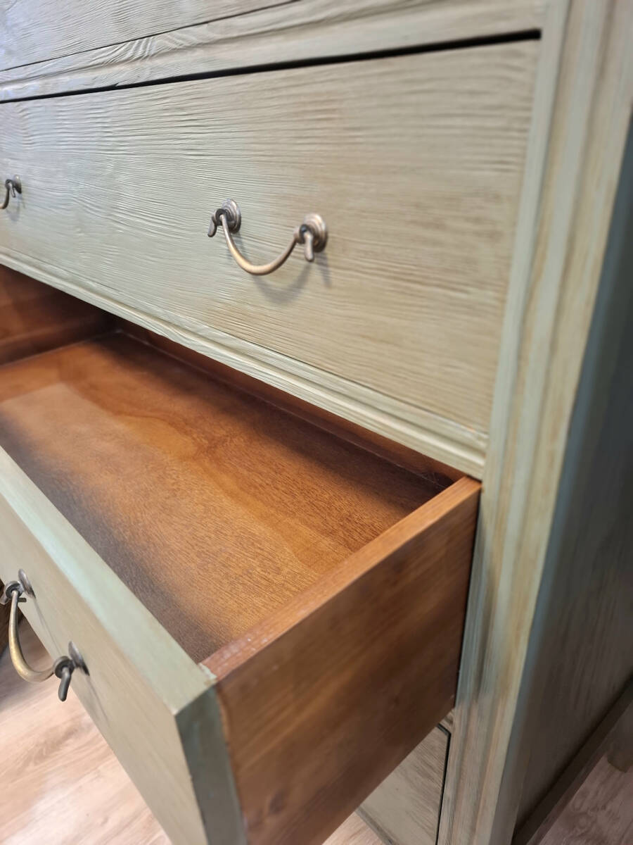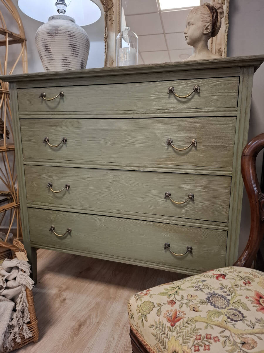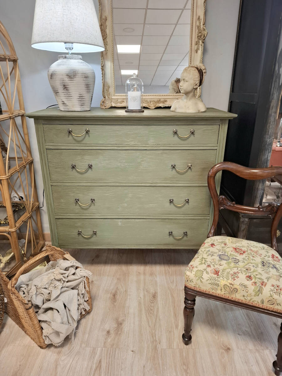 Cómoda antigua de madera maciza de pino, restaurada y acabada en un tono verde oliva envejecido. Presenta cuatro amplios cajones con tiradores metálicos curvos de estilo clásico. Su textura marcada y su diseño elegante la convierten en una pieza ideal para aportar carácter y calidez a cualquier espacio, desde dormitorios hasta recibidores.