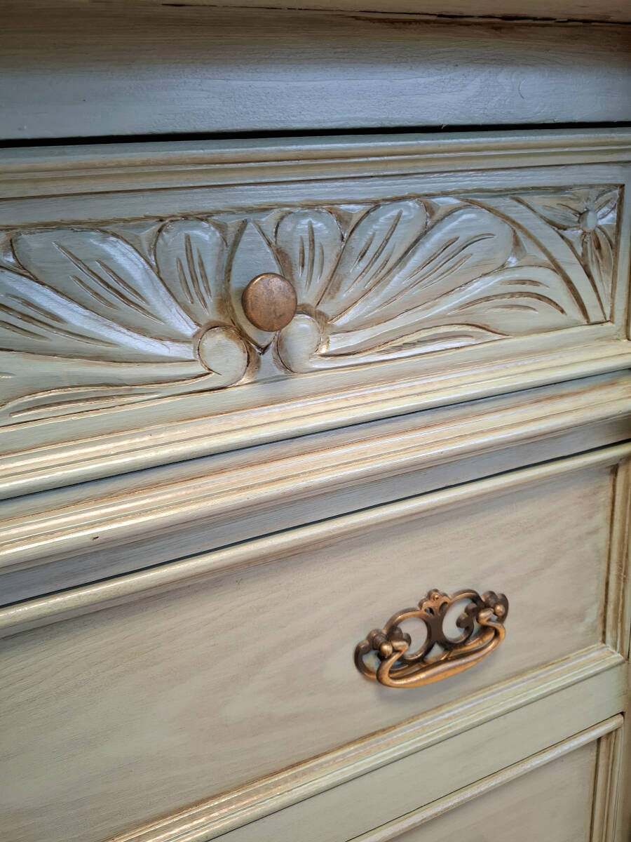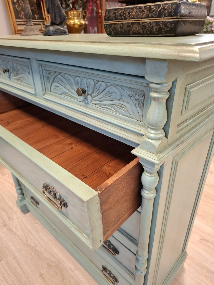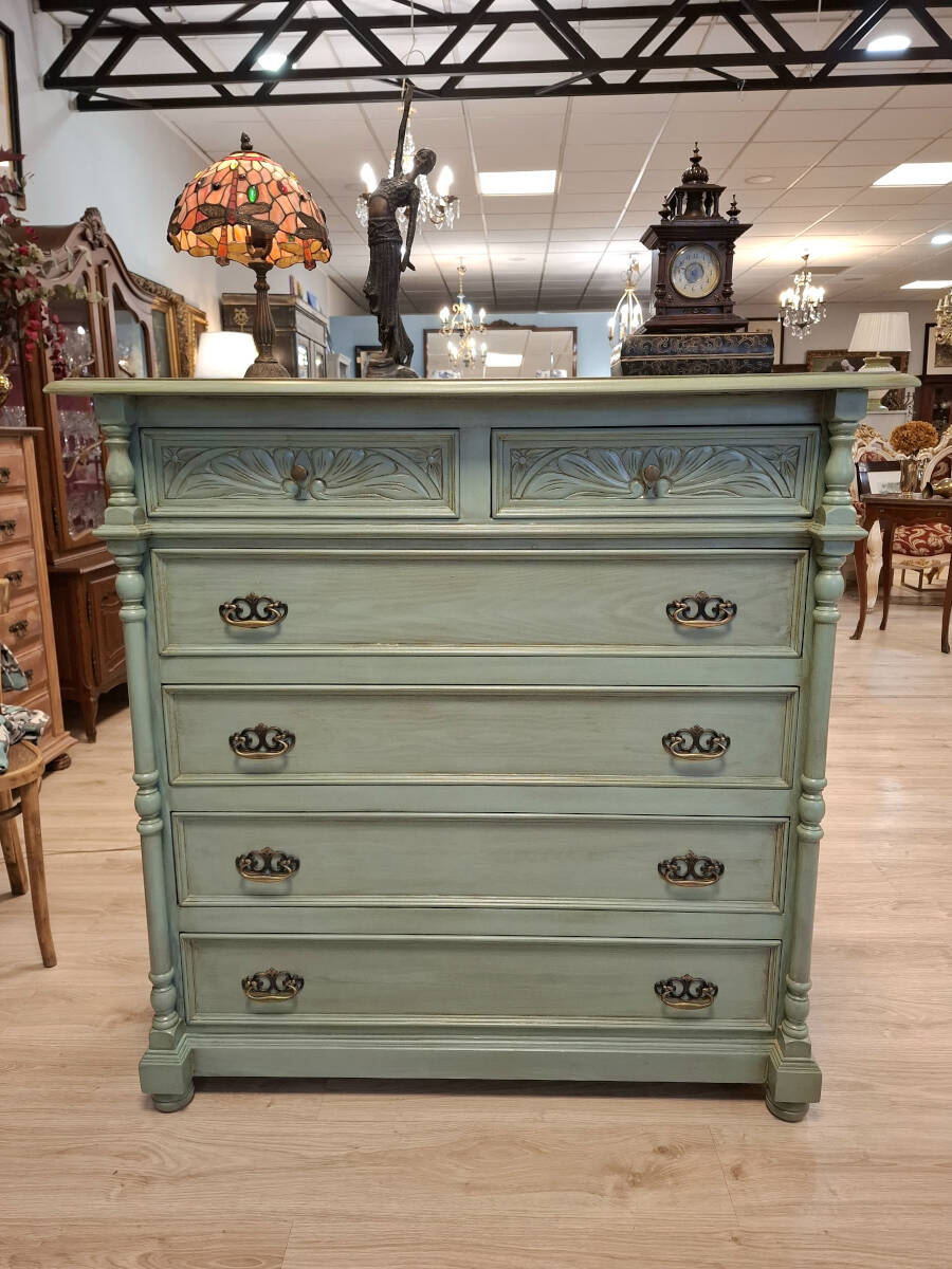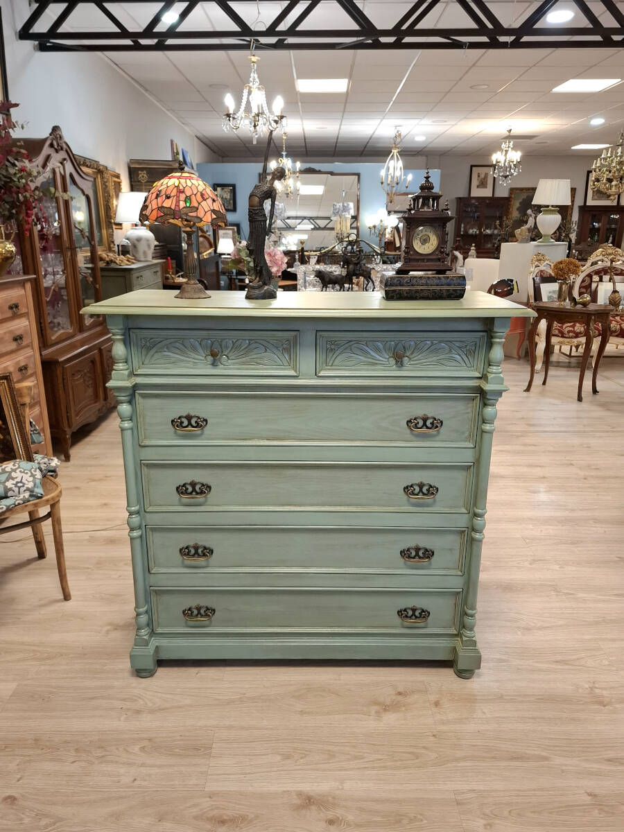 Elegante cómoda de estilo provenzal, elaborada en madera maciza de pino y patinada en un delicado tono verde azulado que realza su carácter vintage. Su diseño combina funcionalidad y encanto: cuenta con seis amplios cajones que ofrecen gran capacidad de guardado, destacándose los dos superiores con finos detalles tallados que aportan distinción y personalidad. Tiradores originales en metal envejecido.