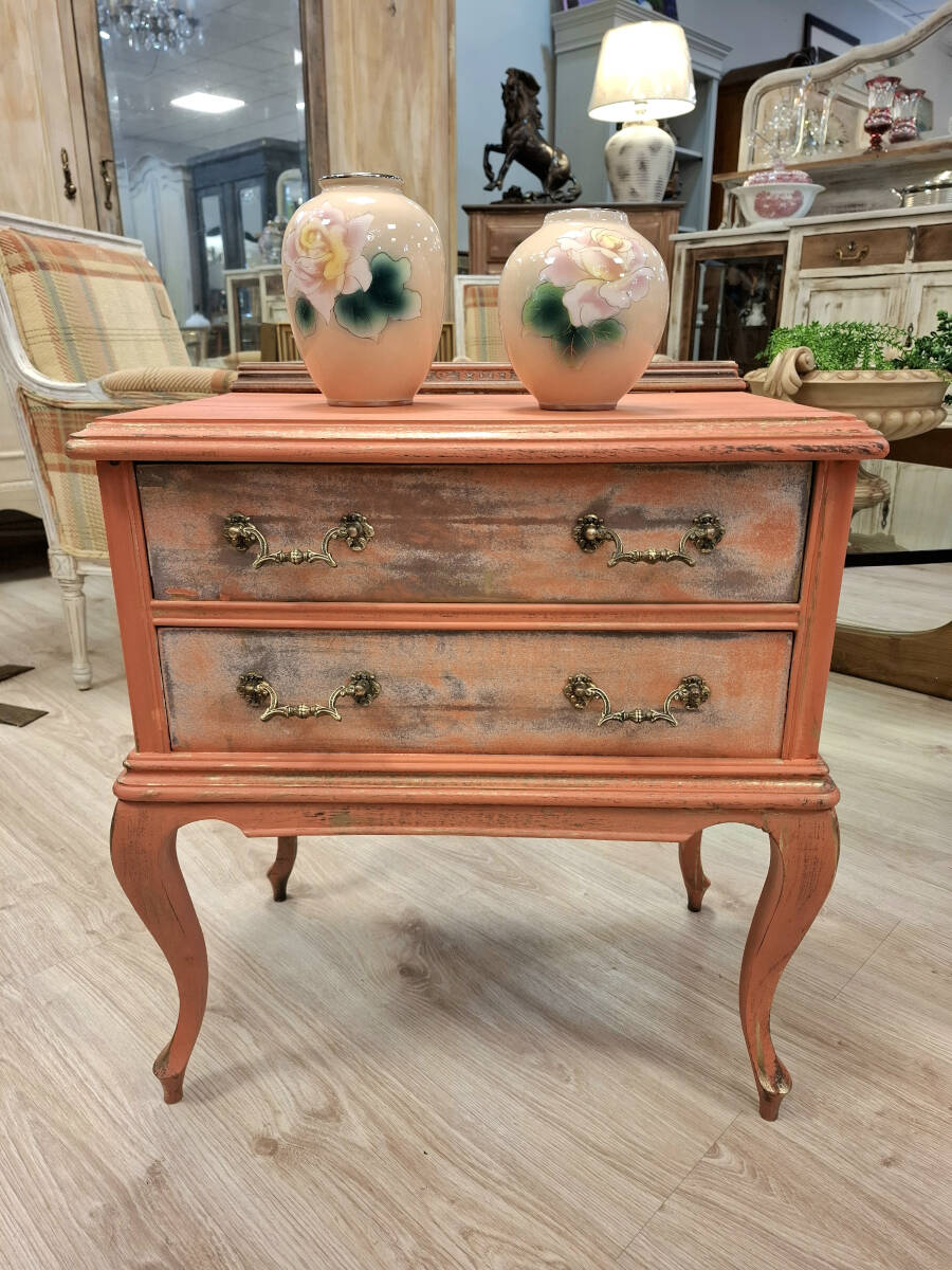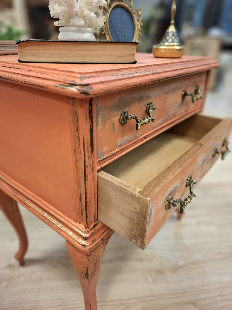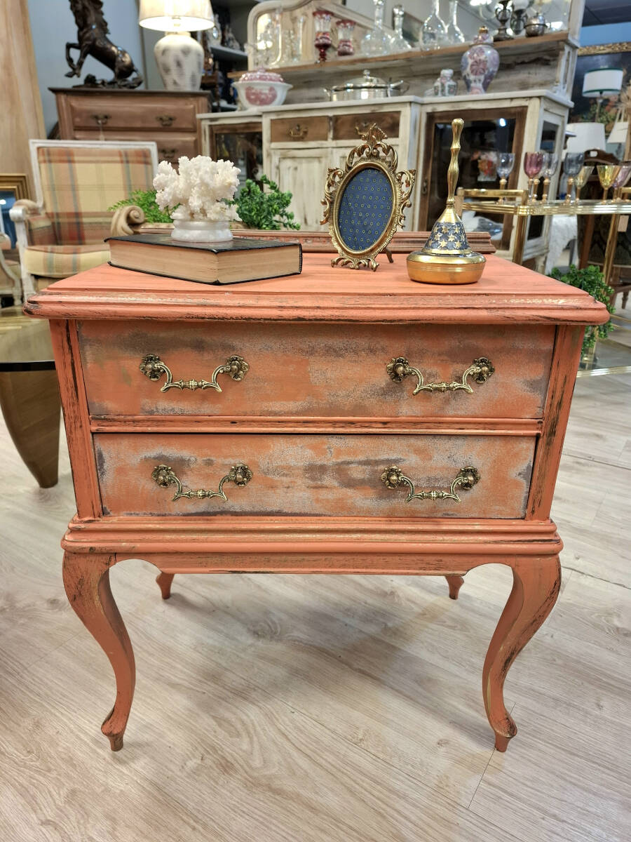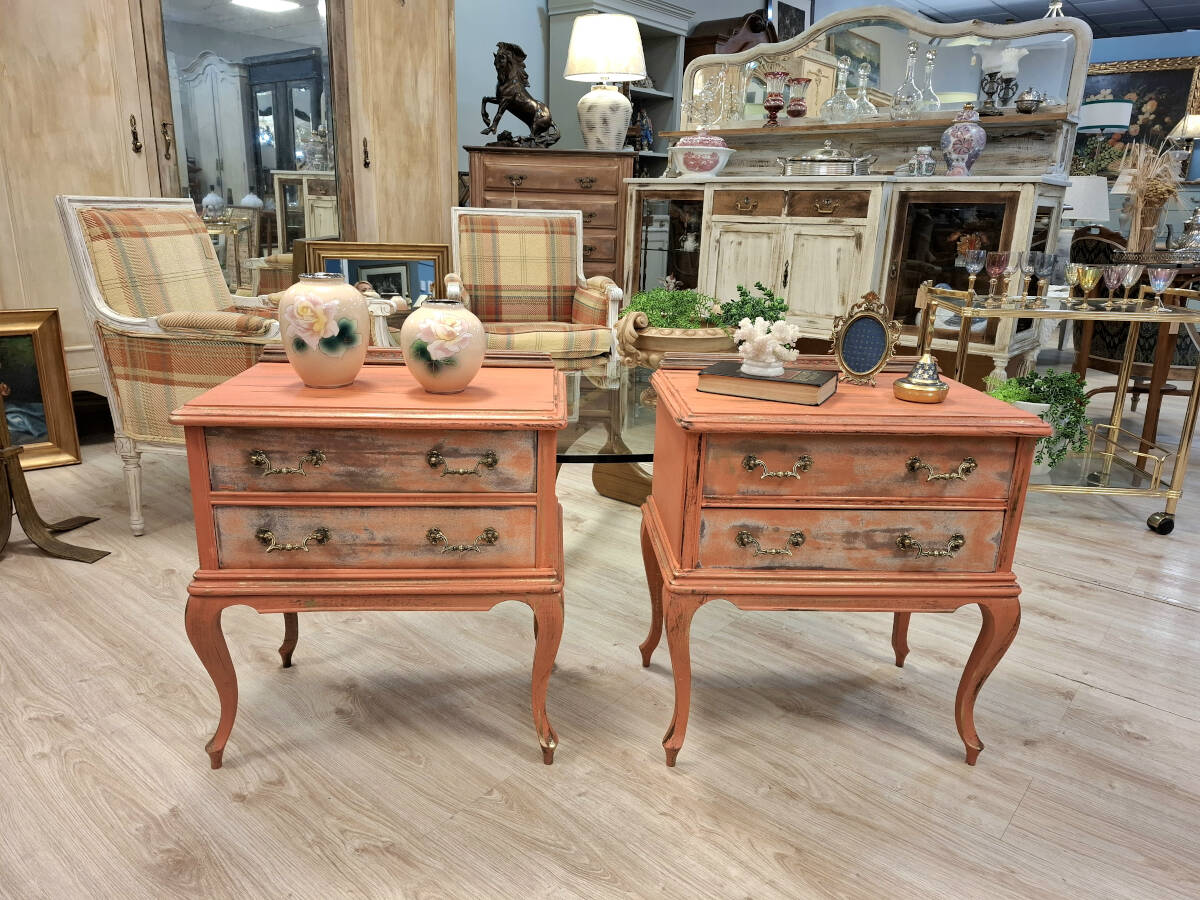 Pareja de mesillas de noche de estilo isabelino, fabricadas en madera maciza noble. Han sido restauradas en un original color calabaza efecto decapé, consiguiendo con ello, una combinación ideal de elegancia clásica con un toque vintage. Sus líneas curvas y sofisticadas, su moldura decorativa y sus tiradores dorados le aportan un aire cálido y actual a estas maravillosas mesitas.