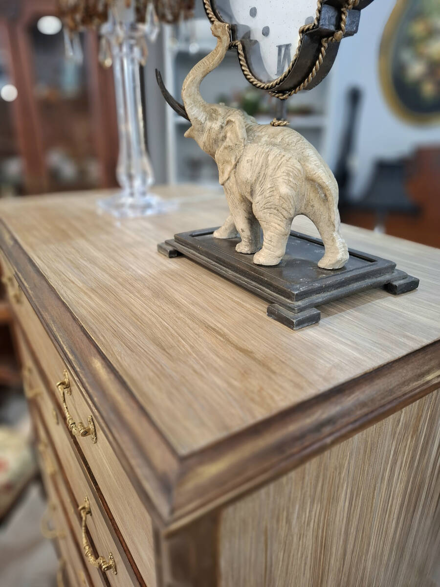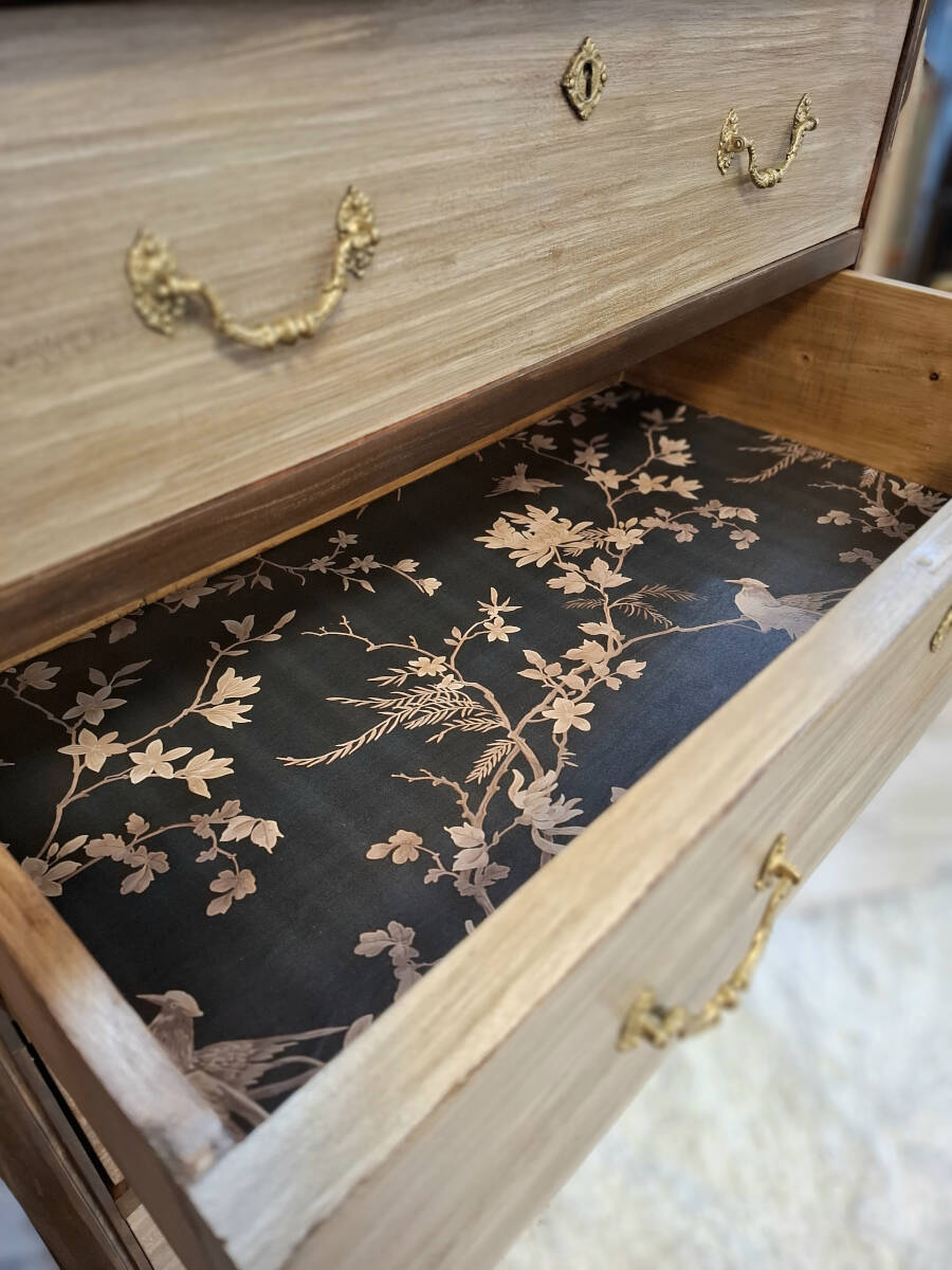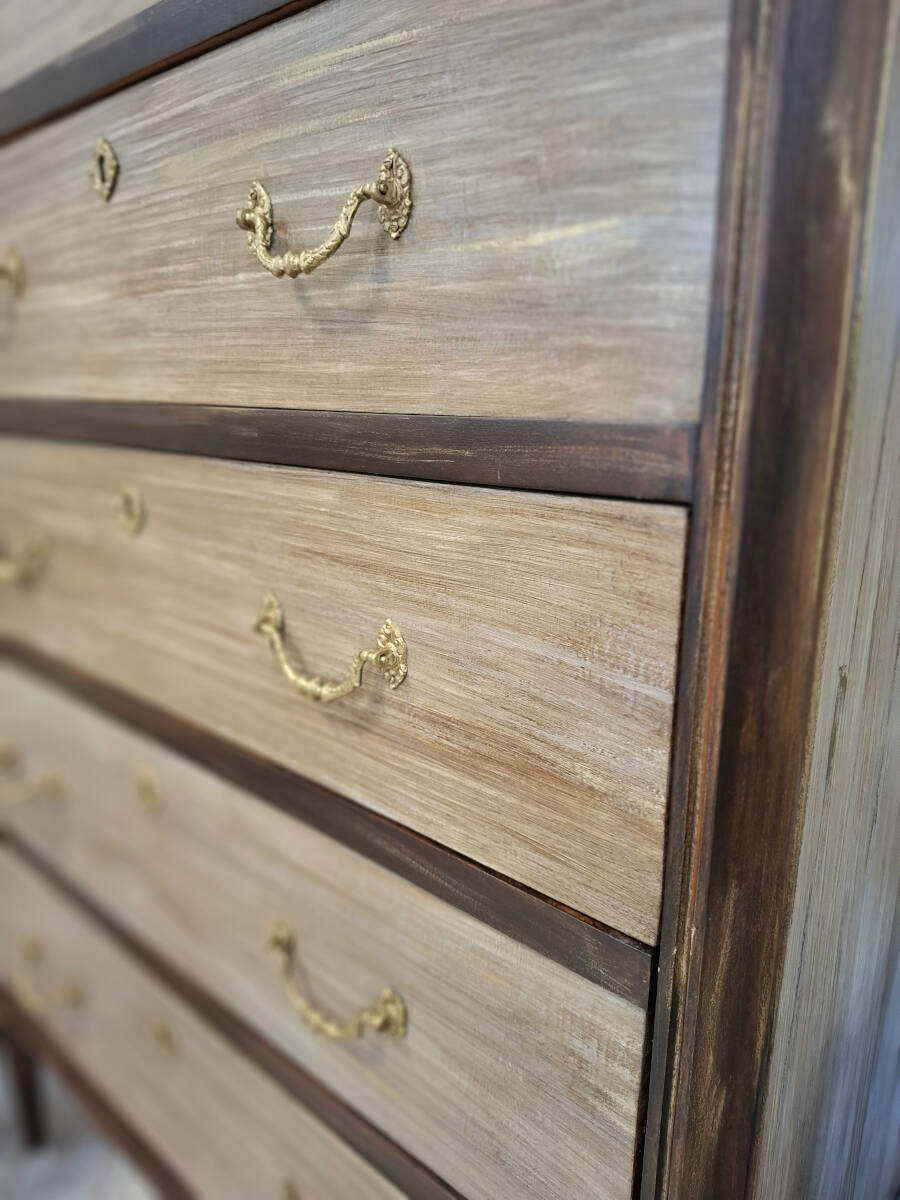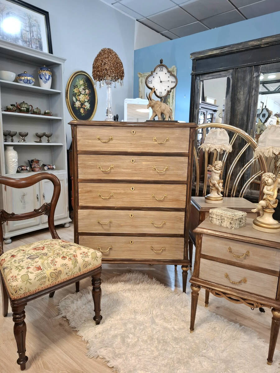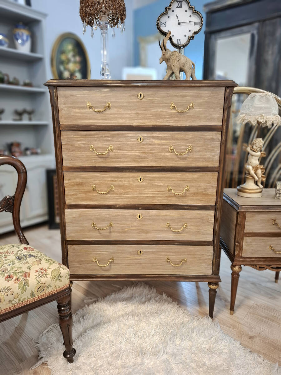 Elegante sinfonier vintage de cinco cajones, elaborado en auténtica madera de haya. Esta pieza antigua ha sido cuidadosamente restaurada en tonos tierra, con sutiles detalles dorados que realzan su carácter y sofisticación. El interior de los cajones ha sido forrado con un refinado papel pintado en tonos castaño y negro, que armoniza a la perfección con la calidez de la madera, aportando un toque de distinción incluso en su parte más íntima. Una joya decorativa con historia, perfecta para dar calidez y estilo a cualquier espacio.