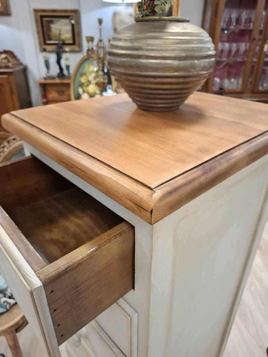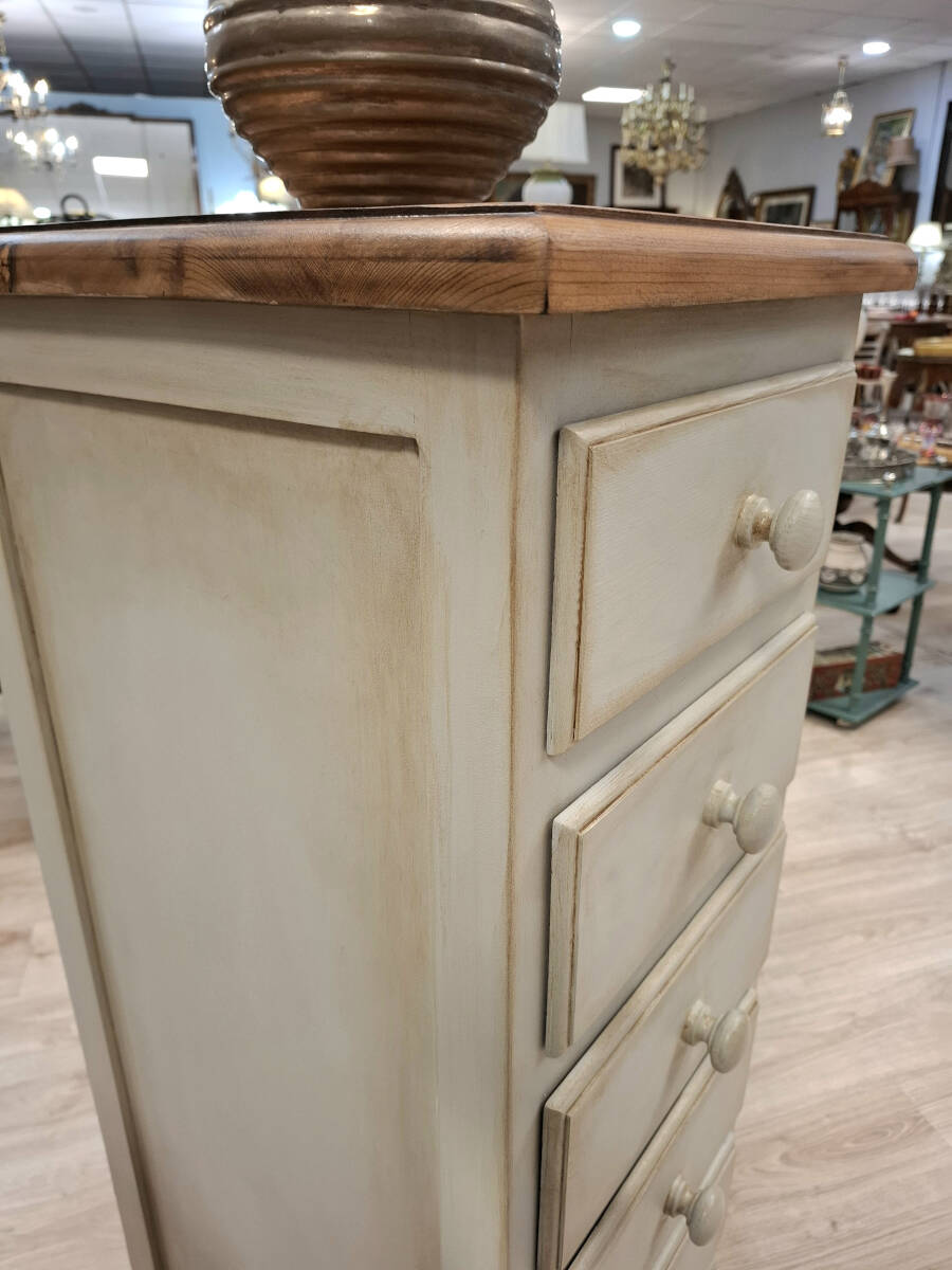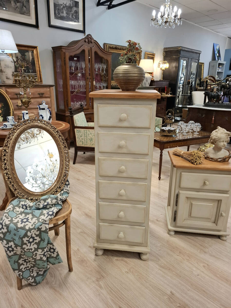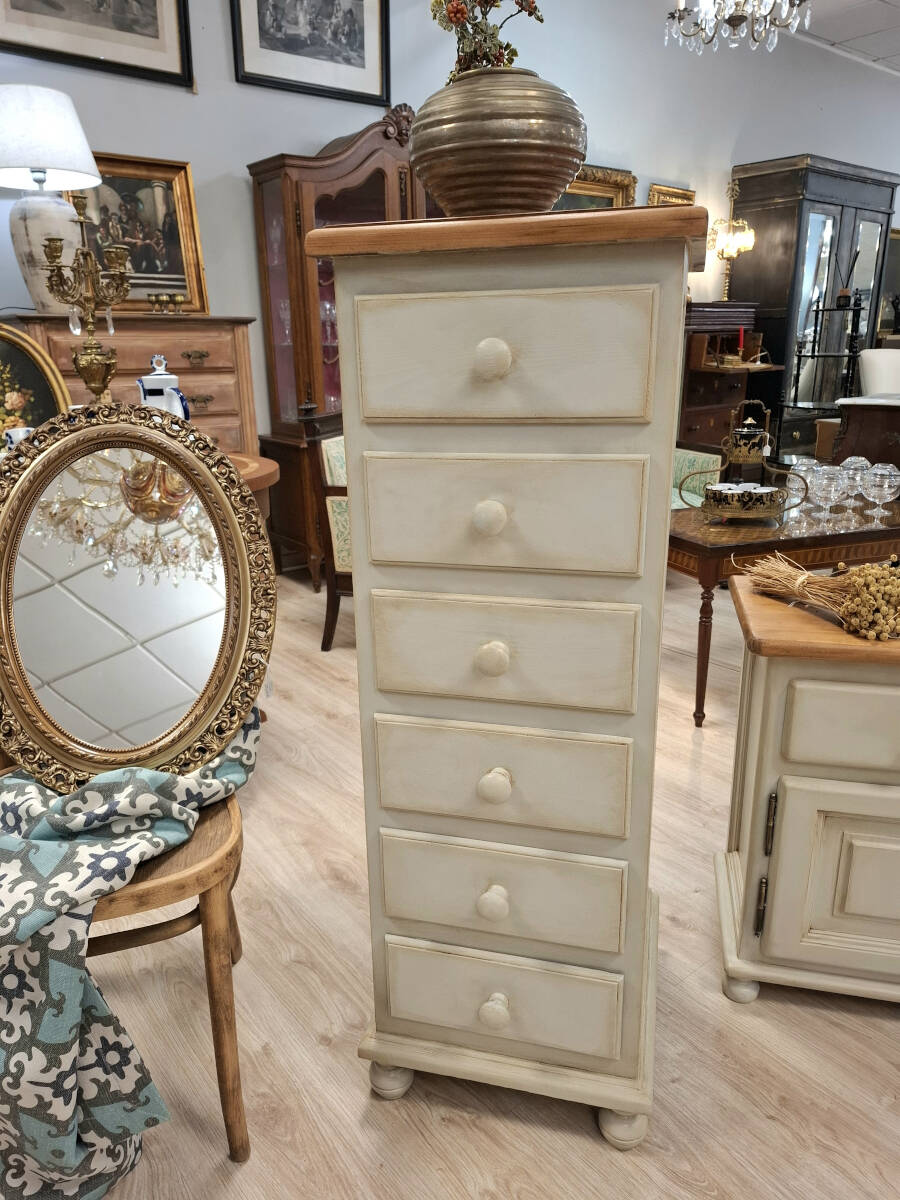 Elegante sinfonier de estilo provenzal realizado en madera maciza de pino, patinado en blanco antiguo con sobre en madera natural tono miel. Mueble robusto y funcional, con seis cajones y cómodos tiradores redondos a juego.