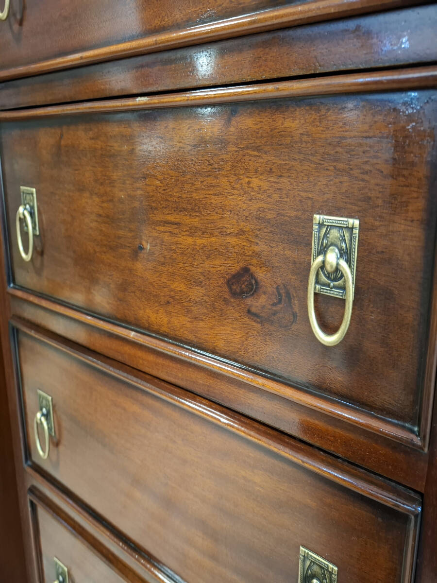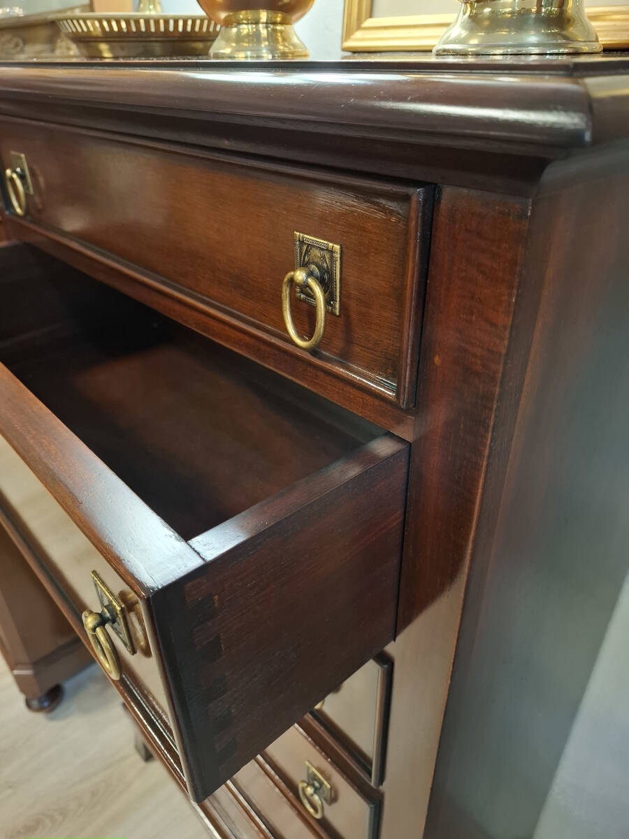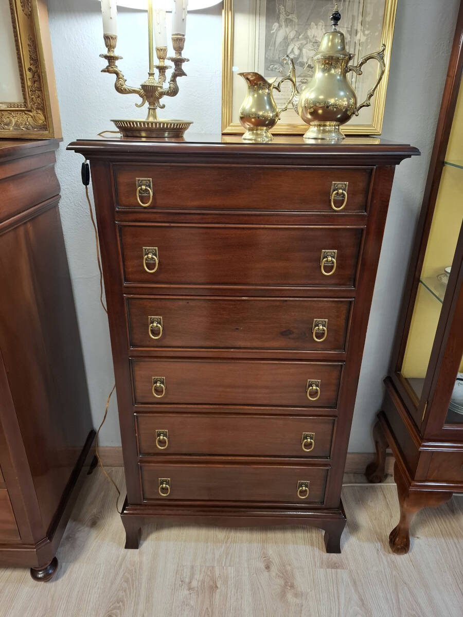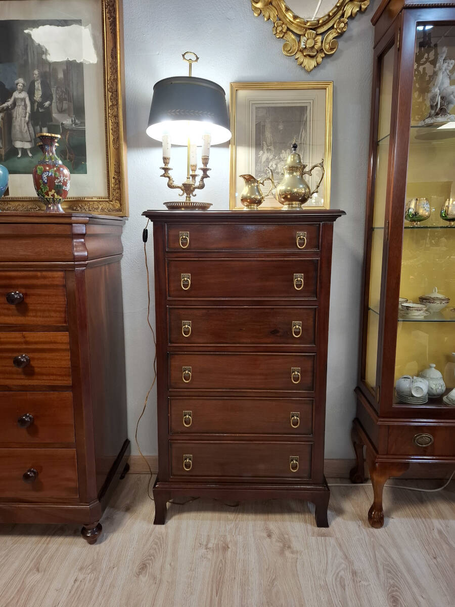 Elegante sinfonier de refinado estilo inglés fabricado en madera de caoba. Dispone de seis amplios cajones ensamblados con cola de milano, lo que garantiza su durabilidad. Conserva sus tiradores originales de anilla en metal dorado con placas decorativas labradas. Esta pieza combina funcionalidad y distinción, siendo ideal para ambientes clásicos y sofisticados. Se encuentra en excelente estado de conservación.