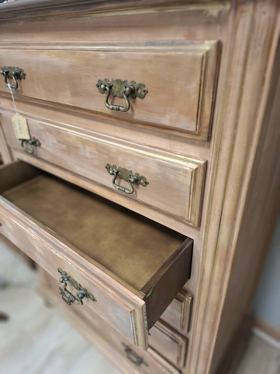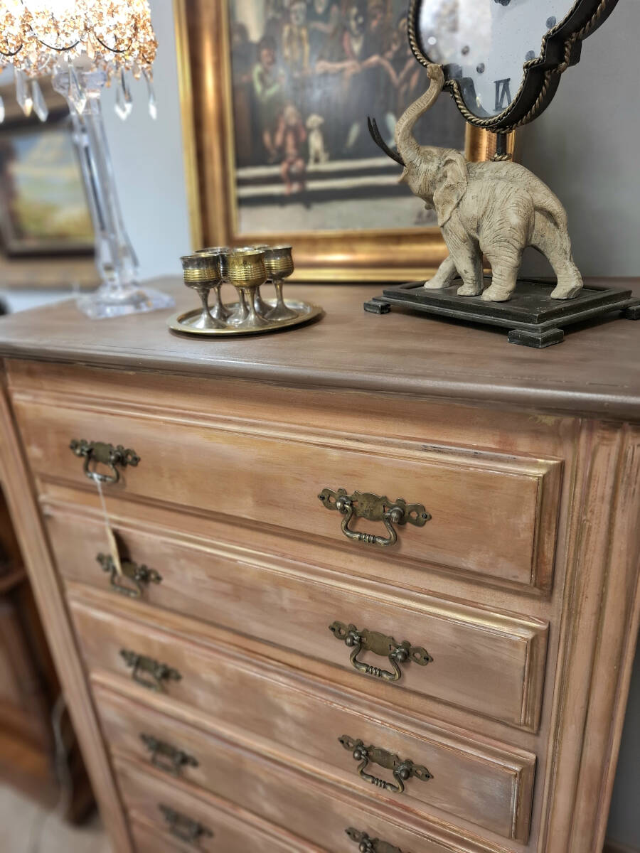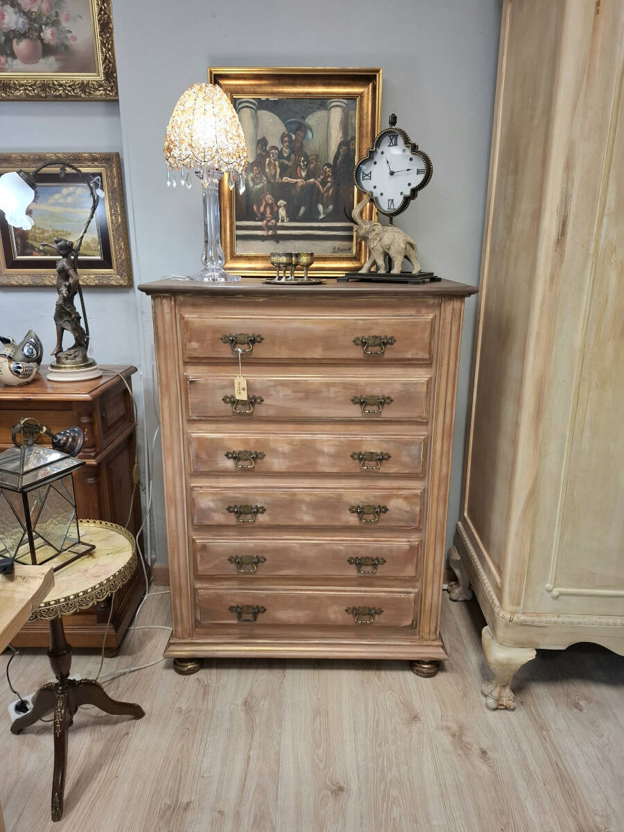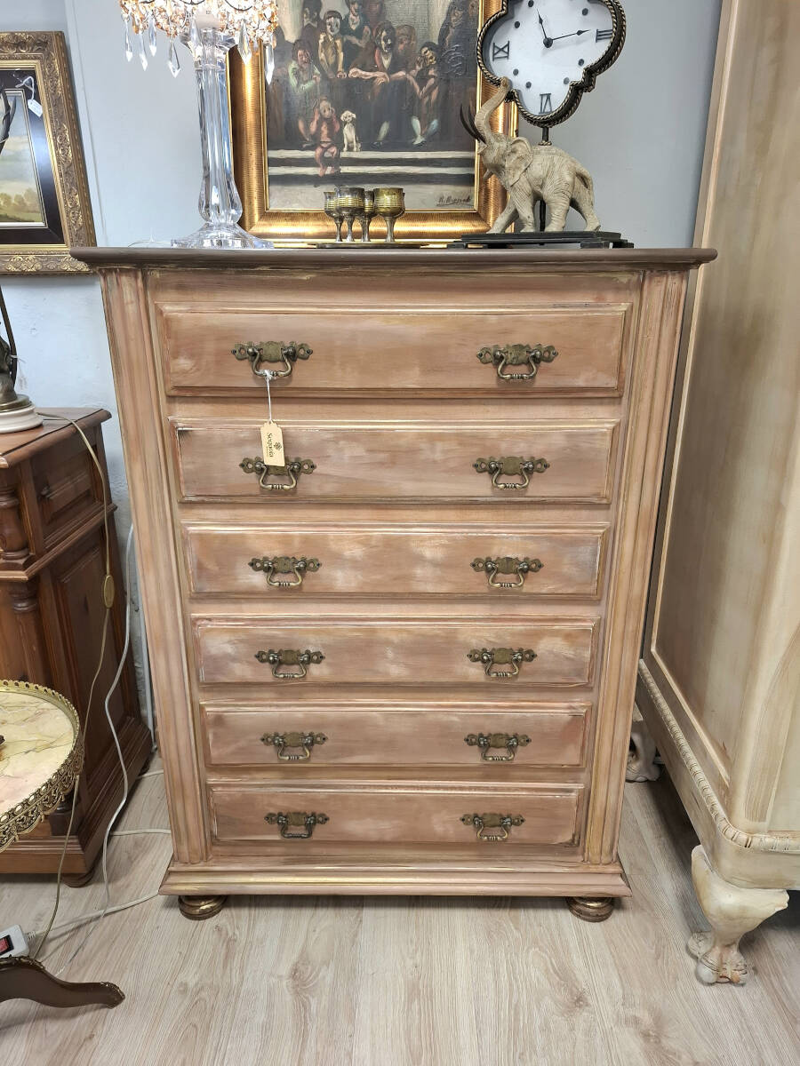 Sinfonier de seis amplios cajones de madera restaurado en tonos ocres, con un acabado efecto decapado. El interior conserva el tono natural de la madera. Tiradores originales metálicos. Un mueble que aportará un toque vintage a la decoración de tu hogar.
