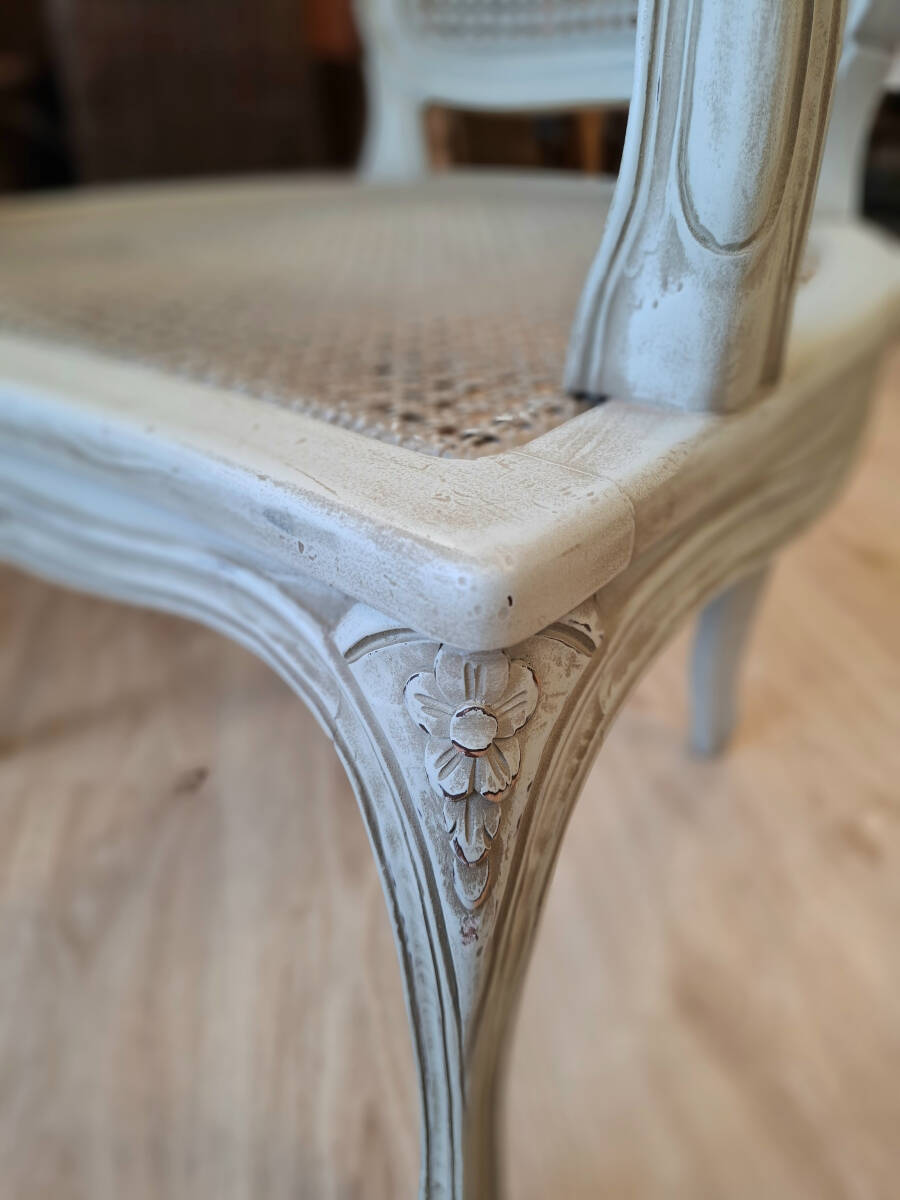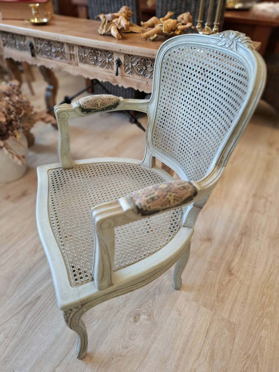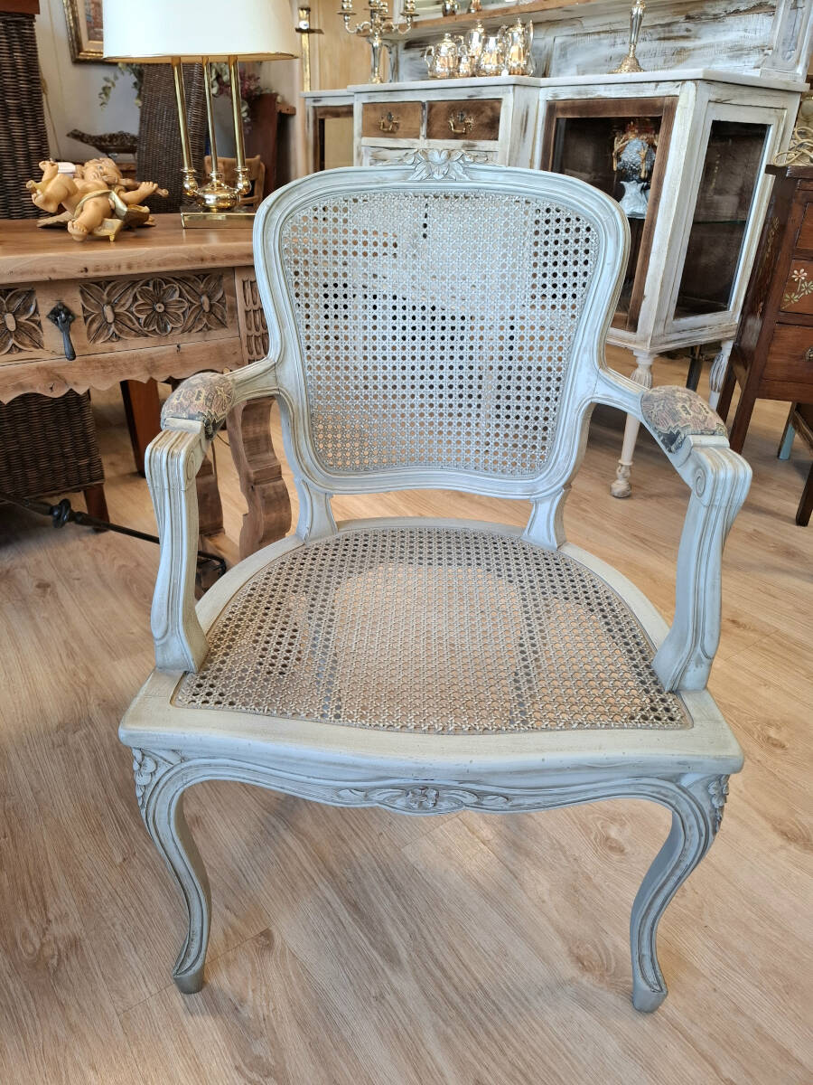 Elegante sillón o butaca antigua de estilo Luis XV, con asiento y respaldo de rejilla original. Restaurada y renovada, presenta un acabado envejecido en tono verde pastel que realza su carácter vintage. Los reposabrazos han sido retapizados para aportar mayor confort, conservando la esencia clásica de la pieza. Perfecta para decorar un rinconcito de lectura, un dormitorio con encanto o como acento especial en el salón.