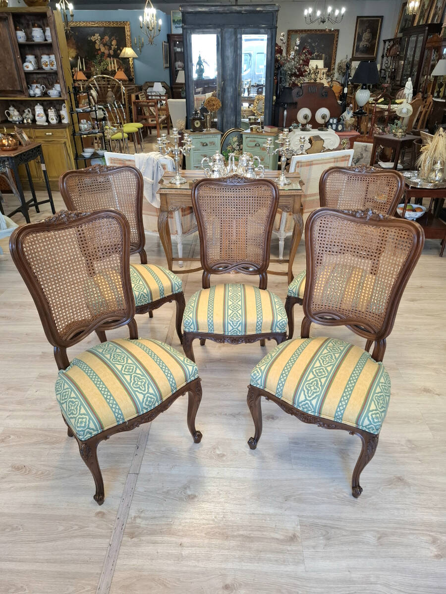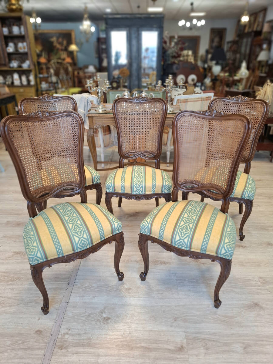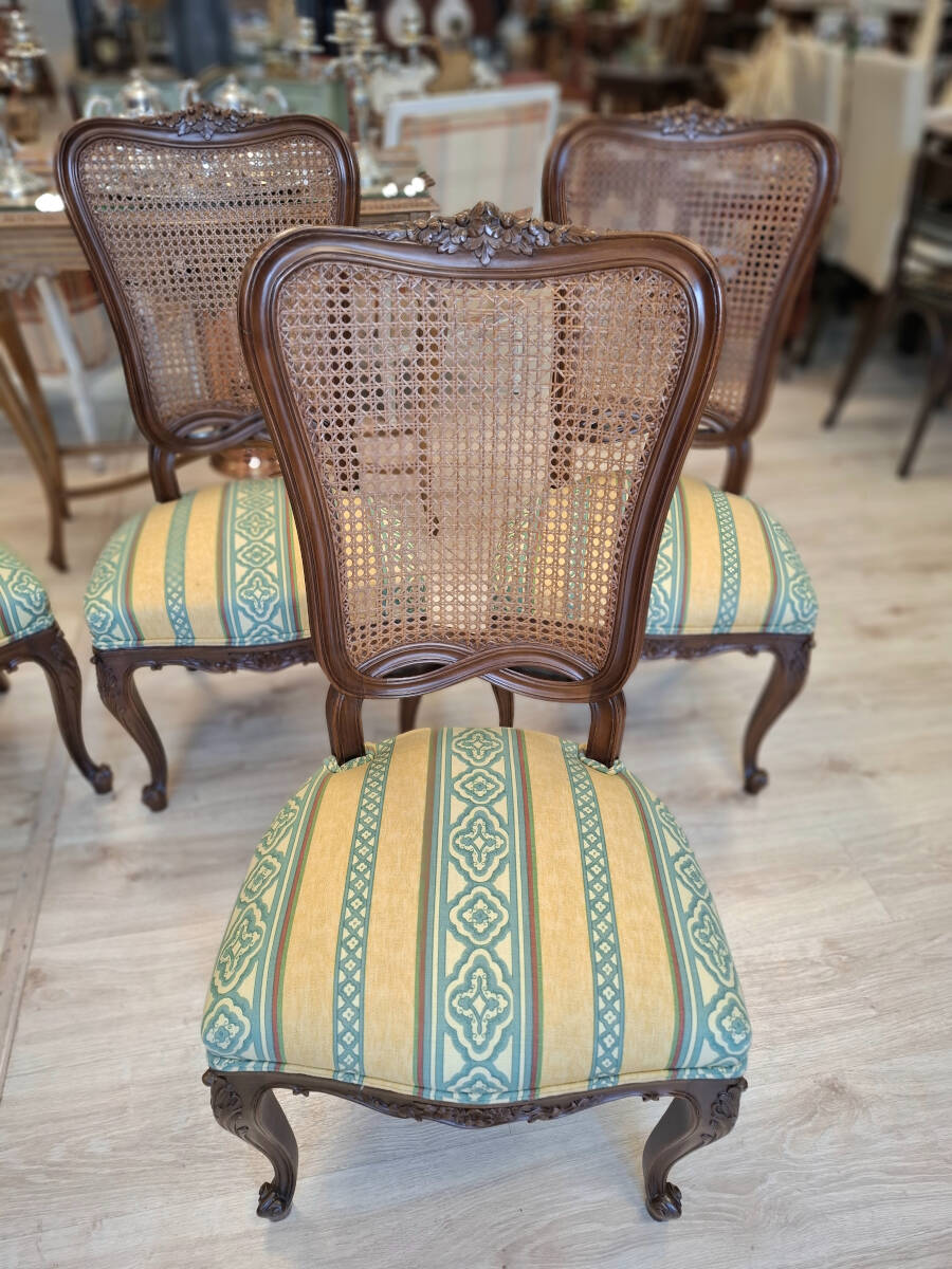 Bellísimas sillas de madera maciza de nogal, con respaldo de rejilla y asientos retapizados. Estas cinco sillas vintage de estilo Luís XV, están finamente talladas con adornos florales y vegetales. El respaldo presenta un diseño distintivo en la parte inferior, donde un delicado entrelazado revela la auténtica maestría artesanal de la época. Sus estructuras conservan una presencia refinada y atemporal. Los asientos han sido recientemente retapizados. Estas sillas se encuentran en excelente estado de conservación, perfectas para colocar en cualquier salón o comedor.
