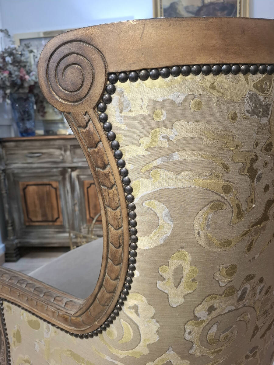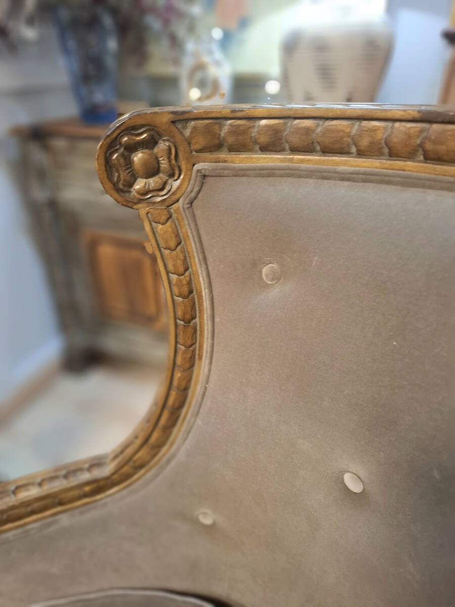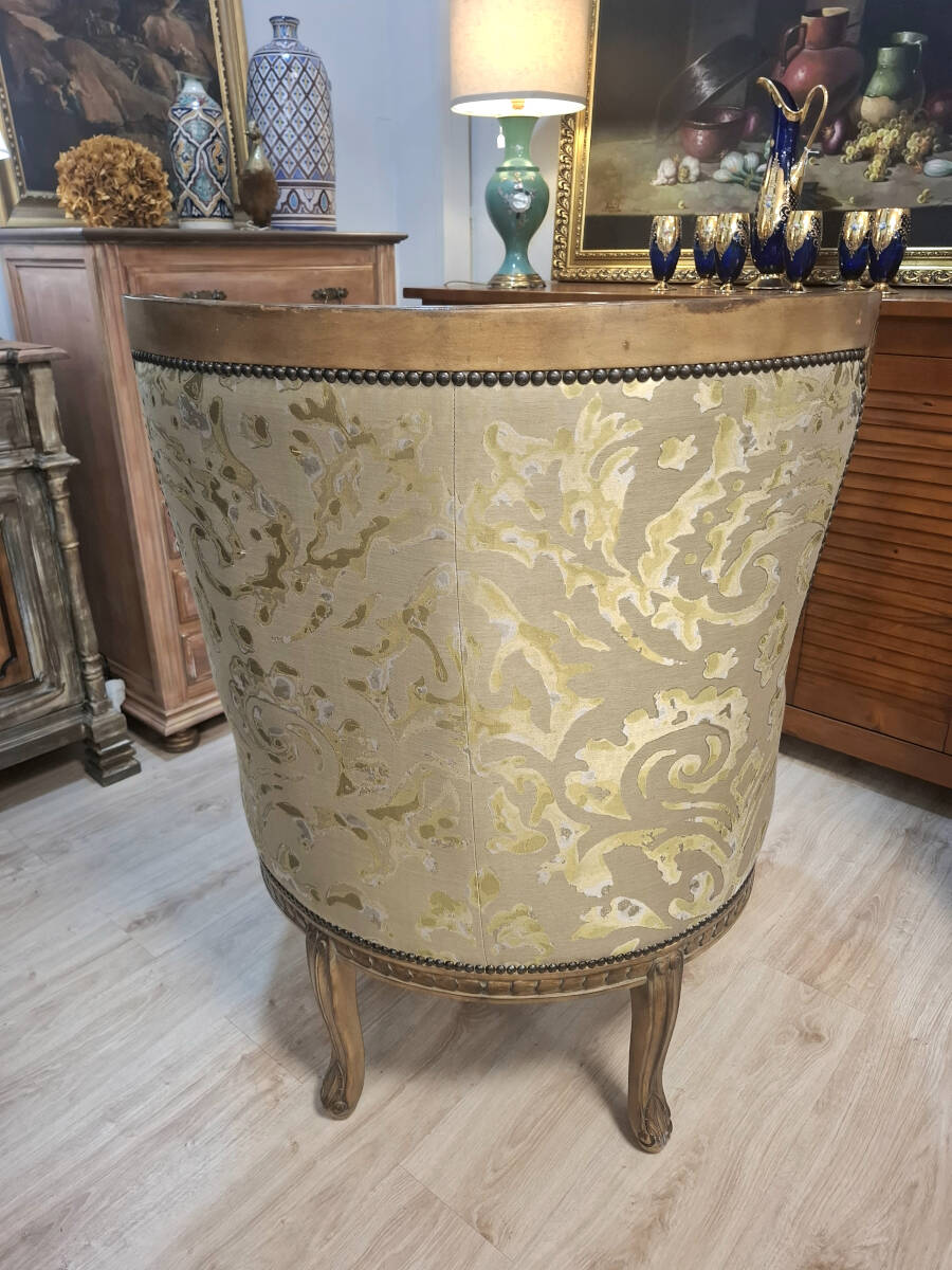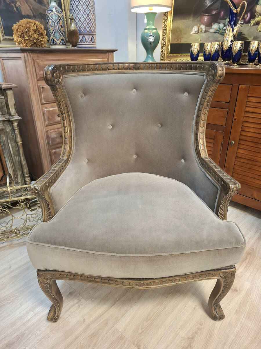 Elegante sillón estilo Luís XV con estructura de madera tallada, con acabado envejecido. Su diseño combina un tapizado frontal en terciopelo gris topo con un respaldo en tela jacquard de tonos verde y dorados, realzado con tachuelas, creando así un contraste refinado y sofisticado. Ideal para salas, recibidores, rincones de lectura o ambientes decorativos tradicionales, vintage o shabby chic.