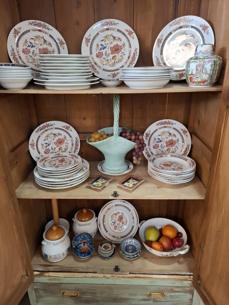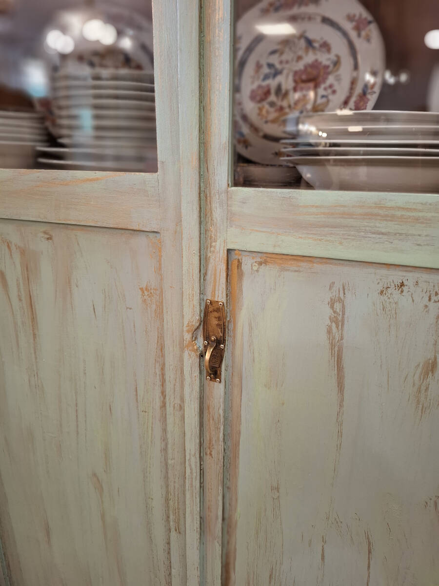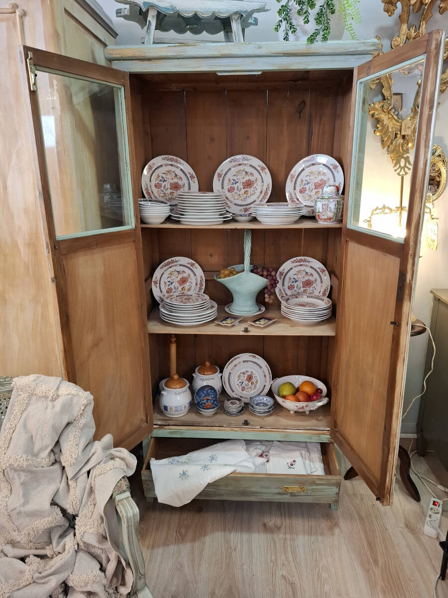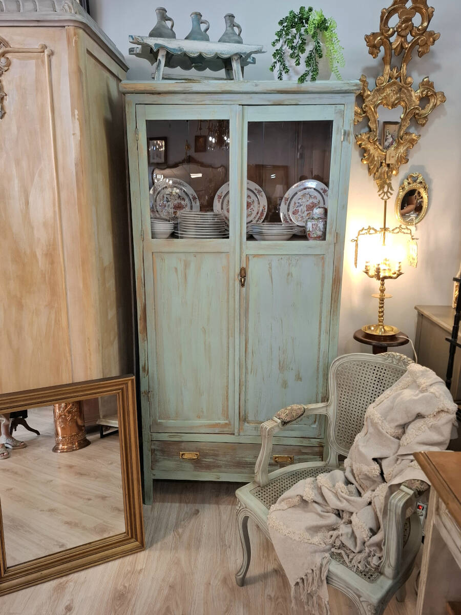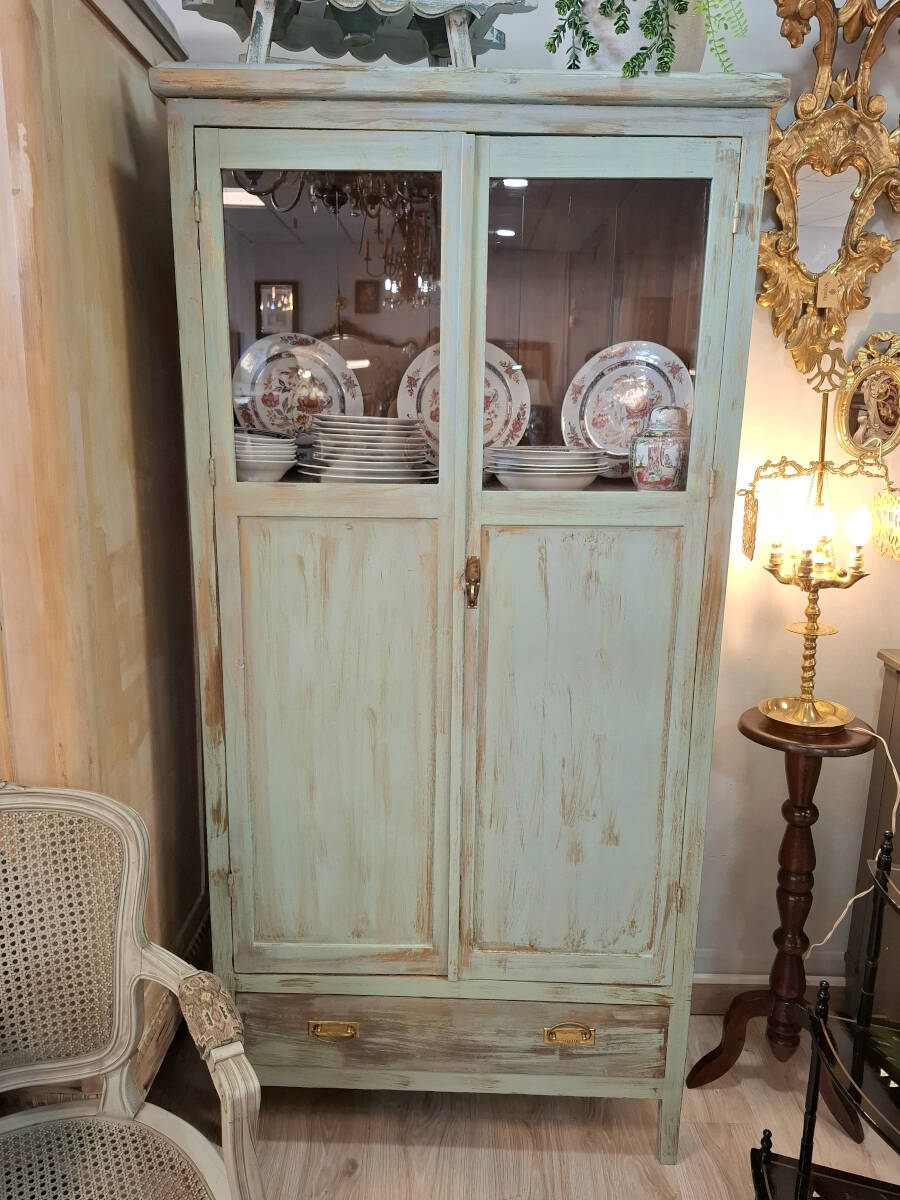 Preciosa alacena antigua restaurada, pintada en un delicado tono verde turquesa con sutiles detalles dorados que realzan su encanto vintage. Su diseño incorpora dos puertas de madera con parte superior acristalada, que permiten lucir su interior en madera natural, equipado con dos baldas que ofrecen una amplia capacidad de almacenaje. En la parte inferior, un práctico cajón resulta ideal para guardar mantelerías u otros textiles. Gracias a su estructura estrecha y su estilo atemporal, este mueble versátil se adapta a distintos espacios: ya sea como vitrina para vajillas, armario para ropa de cama o como funcional despensero. Una pieza única que combina estética y utilidad en cualquier rincón del hogar.