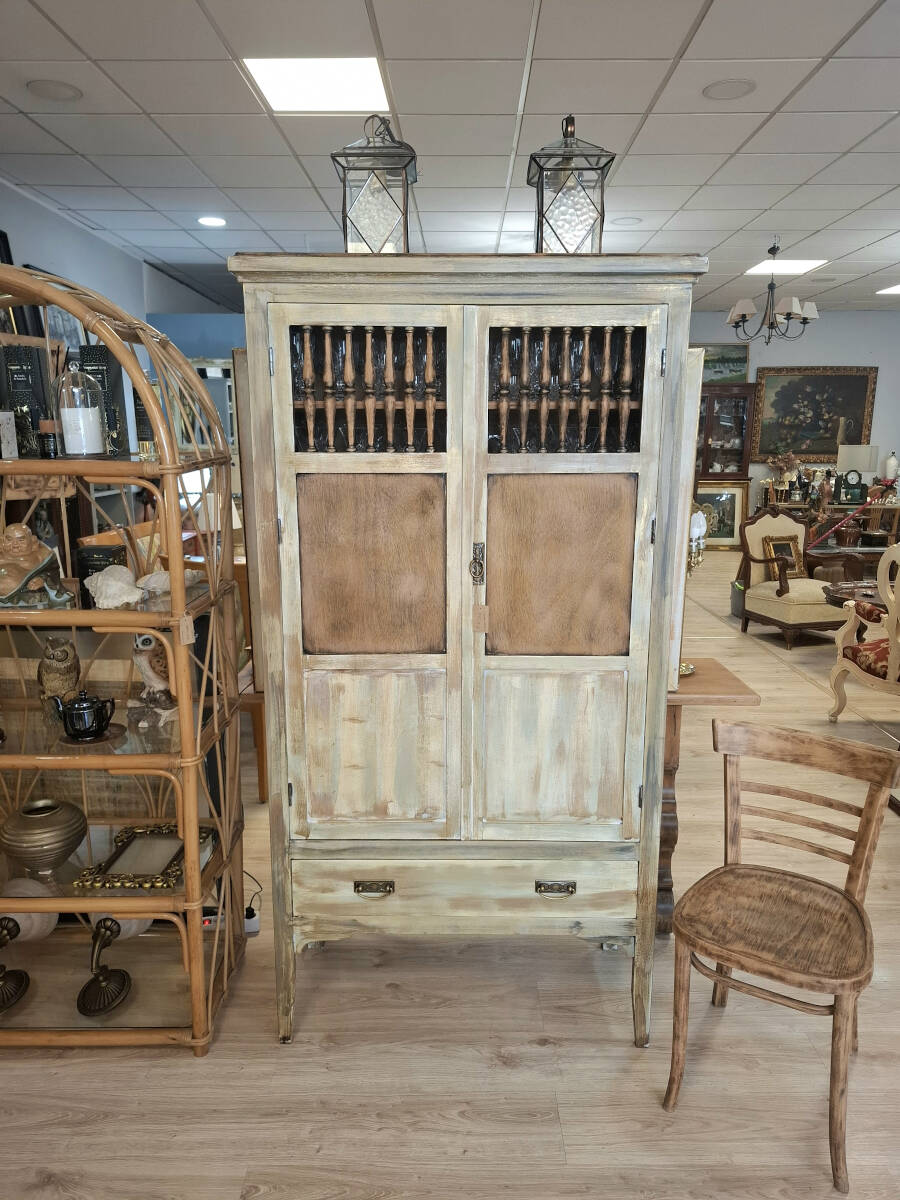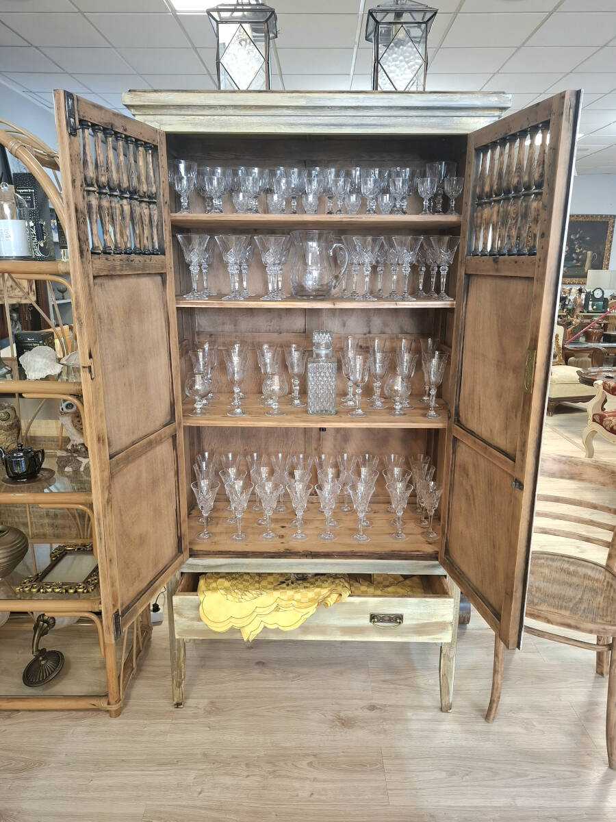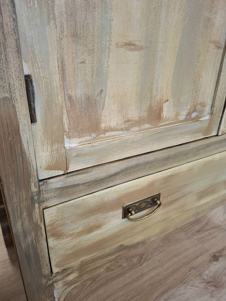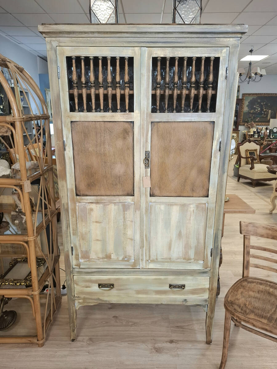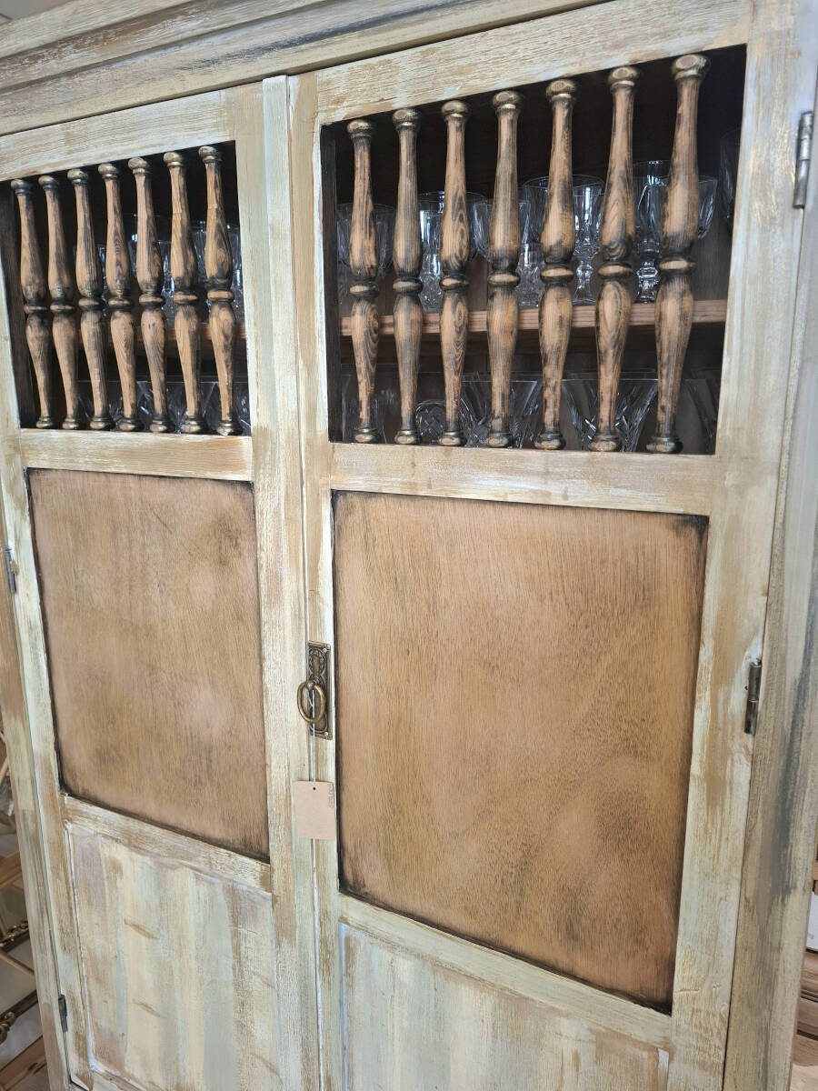 Antigua alacena o mueble sabanero castellano de madera noble, restaurado y renovado en tonos tierra que resalta su carácter rústico y elegante. La parte superior está compuesta por dos puertas ciegas, adornadas con delicados elementos torneados que aportan distinción al diseño. En su interior, tres baldas de la misma madera ofrecen amplio espacio de almacenaje, combinando funcionalidad y estética. La parte inferior del mueble alberga un cajón rematado con originales tiradores en metal dorado, que aportan un sutil contraste decorativo. Las esbeltas patas completan su silueta con un aire ligero y refinado, haciendo de este mueble una pieza única, ideal para aportar carácter y autenticidad, a cualquier ambiente.