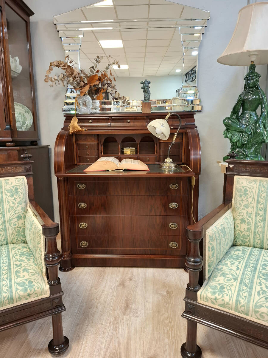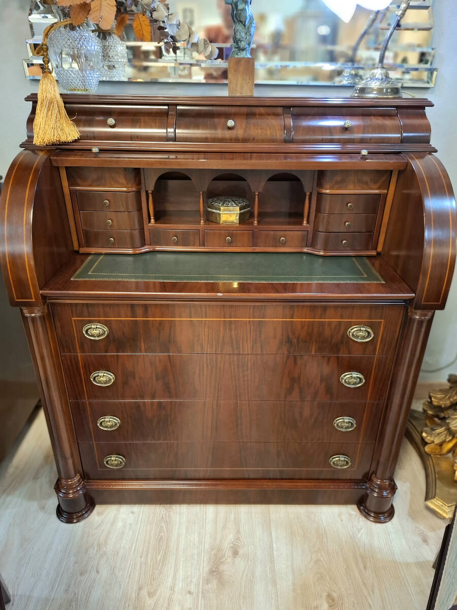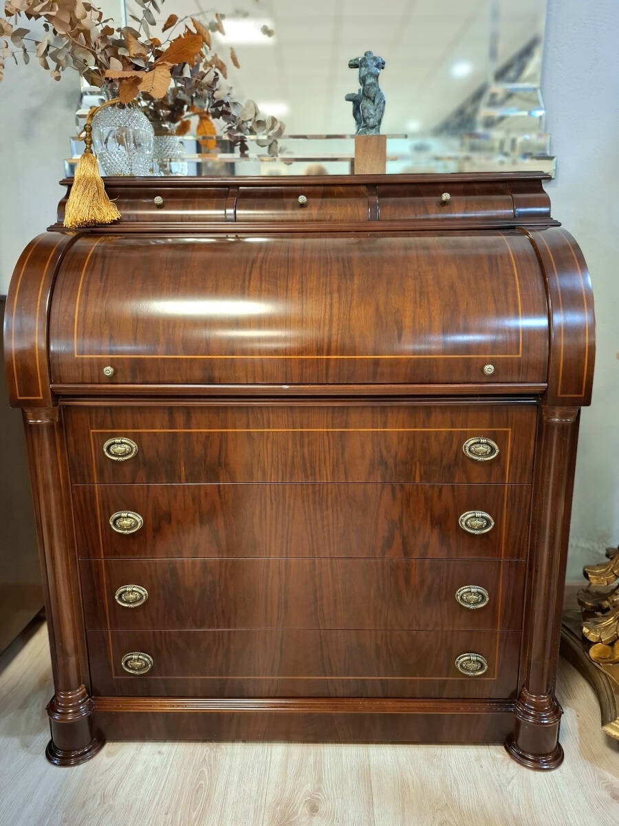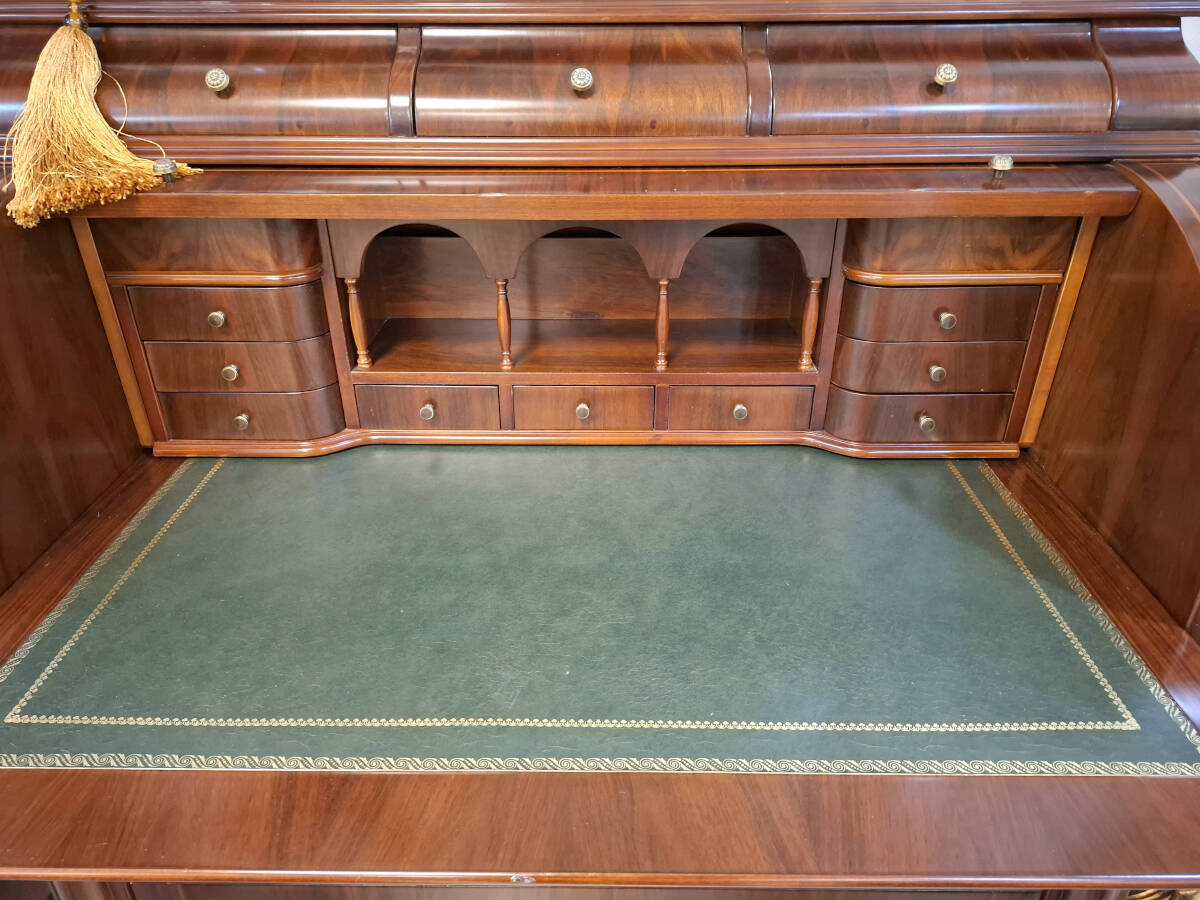 La parte superior del buró está compuesta por un tambor curvado que oculta un práctico escritorio, con tapa extraíble forrada en piel color verde carruaje, finamente rematada con grecas decorativas. Al abrirlo, revela un refinado interior con varios cajoncillos y un hueco con barandillas, perfecto para mantener organizados documentos u objetos personales.