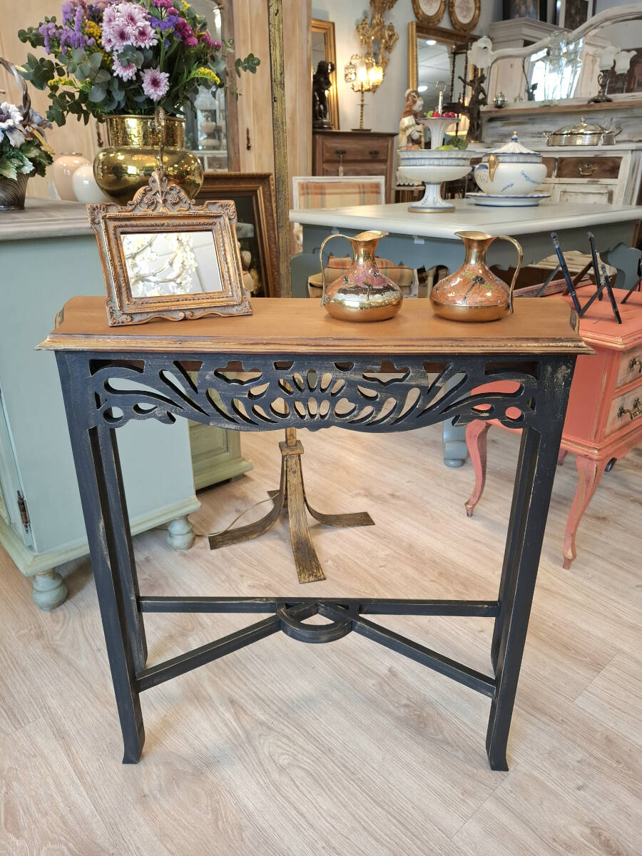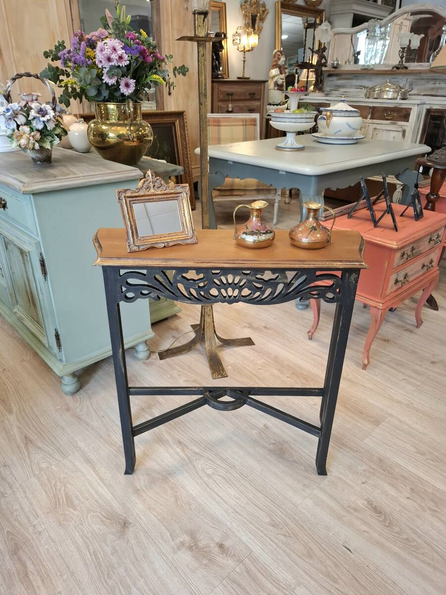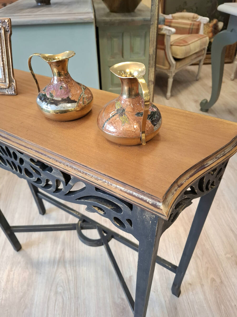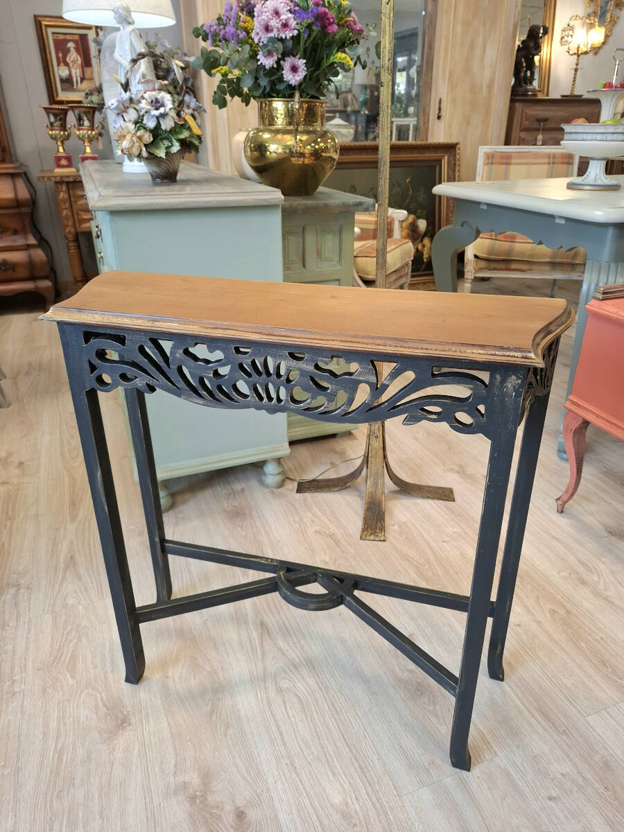 Mesa consola de madera renovada en un elegante color negro, con delicadas pinceladas doradas que aportan un toque cómodo. El sobre en madera natural, realza su belleza con una textura cálida y auténtica. Una pieza ideal para recibidores pequeños y pasillos.